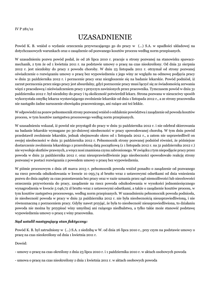 IV P 281/12 UZASADNIENIE Powód K. B. wniósł o wydanie orzeczenia przywracającego go do pracy w (...) S.A. w upadłości układowej na dotychczasowych warunkach oraz o zasądzenie od pozwanego kosztów procesu według norm przepisanych. W uzasadnieniu pozwu powód podał, że od 26 lipca 2010 r. pracuje u strony pozwanej na stanowisku spawaczmechanik, z tym że od 1 kwietnia 2011 r. na podstawie umowy o pracę na czas nieokreślony. Od dnia 31 sierpnia 2012 r. jest niezdolny do pracy z powodu choroby. W dniu 23 listopada 2011 r. otrzymał od strony pozwanej oświadczenie o rozwiązaniu umowy o pracę bez wypowiedzenia z jego winy ze względu na odmowę podjęcia pracy w dniu 31 października 2012 r. i porzucenie pracy oraz niezgłoszenie się na badanie lekarskie. Powód podniósł, iż zarzut porzucenia przez niego pracy jest absurdalny, gdyż porzucenie pracy musi łączyć się ze świadomością zerwania więzi z pracodawcą i nieświadczeniem pracy z przyczyn zawinionych przez pracownika. Tymczasem powód w dniu 31 października 2012 r. był niezdolny do pracy i tą okoliczność potwierdził lekarz. Strona pozwana w nieuczciwy sposób wykorzystała omyłkę lekarza wystawiającego zwolnienie lekarskie od dnia 1 listopada 2012 r., a ze strony pracownika nie nastąpiło żadne naruszenie obowiązku pracowniczego, ani rażące ani też lekkie. W odpowiedzi na pozew pełnomocnik strony pozwanej wniósł o oddalenie powództwa i zasądzenie od powoda kosztów procesu, w tym kosztów zastępstwa procesowego według norm przepisanych. W uzasadnieniu wskazał, iż powód nie przystąpił do pracy w dniu 31 października 2012 r. i nie odebrał skierowania na badanie lekarskie wymagane po 30-dniowej nieobecności w pracy spowodowanej chorobą. W tym dniu powód przedstawił zwolnienie lekarskie, jednak obejmowało okres od 1 listopada 2012 r., a zatem nie usprawiedliwił on swojej nieobecności w dniu 31 października 2012 r. Pełnomocnik strony pozwanej podniósł również, że późniejsze dostarczenie zwolnienia lekarskiego z przerobioną datą początkową (z 1 listopada 2012 r. na 31 października 2012 r.) nie wywołuje skutków prawnych, a wręcz nosi znamiona czynu zabronionego. W związku z tym niepodjęcie pracy przez powoda w dniu 31 października 2012 r. oraz nieusprawiedliwienie jego nieobecności spowodowało reakcję strony pozwanej w postaci rozwiązania z powodem umowy o pracę bez wypowiedzenia. W piśmie procesowym z dnia 28 marca 2013 r. pełnomocnik powoda wniósł ponadto o zasądzenie od pozwanego na rzecz powoda odszkodowania w kwocie 10 093,74 zł brutto wraz z ustawowymi odsetkami od dnia wniesienia pozwu do dnia zapłaty za czas pozostawania bez pracy oraz w razie uznania przez sąd niemożliwości lub niecelowości orzeczenia przywrócenia do pracy, zasądzenie na rzecz powoda odszkodowania w wysokości jednomiesięcznego wynagrodzenia w kwocie 5 046,72 zł brutto wraz z ustawowymi odsetkami, a także o zasądzenie kosztów procesu, w tym kosztów zastępstwa procesowego, według norm przepisanych. W uzasadnieniu pełnomocnik powoda podniosła, że nieobecność powoda w pracy w dniu 31 października 2012 r. nie była nieobecnością nieusprawiedliwioną, i nie równoznaczną z porzuceniem pracy. Gdyby nawet przyjąć, że była to nieobecność nieusprawiedliwiona, to działaniu powoda nie można by przypisać winy umyślnej ani rażącego niedbalstwa, a tylko takie może stanowić podstawę wypowiedzenia umowy o pracę z winy pracownika. Sąd ustalił następujący stan faktyczny: Powód K. B. był zatrudniony w (...) S.A. z siedzibą w W. od dnia 26 lipca 2010 r., przy czym na podstawie umowy o pracę na czas nieokreślony od dnia 1 kwietnia 2011 r. Dowód: - umowy o pracę na czas określony z dnia 23 lipca 2010 r. i 1 października 2010 r. w aktach osobowych powoda - umowa o pracę na czas nieokreślony z dnia 1 kwietnia 2011 r. w aktach osobowych powoda Powód był zatrudniony na stanowisku spawacz- mechanik. Do jego obowiązków należało: przeglądy, konserwacja i usuwanie drobnych usterek maszyn i urządzeń, uzupełnianie i wymiana olejów smarowych i przekładniowych w podzespołach maszyn i urządzeń, regenerowanie części do maszyn i urządzeń ulegających szybkiemu zużyciu, przestrzeganie ustalonego porządku i dyscypliny pracy oraz tajemnicy służbowej i gospodarczej, a także wykonywanie innych zadań na polecenie przełożonego. Dowód: • karta stanowiska pracy w aktach osobowych powoda W dniu 31 sierpnia 2012 roku powodowi zostały wręczone do wyboru dwa oświadczenia: o wypowiedzeniu umowy o pracę oraz porozumienie zmieniające warunki płacy i pracy. Pracownica działu kadr K. Z. oraz P. M. wyjaśnili powodowi przyczyny sporządzenia takich oświadczeń. Po zapoznaniu się z ich treścią powód odmówił ich podpisania i poprosił o krótki czas na podjęcie decyzji dotyczącej wyboru pomiędzy zaproponowanymi przez pracodawcę rozwiązaniami. Dowód: • notatka urzędowa z dnia 12listopada 2012 r. w aktach osobowych powoda Od dnia 31 sierpnia 2012 r. powód przebywał na zwolnieniu lekarskim z powodu uszkodzenia nerwu łokciowego i problemów z barkiem. W dniu 30 października 2012 r. w związku z kończącym się zwolnieniem lekarskim kierownik powoda- P. L. zwrócił się do niego telefonicznie, aby zgłosił się następnego dnia do zakładu pracy i odebrał przygotowane dla niego skierowanie do lekarza medycyny pracy. Powód odpowiedział, że przyjdzie nazajutrz oraz, że ma w tym dniu wizytę u lekarza i jeżeli lekarz uzna, że jest zdolny do pracy, to wróci do pracy, a jeżeli nie, to będzie w dalszym ciągu przebywał na zwolnieniu lekarskim. Dowód: - zeznania świadka P. L. k. 83-83v, - przesłuchanie powoda k. 135v-136. W dniu 31 października 2012 r. powód zgłosił się do lekarza E. J., która stwierdziła, że jest on w dalszym ciągu niezdolny do pracy i wystawiła mu kolejne zwolnienie lekarskie. Zwolnienie 