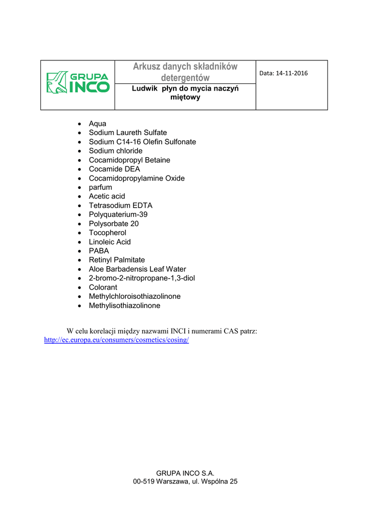 Arkusz danych składników detergentów Ludwik płyn do mycia naczyń miętowy Aqua Sodium Laureth Sulfate Sodium C14-16 Olefin Sulfonate Sodium chloride Cocamidopropyl Betaine Cocamide DEA Cocamidopropylamine Oxide parfum Acetic acid Tetrasodium EDTA Polyquaterium-39 Polysorbate 20 Tocopherol Linoleic Acid PABA Retinyl Palmitate Aloe Barbadensis Leaf Water 2-bromo-2-nitropropane-1,3-diol Colorant Methylchloroisothiazolinone Methylisothiazolinone W celu korelacji między nazwami INCI i numerami CAS patrz: http://ec.europa.eu/consumers/cosmetics/cosing/ GRUPA INCO S.A. 00-519 Warszawa, ul. Wspólna 25 Data: 14-11-2016