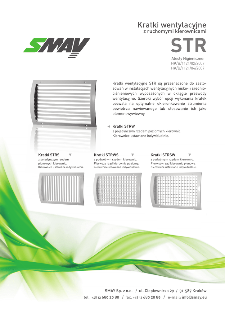 Kratki wentylacyjne z ruchomymi kierownicami STR Atesty Higieniczne: HK/B/1121/02/2007 HK/B/1121/04/2007 Kratki wentylacyjne STR s¹ przeznaczone do zastosowañ w instalacjach wentylacyjnych nisko- i œredniociœnieniowych wyposa¿onych w okr¹g³e przewody wentylacyjne. Szeroki wybór opcji wykonania kratek pozwala na optymalne ukierunkowanie strumienia powietrza nawiewanego lub stosowanie ich jako element wywiewny. Kratki STRW z pojedynczym rzêdem poziomych kierownic. Kierownice ustawiane indywidualnie. Kratki STRS Kratki STRWS Kratki STRSW z pojedynczym rzêdem pionowych kierownic. z podwójnym rzêdem kierownic. Pierwszy rz¹d kierownic poziomy. z podwójnym rzêdem kierownic. Pierwszy rz¹d kierownic pionowy. Kierownice ustawiane indywidualnie. Kierownice ustawiane indywidualnie. Kierownice ustawiane indywidualnie. y SMAY Sp. z o.o. / ul. Ciep³ownicza 29 / 31-587 Kraków tel. +48 12 680 20 80 / fax. +48 12 680 20 89 / e-mail: [email protected] Kratki wentylacyjne STR Wykonanie Ramka kratki jest wykonana ze stali. Kierownice s¹ ruchome i w wersji standardowej wykonane z aluminium. Wykoñczenie standardowe obejmuje lakierowanie na kolor bia³y RAL9010. Na zamówienie mo¿liwe jest lakierowanie na inny kolor RAL. Konstrukcja ramki i kierownic x - zale¿ne od œrednicy przewodu wentylacyjnego Dobór wysokoœci D kratek dla ø d kana³ów ød Dmax [mm] [mm] ≤160 75 200 125 250 125 315 225 400 225 500 325 630 325 800 425 Wymiary STRW STRWS STRS STRSW 32 wersja 5.2.6 Wymiary, powierzchnie czynne, masa kratek STR Poni¿ej podano standardowe wymiary kratek. Na ¿yczenie Zamawiaj¹cego mo¿liwe jest wykonanie kratek w wymiarze innym ni¿ standardowy. Gdzie: C - szerokoœæ otworu monta¿owego w mm D - wysokoœæ otworu monta¿owego w mm 2 Aeff - powierzchnia czynna w m Masa - waga kratki w kg wersja 5.2.6 STRW STRS STRSW STRWS STRW STRS STRSW STRWS Aeff Aeff Aeff Masa Masa Masa 2 m2 m2 kg kg kg 0,0029 0,0029 0,0022 0,2 0,2 0,3 C D [mm] [mm] m 75 75 125 75 0,0053 0,0055 0,0042 0,2 0,3 0,4 225 75 0,0101 0,0103 0,0078 0,4 0,4 0,6 325 75 0,0149 0,0152 0,0115 0,5 0,5 0,8 425 75 0,0197 0,0200 0,0152 0,6 0,6 1,1 525 75 0,0245 0,0249 0,0188 0,7 0,8 1,3 625 75 0,0293 0,0298 0,0225 0,8 0,9 1,5 825 75 0,0385 0,0395 0,0294 1,0 1,1 1,9 1025 1225 125 225 325 425 525 625 825 1025 1225 225 325 425 525 625 825 1025 1225 325 425 525 625 825 1025 1225 425 525 625 825 1025 1225 75 75 125 125 125 125 125 125 125 125 125 225 225 225 225 225 225 225 225 325 325 325 325 325 325 325 425 425 425 425 425 425 0,0481 0,0492 0,0367 2,0 1,4 2,6 0,0577 0,5890 0,0440 2,4 1,8 3,1 0,0100 0,0100 0,0078 0,3 0,3 0,6 0,0190 0,0188 0,0147 0,5 0,5 0,9 0,0280 0,0277 0,0215 0,7 0,7 1,2 0,0370 0,0460 0,0365 0,0454 0,0284 0,0353 0,8 1,0 0,9 1,0 1,5 1,8 0,0550 0,0543 0,0421 1,1 1,2 2,1 0,0722 0,0720 0,0551 1,4 1,5 2,9 0,0902 0,1082 0,0897 0,1074 0,0688 0,0825 2,5 3,0 2,0 2,3 3,3 3,9 0,0358 0,0358 0,0275 0,8 0,7 1,4 0,0528 0,0698 0,0527 0,0695 0,0404 0,0533 1,0 1,3 1,0 1,3 1,9 2,4 0,0868 0,0864 0,0661 1,6 1,5 3,1 0,1038 0,1033 0,0790 1,9 1,9 3,6 0,1364 0,1704 0,1370 0,1707 0,1033 0,1290 2,4 3,6 2,4 3,0 4,6 4,7 0,2044 0,2044 0,1547 4,2 3,5 5,6 0,0777 0,1027 0,0777 0,1025 0,0593 0,0781 1,4 1,9 1,4 1,8 2,7 3,5 0,1277 0,1527 0,1274 0,1523 0,0970 0,1158 2,3 2,6 2,2 2,5 4,2 4,9 0,2006 0,2506 0,2020 0,2517 0,1515 0,1892 3,3 4,6 3,2 4,0 6,1 6,4 0,3006 0,3014 0,2269 5,5 4,7 7,2 0,1355 0,1685 0,1355 0,1684 0,1030 0,1278 2,4 2,8 2,2 2,7 4,4 5,3 0,2015 0,2648 0,2013 0,2670 0,1527 0,1997 3,3 4,2 3,1 4,0 6,2 7,5 0,3308 0,3327 0,2494 5,7 4,9 8,2 0,3968 0,3984 0,2991 6,7 5,9 8,9 33 Dobór STR Nomogramy przedstawiaj¹ce charakterystykê hydrauliczn¹ i akustyczn¹ kratek znajduj¹ siê na stronie 443. Akcesoria i sposób zamówienia STR Przy zamówieniu nale¿y podaæ informacje wed³ug poni¿szego sposobu: <TYP KRATKI> - <C>x<D> - <S> - <P><RAL> / <ADD> Gdzie: <TYP KRATKI> <C> <D> <S> <P> <RAL> <ADD> - STRW, STRWS, STRS lub STRSW - szerokoœæ otworu monta¿owego w mm - wysokoœæ otworu monta¿owego w mm - œrednica przewodu wentylacyjnego w mm - wykoñczenie: * SL – stal lakierowana - kolor wg palety RAL - w tym miejscu nale¿y okreœliæ akcesoria dodatkowe jak poni¿ej: Akcesoria ** <GA> <GS> <GC> <GM> <GT> <LO1> <LO2> - przepustnica przeciwbie¿na z aluminium - przepustnica wspó³bie¿na ze stali ocynkowanej - przepustnica uchylna - przepustnica ³ukowa - przepustnica szczelinowa - deflektor sitowy o powierzchni czynnej 38% przekroju - deflektor sitowy o powierzchni czynnej 58% przekroju * wartoœci opcjonalne, w przypadku ich nie podania zostan¹ zastosowane wartoœci domyœlne ** wiêcej informacji o akcesoriach na stronie 233 w rozdziale V Przyk³ad zamówienia: STRW – 525x225 – 315 – SL9010 / GM 34 wersja 5.2.6