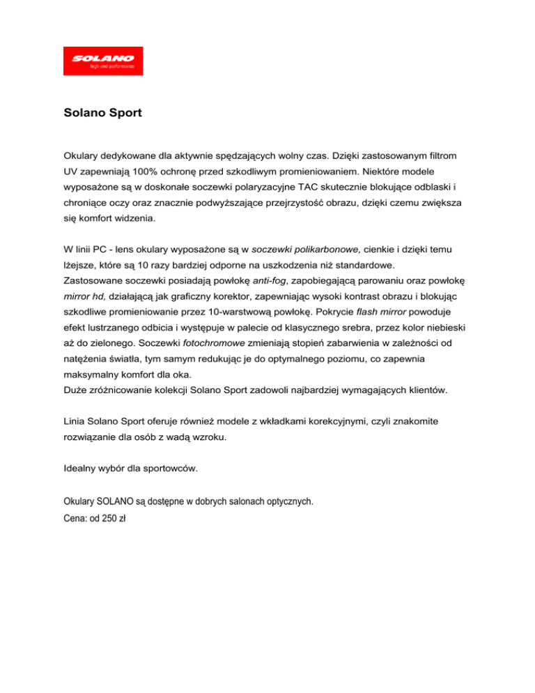 Solano Sport Okulary dedykowane dla aktywnie spędzających wolny czas. Dzięki zastosowanym filtrom UV zapewniają 100% ochronę przed szkodliwym promieniowaniem. Niektóre modele wyposażone są w doskonałe soczewki polaryzacyjne TAC skutecznie blokujące odblaski i chroniące oczy oraz znacznie podwyższające przejrzystość obrazu, dzięki czemu zwiększa się komfort widzenia. W linii PC - lens okulary wyposażone są w soczewki polikarbonowe, cienkie i dzięki temu lżejsze, które są 10 razy bardziej odporne na uszkodzenia niż standardowe. Zastosowane soczewki posiadają powłokę anti-fog, zapobiegającą parowaniu oraz powłokę mirror hd, działającą jak graficzny korektor, zapewniając wysoki kontrast obrazu i blokując szkodliwe promieniowanie przez 10-warstwową powłokę. Pokrycie flash mirror powoduje efekt lustrzanego odbicia i występuje w palecie od klasycznego srebra, przez kolor niebieski aż do zielonego. Soczewki fotochromowe zmieniają stopień zabarwienia w zależności od natężenia światła, tym samym redukując je do optymalnego poziomu, co zapewnia maksymalny komfort dla oka. Duże zróżnicowanie kolekcji Solano Sport zadowoli najbardziej wymagających klientów. Linia Solano Sport oferuje również modele z wkładkami korekcyjnymi, czyli znakomite rozwiązanie dla osób z wadą wzroku. Idealny wybór dla sportowców. Okulary SOLANO są dostępne w dobrych salonach optycznych. Cena: od 250 zł