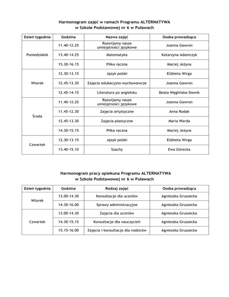 Harmonogram zajęć w ramach Programu ALTERNATYWA w Szkole Podstawowej nr 6 w Puławach Dzień tygodnia Poniedziałek Wtorek Godzina Nazwa zajęć Osoba prowadząca 11.40-12.25 Rozwijamy nasze umiejętności językowe Joanna Gawron 13.40-14.25 Matematyka Katarzyna Adamczyk 15.30-16.15 Piłka ręczna Maciej Jeżyna 12.30-13.15 Język polski Elżbieta Wirga 12.45-13.30 Zajęcia edukacyjno-wychowawcze Joanna Gawron 12.45-14.15 Literatura po angielsku Beata Węglińska-Słowik 11.40-12.25 Rozwijamy nasze umiejętności językowe Joanna Gawron 11.45-12.30 Zajęcia artystyczne Anna Rodak 12.45-13.30 Zajęcia plastyczne Maria Warda 14.30-15.15 Piłka ręczna Maciej Jeżyna 12.30-13.15 Język polski Elżbieta Wirga 13.40-15.10 Szachy Ewa Górecka Środa Czwartek Harmonogram pracy opiekuna Programu ALTERNATYWA w Szkole Podstawowej nr 6 w Puławach Dzień tygodnia Godzina Rodzaj zajęć Osoba prowadząca 13.00-14.30 Konsultacje dla uczniów Agnieszka Gruszecka 14.30-16.00 Sprawy administracyjne Agnieszka Gruszecka 13.00-14.30 Zajęcia dla uczniów Agnieszka Gruszecka 14.30-15.15 Konsultacje dla nauczycieli Agnieszka Gruszecka 15.15-16.00 Zajęcia i konsultacje dla rodziców Agnieszka Gruszecka Wtorek Czwartek