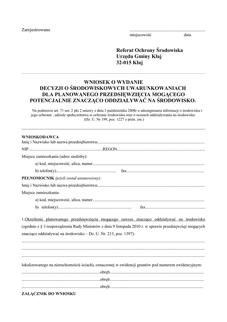 Zarejestrowano .................................................................. miejscowość dnia Referat Ochrony Środowiska Urzędu Gminy Kłaj 32-015 Kłaj WNIOSEK O WYDANIE DECYZJI O ŚRODOWISKOWYCH UWARUNKOWANIACH DLA PLANOWANEGO PRZEDSIĘWZIĘCIA MOGĄCEGO POTENCJALNIE ZNACZĄCO ODDZIAŁYWAĆ NA ŚRODOWISKO. Na podstawie art. 71 ust. 2 pkt 2 ustawy z dnia 3 października 2008r o udostępnianiu informacji o środowisku i jego ochronie , udziale społeczeństwa w ochronie środowiska oraz o ocenach oddziaływania na środowisko (Dz. U. Nr 199, poz. 1227 z późn. zm.) WNIOSKODAWCA Imię i Nazwisko lub nazwa przedsiębiorstwa:...................................................................................................... NIP.......................................................................REGON.................................................................................... Miejsce zamieszkania (adres siedziby): a) kod, miejscowość, ulica, numer........................................................................................................... b) telefon(y)......................................................... fax.......................................................................... PEŁNOMOCNIK (jeżeli został ustanowiony): Imię i Nazwisko lub nazwa przedsiębiorstwa:...................................................................................................... Miejsce zamieszkania: a) kod, miejscowość, ulica, numer........................................................................................................... b) telefon(y)...................................................................... fax......................................................... 1.Określenie planowanego przedsięwzięcia mogącego zawsze znacząco oddziaływać na środowisko (zgodnie z § 3 rozporządzenia Rady Ministrów z dnia 9 listopada 2010 r. w sprawie przedsięwzięć mogących znacząco oddziaływać na środowisko – Dz. U. Nr. 213, poz. 1397): ............................................................................................................................................................................... ............................................................................................................................................................................... ............................................................................................................................................................................... lokalizowanego na nieruchomości(-ściach), oznaczonej w ewidencji gruntów pod numerem ewidencyjnym: ...........................................................................obręb.......................................................................................... ...........................................................................obręb.......................................................................................... ...........................................................................obręb......................................................................................... ZAŁĄCZNIK DO WNIOSKU Lp. NAZWA ZAŁĄCZNIKA 1. Karta informacyjna przedsięwzięcia, (3x) wraz z jej zapisem w formie elektronicznej na informatycznym nośniku danych (x3) zawierająca podstawowe informacje o planowanym przedsięwzięciu,w szczególności dane o: a) rodzaju, skali i usytuowaniu przedsięwzięcia, b)powierzchni zajmowanej nieruchomości, a także obiektu budowlanego oraz dotychczasowym sposobie ich wykorzystywania i pokryciu nieruchomości szatą roślinną, c) rodzaju technologii, d)ewentualnych wariantach przedsięwzięcia, e)przewidywanej ilości wykorzystywanej wody, surowców, materiałów, paliw oraz energii, f)rozwiązaniach chroniących środowisko, g)rodzajach i przewidywanej ilości wprowadzanych do środowiska substancji lub energii przy zastosowaniu rozwiązań chroniących środowisko, h)możliwym transgranicznym oddziaływaniu na środowisko, i)obszarach podlegających ochronie na podstawie ustawy z dnia 16 kwietnia 2004 r.o ochronie przyrody, znajdujących się w zasięgu znaczącego oddziaływania przedsięwzięcia. 2. Poświadczona przez właściwy organ kopia mapy ewidencyjnej (w trzech egzemplarzach) obejmująca przewidywany teren, na którym będzie realizowane przedsięwzięcie oraz obejmująca obszar na który będzie oddziaływać przedsięwzięcie . 3. W przypadku przedsięwzięć wymagających koncesji na poszukiwanie lub rozpoznawanie złóż kopalin, na wydobywanie kopalin ze złóż, na bezzbiornikowe magazynowanie substancji oraz składowanie odpadów w górotworze, a także decyzji określającej szczegółowe warunki wydobywania kopaliny, prowadzonych w granicach przestrzeni niestanowiącej części składowej nieruchomości gruntowej oraz przedsięwzięć dotyczących urządzeń piętrzących I, II, i III klasy budowli, zamiast kopii mapy, o której mowa w pkt. 2 – mapę sytuacyjnowysokościową sporządzoną w skali umożliwiającej szczegółowe przedstawienie przebiegu granic terenu, którego dotyczy wniosek, oraz obejmującą obszar, na który będzie oddziaływać przedsięwzięcie (3x). 4. Wypis i wyrys z miejscowego planu zagospodarowania przestrzennego, jeżeli plan został uchwalony . 5. Wypis z ewidencji gruntów obejmujący przewidywany teren, na którym będzie realizowane przedsięwzięcie oraz obejmujący obszar, na który będzie oddziaływać przedsięwzięcie. - Jeżeli liczba stron w postępowaniu o wydanie decyzji o środowiskowych uwarunkowaniach przekracza 20, dla przedsięwzięć mogących zawsze znacząco oddziaływać na środowisko oraz dla przedsięwzięć mogących potencjalnie znacząco oddziaływać na środowisko, dla których stwierdzono obowiązek przeprowadzenia oceny oddziaływania na środowisko ,wypis z rejestru gruntów przedkłada się wraz z raportem o oddziaływaniu przedsięwzięcia na śro