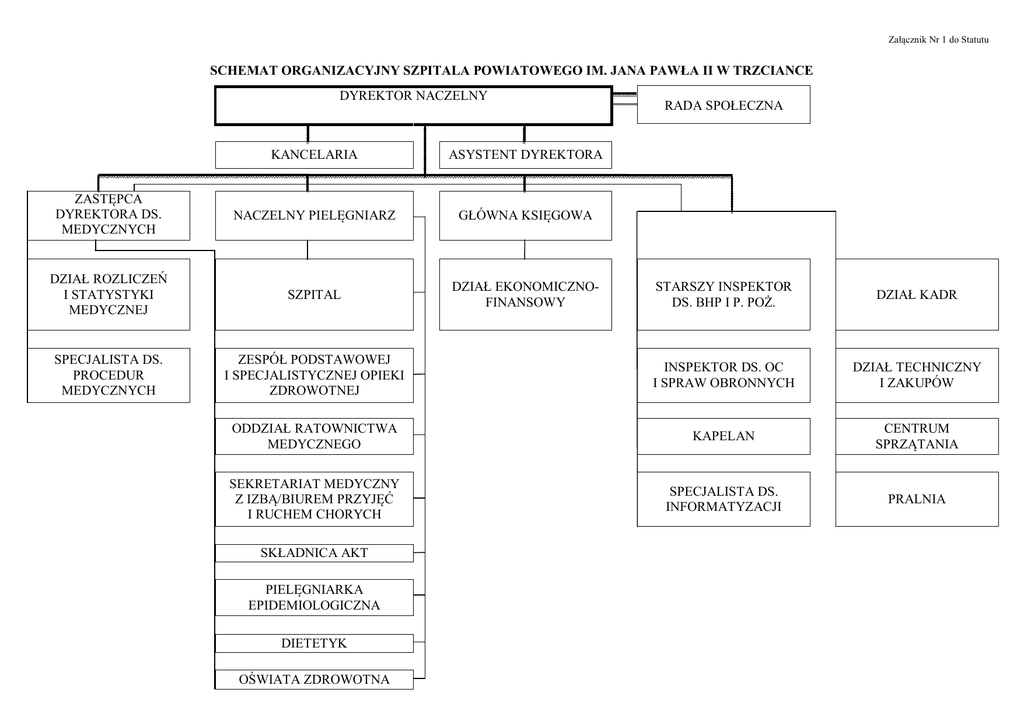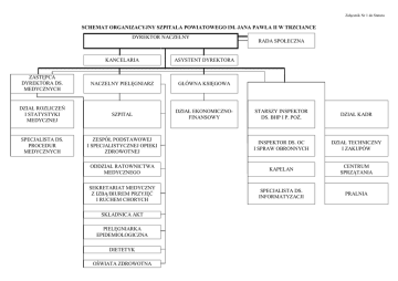 Załącznik Nr 1 do Statutu SCHEMAT ORGANIZACYJNY SZPITALA POWIATOWEGO IM. JANA PAWŁA II W TRZCIANCE DYREKTOR NACZELNY KANCELARIA ASYSTENT DYREKTORA ZASTĘPCA DYREKTORA DS. MEDYCZNYCH NACZELNY PIELĘGNIARZ GŁÓWNA KSIĘGOWA DZIAŁ ROZLICZEŃ I STATYSTYKI MEDYCZNEJ SZPITAL DZIAŁ EKONOMICZNOFINANSOWY SPECJALISTA DS. PROCEDUR MEDYCZNYCH RADA SPOŁECZNA STARSZY INSPEKTOR DS. BHP I P. POŻ. DZIAŁ KADR ZESPÓŁ PODSTAWOWEJ I SPECJALISTYCZNEJ OPIEKI ZDROWOTNEJ INSPEKTOR DS. OC I SPRAW OBRONNYCH DZIAŁ TECHNICZNY I ZAKUPÓW ODDZIAŁ RATOWNICTWA MEDYCZNEGO KAPELAN CENTRUM SPRZĄTANIA SEKRETARIAT MEDYCZNY Z IZBĄ/BIUREM PRZYJĘĆ I RUCHEM CHORYCH SPECJALISTA DS. INFORMATYZACJI PRALNIA SKŁADNICA AKT PIELĘGNIARKA EPIDEMIOLOGICZNA DIETETYK OŚWIATA ZDROWOTNA