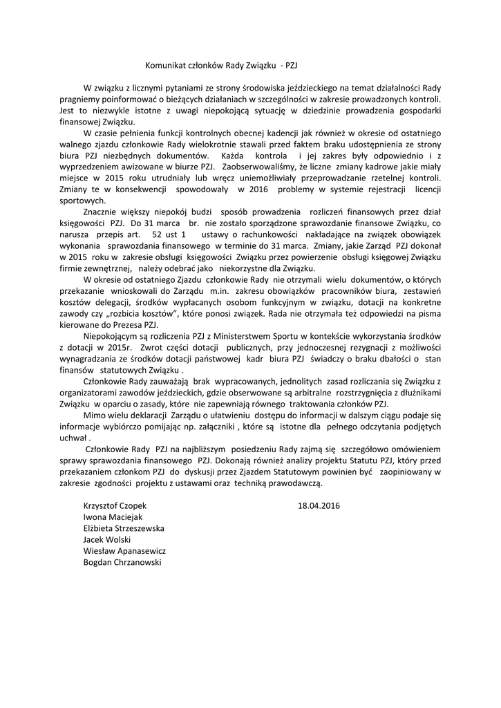 Komunikat członków Rady Związku - PZJ W związku z licznymi pytaniami ze strony środowiska jeździeckiego na temat działalności Rady pragniemy poinformować o bieżących działaniach w szczególności w zakresie prowadzonych kontroli. Jest to niezwykle istotne z uwagi niepokojącą sytuację w dziedzinie prowadzenia gospodarki finansowej Związku. W czasie pełnienia funkcji kontrolnych obecnej kadencji jak również w okresie od ostatniego walnego zjazdu członkowie Rady wielokrotnie stawali przed faktem braku udostępnienia ze strony biura PZJ niezbędnych dokumentów. Każda kontrola i jej zakres były odpowiednio i z wyprzedzeniem awizowane w biurze PZJ. Zaobserwowaliśmy, że liczne zmiany kadrowe jakie miały miejsce w 2015 roku utrudniały lub wręcz uniemożliwiały przeprowadzanie rzetelnej kontroli. Zmiany te w konsekwencji spowodowały w 2016 problemy w systemie rejestracji licencji sportowych. Znacznie większy niepokój budzi sposób prowadzenia rozliczeń finansowych przez dział księgowości PZJ. Do 31 marca br. nie zostało sporządzone sprawozdanie finansowe Związku, co narusza przepis art. 52 ust 1 ustawy o rachunkowości nakładające na związek obowiązek wykonania sprawozdania finansowego w terminie do 31 marca. Zmiany, jakie Zarząd PZJ dokonał w 2015 roku w zakresie obsługi księgowości Związku przez powierzenie obsługi księgowej Związku firmie zewnętrznej, należy odebrać jako niekorzystne dla Związku. W okresie od ostatniego Zjazdu członkowie Rady nie otrzymali wielu dokumentów, o których przekazanie wnioskowali do Zarządu m.in. zakresu obowiązków pracowników biura, zestawień kosztów delegacji, środków wypłacanych osobom funkcyjnym w związku, dotacji na konkretne zawody czy „rozbicia kosztów”, które ponosi związek. Rada nie otrzymała też odpowiedzi na pisma kierowane do Prezesa PZJ. Niepokojącym są rozliczenia PZJ z Ministerstwem Sportu w kontekście wykorzystania środków z dotacji w 2015r. Zwrot części dotacji publicznych, przy jednoczesnej rezygnacji z możliwości wynagradzania ze środków dotacji państwowej kadr biura PZJ świadczy o braku dbałości o stan finansów statutowych Związku . Członkowie Rady zauważają brak wypracowanych, jednolitych zasad rozliczania się Związku z organizatorami zawodów jeździeckich, gdzie obserwowane są arbitralne rozstrzygnięcia z dłużnikami Związku w oparciu o zasady, które nie zapewniają równego traktowania członków PZJ. Mimo wielu deklaracji Zarządu o ułatwieniu dostępu do informacji w dalszym ciągu podaje się informacje wybiórczo pomijając np. załączniki , które są istotne dla pełnego odczytania podjętych uchwał . Członkowie Rady PZJ na najbliższym posiedzeniu Rady zajmą się szczegółowo omówieniem sprawy sprawozdania finansowego PZJ. Dokonają również analizy projektu Statutu PZJ, który przed przekazaniem członkom PZJ do dyskusji przez Zjazdem Statutowym powinien być zaopiniowany w zakresie zgodności projektu z ustawami oraz techniką prawodawczą. Krzysztof Czopek Iwona Maciejak Elżbieta Strzeszewska Jacek Wolski Wiesław Apanasewicz Bogdan Chrzanowski 18.04.2016