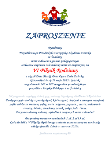ZAPROSZENIE Dyrektorzy Niepublicznego Przedszkola Europejska Akademia Dziecka w Świdnicy wraz z dziećmi i gronem pedagogicznym serdecznie zaprasza całe rodziny wraz ze znajomymi, na VI Piknik Rodzinny z okazji Dnia Matki, Dnia Ojca i Dnia Dziecka, który odbędzie się 29 maja 2015r. (piątek) w godzinach 1400 – 1800 w ogrodzie przedszkolnym przy Placu Wojska Polskiego 4 w Świdnicy Do dyspozycji - stoiska z przekąskami, kiełbaskami, ciepłymi i zimnymi napojami, pajda chleba ze smalcem, gofry, wata cukrowa, popcorn, , ciasta, malowanie twarzy, loteria, dmuchany zamek, pokaz judo i inne. Przyprowadzamy rodzinę, sąsiadów i znajomych wraz z dziećmi! Przynosimy monety o nominałach 1 zł, 2 zł i 5 zł. Cały dochód z V Pikniku Rodzinnego zostanie przeznaczony na wycieczkę edukacyjną dla dzieci w czerwcu 2015r.