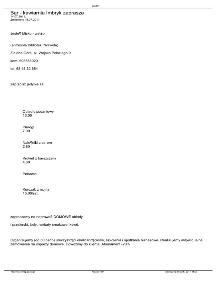WiMBP Bar - kawiarnia Imbryk zaprasza 14.07.2011. Zmieniony 15.07.2011. Jeste¶ blisko - wst±p (antresola Biblioteki Norwida) Zielona Góra, al. Wojska Polskiego 9 kom. 693666020 tel. 68 45 32 654 zap³acisz jedynie za: Obiad dwudaniowy 13,00 Pierogi 7,00 Nale¶niki z serem 2,80 Krokiet z barszczem 4,00 Ponadto: Kurczak z ro¿na 15,00/szt. zapraszamy na naprawdê DOMOWE obiady i przek±ski, lody, herbaty smakowe, kawê, Organizujemy (do 50 osób) uroczysto¶ci okoliczno¶ciowe, szkolenia i spotkania biznesowe. Realizujemy indywidualne zamówienia na imprezy domowe. Dowozimy do klienta. Abonament -20% http://old.wimbp.zgora.pl Kreator PDF Utworzono 8 March, 2017, 18:03