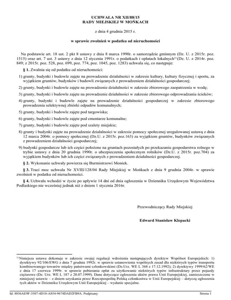 UCHWAŁA NR XII/88/15 RADY MIEJSKIEJ W MOŃKACH z dnia 4 grudnia 2015 r. w sprawie zwolnień w podatku od nieruchomości Na podstawie art. 18 ust. 2 pkt 8 ustawy z dnia 8 marca 1990r. o samorządzie gminnym (Dz. U. z 2015r. poz. 1515) oraz art. 7 ust. 3 ustawy z dnia 12 stycznia 1991r. o podatkach i opłatach lokalnych1) (Dz. U. z 2014r. poz. 849; z 2015r. poz. 528, poz. 699, poz. 774, poz. 1045, poz. 1283) uchwala się, co następuje: § 1. Zwalnia się od podatku od nieruchomości: 1) grunty, budynki i budowle zajęte na prowadzenie działalności w zakresie kultury, kultury fizycznej i sportu, za wyjątkiem gruntów, budynków i budowli związanych z prowadzeniem działalności gospodarczej; 2) grunty, budynki i budowle zajęte na prowadzenie działalności w zakresie zbiorowego zaopatrzenia w wodę; 3) grunty, budynki i budowle zajęte na prowadzenie działalności w zakresie zbiorowego odprowadzania ścieków; 4) grunty, budynki i budowle zajęte na prowadzenie działalności gospodarczej w zakresie zbiorowego prowadzenia selektywnej zbiórki odpadów komunalnych; 5) grunty, budynki i budowle zajęte pod targowiska; 6) grunty, budynki i budowle zajęte pod cmentarze komunalne; 7) grunty, budynki i budowle zajęte pod szalety miejskie; 8) grunty i budynki zajęte na prowadzenie działalności w zakresie pomocy społecznej uregulowanej ustawą z dnia 12 marca 2004r. o pomocy społecznej (Dz.U. z 2015r. poz.163) za wyjątkiem gruntów, budynków związanych z prowadzeniem działalności gospodarczej; 9) budynki gospodarcze lub ich części położone na gruntach pozostałych po przekazaniu gospodarstwa rolnego w trybie ustawy z dnia 20 grudnia 1990r. o ubezpieczeniu społecznym rolników (Dz.U. z 2015r. poz.704) za wyjątkiem budynków lub ich części związanych z prowadzeniem działalności gospodarczej. § 2. Wykonanie uchwały powierza się Burmistrzowi Moniek. § 3. Traci moc uchwala Nr XVIII/128/04 Rady Miejskiej w Mońkach z dnia 9 grudnia 2004r. w sprawie zwolnień w podatku od nieruchomości. § 4. Uchwała wchodzi w życie po upływie 14 dni od dnia ogłoszenia w Dzienniku Urzędowym Województwa Podlaskiego nie wcześniej jednak niż z dniem 1 stycznia 2016r. Przewodniczący Rady Miejskiej Edward Stanisław Klepacki 1) Niniejsza ustawa dokonuje w zakresie swojej regulacji wdrożenia następujących dyrektyw Wspólnot Europejskich: 1) dyrektywy 92/106/EWG z dnia 7 grudnia 1992r. w sprawie ustanowienia wspólnych zasad dla niektórych typów transportu kombinowanego towarów między państwami członkowskimi (Dz.Urz. WE L 368 z 17.12.1992); 2) dyrektywy 1999/62/WE z dnia 17 czerwca 1999r. w sprawie pobierania opłat za użytkowanie niektórych typów infrastruktury przez pojazdy ciężarowe (Dz. Urz. WE L 187 z 20.07.1999). Dane dotyczące ogłoszenia aktów prawa Unii Europejskiej, zamieszczone w niniejszej ustawie – z dniem uzyskania przez Rzeczpospolitą Polską członkostwa w Unii Europejskiej – dotyczą ogłoszenia tych aktów w Dzienniku Urzędowym Unii Europejskiej – wydanie specjalne. Id: 8856AE9F-3507-4D18-A854-9674DAD2FB9A. Podpisany Strona 1