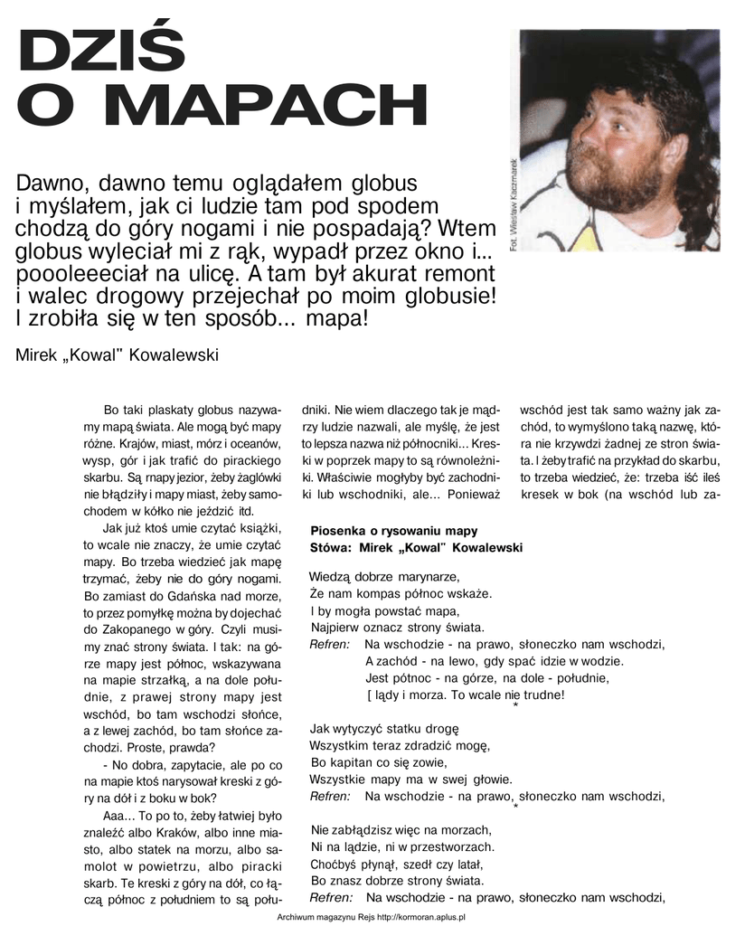DZIŚ O MAPACH Dawno, dawno temu oglądałem globus i myślałem, jak ci ludzie tam pod spodem chodzą do góry nogami i nie pospadają? Wtem globus wyleciał mi z rąk, wypadł przez okno i... poooleeeciał na ulicę. A tam był akurat remont i walec drogowy przejechał po moim globusie! l zrobiła się w ten sposób... mapa! Mirek „Kowal" Kowalewski Bo taki plaskaty globus nazywamy mapą świata. Ale mogą być mapy różne. Krajów, miast, mórz i oceanów, wysp, gór i jak trafić do pirackiego skarbu. Są rnapy jezior, żeby żaglówki nie błądziły i mapy miast, żeby samochodem w kółko nie jeździć itd. Jak już ktoś umie czytać książki, to wcale nie znaczy, że umie czytać mapy. Bo trzeba wiedzieć jak mapę trzymać, żeby nie do góry nogami. Bo zamiast do Gdańska nad morze, to przez pomyłkę można by dojechać do Zakopanego w góry. Czyli musimy znać strony świata. l tak: na górze mapy jest północ, wskazywana na mapie strzałką, a na dole południe, z prawej strony mapy jest wschód, bo tam wschodzi słońce, a z lewej zachód, bo tam słońce zachodzi. Proste, prawda? - No dobra, zapytacie, ale po co na mapie ktoś narysował kreski z góry na dół i z boku w bok? Aaa... To po to, żeby łatwiej było znaleźć albo Kraków, albo inne miasto, albo statek na morzu, albo samolot w powietrzu, albo piracki skarb. Te kreski z góry na dół, co łączą północ z południem to są połu- dniki. Nie wiem dlaczego tak je mądrzy ludzie nazwali, ale myślę, że jest to lepsza nazwa niż północniki... Kreski w poprzek mapy to są równoleżniki. Właściwie mogłyby być zachodniki lub wschodniki, ale... Ponieważ wschód jest tak samo ważny jak zachód, to wymyślono taką nazwę, która nie krzywdzi żadnej ze stron świata. l żeby trafić na przykład do skarbu, to trzeba wiedzieć, że: trzeba iść ileś kresek w bok (na wschód lub za- Piosenka o rysowaniu mapy Stówa: Mirek „Kowal" Kowalewski Wiedzą dobrze marynarze, Że nam kompas północ wskaże. l by mogła powstać mapa, Najpierw oznacz strony świata. Refren: Na wschodzie - na prawo, słoneczko nam wschodzi, A zachód - na lewo, gdy spać idzie w wodzie. Jest pótnoc - na górze, na dole - południe, [ lądy i morza. To wcale nie trudne! * Jak wytyczyć statku drogę Wszystkim teraz zdradzić mogę, Bo kapitan co się zowie, Wszystkie mapy ma w swej głowie. Refren: Na wschodzie - na prawo, słoneczko nam wschodzi, * Nie zabłądzisz więc na morzach, Ni na lądzie, ni w przestworzach. Choćbyś płynął, szedł czy latał, Bo znasz dobrze strony świata. Refren: Na wschodzie - na prawo, słoneczko nam wschodzi, Archiwum magazynu Rejs http://kormoran.aplus.pl chód) i ileś kresek w do) lub w górę (na pótnoc lub południe). Tak można znaleźć skarb, miasto, statek, góry, rzeki i co tam tylko chcemy. Bez map to dzisiaj ani rusz! Nie mogLyby latać samoloty, pływać statki, jeździć samochody. Bez mapy zgubilibyśmy się w obcym mieście, zabłądzilibyśmy w górach i w ogóle... Plaskaty globus to mapa świata. Ale to nie znaczy, że jakby nadmuchać mapę, to byłby zaraz globus. Bo jakoś nikt jeszcze nie wymyślił globusa np. Warszawy... A może Warn się uda? Archiwum magazynu Rejs http://kormoran.aplus.pl
