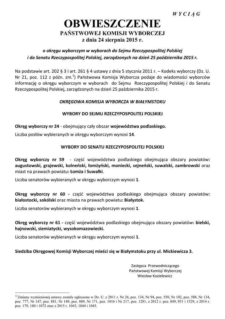 WYCIĄG OBWIESZCZENIE PAŃSTWOWEJ KOMISJI WYBORCZEJ z dnia 24 sierpnia 2015 r. o okręgu wyborczym w wyborach do Sejmu Rzeczypospolitej Polskiej i do Senatu Rzeczypospolitej Polskiej, zarządzonych na dzień 25 października 2015 r. Na podstawie art. 202 § 3 i art. 261 § 4 ustawy z dnia 5 stycznia 2011 r. – Kodeks wyborczy (Dz. U. Nr 21, poz. 112 z późn. zm.1) Państwowa Komisja Wyborcza podaje do wiadomości wyborców informację o okręgu wyborczym w wyborach do Sejmu Rzeczypospolitej Polskiej i do Senatu Rzeczypospolitej Polskiej, zarządzonych na dzień 25 października 2015 r. OKRĘGOWA KOMISJA WYBORCZA W BIAŁYMSTOKU WYBORY DO SEJMU RZECZYPOSPOLITEJ POLSKIEJ Okręg wyborczy nr 24 - obejmujący cały obszar województwa podlaskiego. Liczba posłów wybieranych w okręgu wyborczym wynosi 14. WYBORY DO SENATU RZECZYPOSPOLITEJ POLSKIEJ Okręg wyborczy nr 59 - część województwa podlaskiego obejmująca obszary powiatów: augustowski, grajewski, kolneński, łomżyński, moniecki, sejneński, suwalski, zambrowski oraz miast na prawach powiatu: Łomża i Suwałki. Liczba senatorów wybieranych w okręgu wyborczym wynosi 1. Okręg wyborczy nr 60 - część województwa podlaskiego obejmująca obszary powiatów: białostocki, sokólski oraz miasta na prawach powiatu: Białystok. Liczba senatorów wybieranych w okręgu wyborczym wynosi 1. Okręg wyborczy nr 61 - część województwa podlaskiego obejmująca obszary powiatów: bielski, hajnowski, siemiatycki, wysokomazowiecki. Liczba senatorów wybieranych w okręgu wyborczym wynosi 1. Siedziba Okręgowej Komisji Wyborczej mieści się w Białymstoku przy ul. Mickiewicza 3. Zastępca Przewodniczącego Państwowej Komisji Wyborczej Wiesław Kozielewicz 1) Zmiany wymienionej ustawy zostały ogłoszone w Dz. U. z 2011 r. Nr 26, poz. 134, Nr 94, poz. 550, Nr 102, poz. 588, Nr 134, poz. 777, Nr 147, poz. 881, Nr 149, poz. 889, Nr 171, poz. 1016 i Nr 217, poz. 1281, z 2012 r. poz. 849, 951 i 1529, z 2014 r. poz. 179, 180 i 1072 oraz z 2015 r. 1043, 1044 i 1045.