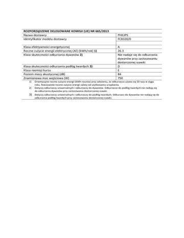 ROZPORZĄDZENIE DELEGOWANE KOMISJI (UE) NR 665/2013 Nazwa dostawcy Identyfikator modelu dostawcy Klasa efektywności energetycznej Roczne zużycie energii elektrycznej (AE) [kWh/rok] 1) Klasa skuteczności odkurzania dywanów 2) Klasa skuteczności odkurzania podłóg twardych 3) Klasa reemisji kurzu Poziom mocy akustycznej (dB) Znamionowa moc wejściowa (W) 1) 2) 3) PHILIPS FC8320/0 A 26.3 Nie nadaje się do odkurzania dywanów przy zastosowaniu dostarczonej ssawki D E 84 750 Orientacyjne roczne zużycie energii (kWh rocznie) przy założeniu, że odkurzacza używa się 50 razy w ciągu roku. Rzeczywiste roczne zużycie energii zależy od użytkowania urządzenia. Dotyczy odkurzaczy uniwersalnych i odkurzaczy do dywanów. Odkurzacze do podłóg twardych nie nadają się do odkurzania dywanów przy zastosowaniu dostarczonej ssawki. Dotyczy odkurzaczy uniwersalnych i odkurzaczy do podłóg twardych. Odkurzacz do dywanów nie nadają się do odkurzania podłóg twardych przy zastosowaniu dostarczonej ssawki.