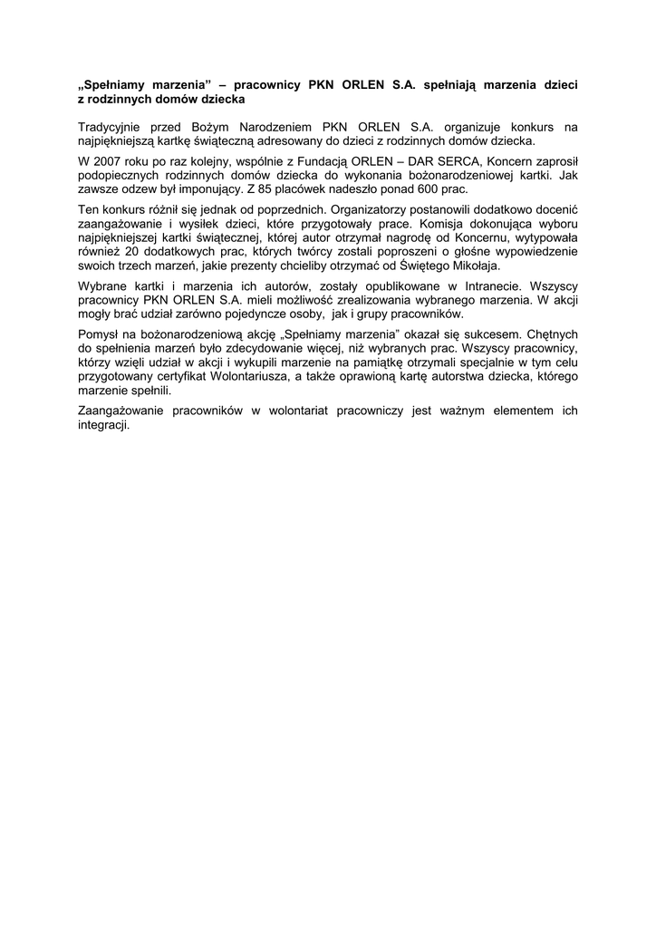 „Spełniamy marzenia” – pracownicy PKN ORLEN S.A. spełniają marzenia dzieci z rodzinnych domów dziecka Tradycyjnie przed BoŜym Narodzeniem PKN ORLEN S.A. organizuje konkurs na najpiękniejszą kartkę świąteczną adresowany do dzieci z rodzinnych domów dziecka. W 2007 roku po raz kolejny, wspólnie z Fundacją ORLEN – DAR SERCA, Koncern zaprosił podopiecznych rodzinnych domów dziecka do wykonania boŜonarodzeniowej kartki. Jak zawsze odzew był imponujący. Z 85 placówek nadeszło ponad 600 prac. Ten konkurs róŜnił się jednak od poprzednich. Organizatorzy postanowili dodatkowo docenić zaangaŜowanie i wysiłek dzieci, które przygotowały prace. Komisja dokonująca wyboru najpiękniejszej kartki świątecznej, której autor otrzymał nagrodę od Koncernu, wytypowała równieŜ 20 dodatkowych prac, których twórcy zostali poproszeni o głośne wypowiedzenie swoich trzech marzeń, jakie prezenty chcieliby otrzymać od Świętego Mikołaja. Wybrane kartki i marzenia ich autorów, zostały opublikowane w Intranecie. Wszyscy pracownicy PKN ORLEN S.A. mieli moŜliwość zrealizowania wybranego marzenia. W akcji mogły brać udział zarówno pojedyncze osoby, jak i grupy pracowników. Pomysł na boŜonarodzeniową akcję „Spełniamy marzenia” okazał się sukcesem. Chętnych do spełnienia marzeń było zdecydowanie więcej, niŜ wybranych prac. Wszyscy pracownicy, którzy wzięli udział w akcji i wykupili marzenie na pamiątkę otrzymali specjalnie w tym celu przygotowany certyfikat Wolontariusza, a takŜe oprawioną kartę autorstwa dziecka, którego marzenie spełnili. ZaangaŜowanie pracowników w wolontariat pracowniczy jest waŜnym elementem ich integracji.