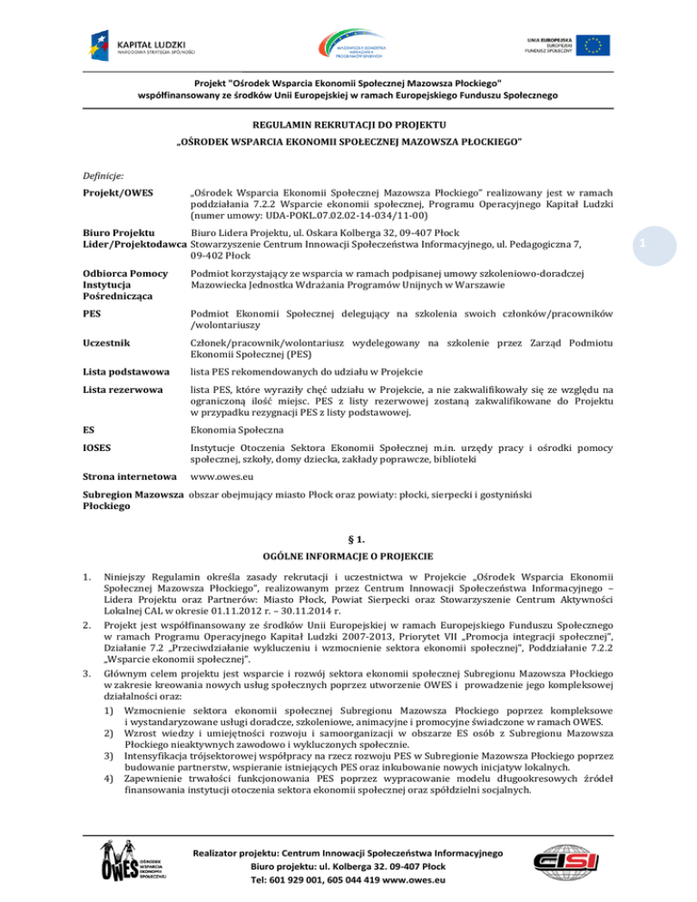 Projekt "Ośrodek Wsparcia Ekonomii Społecznej Mazowsza Płockiego" współfinansowany ze środków Unii Europejskiej w ramach Europejskiego Funduszu Społecznego REGULAMIN REKRUTACJI DO PROJEKTU „OŚRODEK WSPARCIA EKONOMII SPOŁECZNEJ MAZOWSZA PŁOCKIEGO” Definicje: Projekt/OWES „Ośrodek Wsparcia Ekonomii Społecznej Mazowsza Płockiego” realizowany jest w ramach poddziałania 7.2.2 Wsparcie ekonomii społecznej, Programu Operacyjnego Kapitał Ludzki (numer umowy: UDA-POKL.07.02.02-14-034/11-00) Biuro Projektu Biuro Lidera Projektu, ul. Oskara Kolberga 32, 09-407 Płock Lider/Projektodawca Stowarzyszenie Centrum Innowacji Społeczeństwa Informacyjnego, ul. Pedagogiczna 7, 09-402 Płock Odbiorca Pomocy Instytucja Pośrednicząca Podmiot korzystający ze wsparcia w ramach podpisanej umowy szkoleniowo-doradczej Mazowiecka Jednostka Wdrażania Programów Unijnych w Warszawie PES Podmiot Ekonomii Społecznej delegujący na szkolenia swoich członków/pracowników /wolontariuszy Uczestnik Członek/pracownik/wolontariusz wydelegowany na szkolenie przez Zarząd Podmiotu Ekonomii Społecznej (PES) Lista podstawowa lista PES rekomendowanych do udziału w Projekcie Lista rezerwowa lista PES, które wyraziły chęć udziału w Projekcie, a nie zakwalifikowały się ze względu na ograniczoną ilość miejsc. PES z listy rezerwowej zostaną zakwalifikowane do Projektu w przypadku rezygnacji PES z listy podstawowej. ES Ekonomia Społeczna IOSES Instytucje Otoczenia Sektora Ekonomii Społecznej m.in. urzędy pracy i ośrodki pomocy społecznej, szkoły, domy dziecka, zakłady poprawcze, biblioteki Strona internetowa www.owes.eu Subregion Mazowsza obszar obejmujący miasto Płock oraz powiaty: płocki, sierpecki i gostyniński Płockiego § 1. OGÓLNE INFORMACJE O PROJEKCIE 1. Niniejszy Regulamin określa zasady rekrutacji i uczestnictwa w Projekcie „Ośrodek Wsparcia Ekonomii Społecznej Mazowsza Płockiego”, realizowanym przez Centrum Innowacji Społeczeństwa Informacyjnego – Lidera Projektu oraz Partnerów: Miasto Płock, Powiat Sierpecki oraz Stowarzyszenie Centrum Aktywności Lokalnej CAL w okresie 01.11.2012 r. – 30.11.2014 r. 2. Projekt jest współfinansowany ze środków Unii Europejskiej w ramach Europejskiego Funduszu Społecznego w ramach Programu Operacyjnego Kapitał Ludzki 2007-2013, Priorytet VII „Promocja integracji społecznej”, Działanie 7.2 „Przeciwdziałanie wykluczeniu i wzmocnienie sektora ekonomii społecznej”, Poddziałanie 7.2.2 „Wsparcie ekonomii społecznej”. 3. Głównym celem projektu jest wsparcie i rozwój sektora ekonomii społecznej Subregionu Mazowsza Płockiego w zakresie kreowania nowych usług społecznych poprzez utworzenie OWES i prowadzenie jego kompleksowej działalności oraz: 1) Wzmocnienie sektora ekonomii społecznej Subregionu Mazowsza Płockiego poprzez kompleksowe i wystandaryzowane usługi doradcze, szkoleniowe, animacyjne i promocyjne świadczone w ramach OWES. 2) Wzrost wiedzy i umiejętności rozwoju i samoorganizacji w obszarze ES osób z Subregionu Mazowsza Płockiego nieaktywnych zawodowo i wykluczonych społecznie. 3) Intensyfikacja trójsektorowej współpracy na rzecz rozwoju PES w Subregionie Mazowsza Płockiego poprzez budowanie partnerstw, wspieranie istniejących PES oraz inkubowanie nowych inicjatyw lokalnych. 4) Zapewnienie trwałości funkcjonowania PES poprzez wypracowanie modelu długookresowych źródeł finansowania instytucji otoczenia sektora ekonomii społecznej oraz spółdzielni socjalnych. Realizator projektu: Centrum Innowacji Społeczeństwa Informacyjnego Biuro projektu: ul. Kolberga 32. 09-407 Płock Tel: 601 929 001, 605 044 419 www.owes.eu 1 Projekt "Ośrodek Wsparcia Ekonomii Społecznej Mazowsza Płockiego" współfinansowany ze środków Unii Europejskiej w ramach Europejskiego Funduszu Społecznego 4. W ramach projektu dla PES oferowane będą następujące formy wsparcia: - doradztwo (prawne, finansowo-księgowe, marketingowe), - szkolenia ogólne, - utworzenie i prowadzenie strony internetowej, - działania wspierające lokalne partnerstwa na rzecz ekonomii społecznej, promujące ekonomię społeczną (ES) i zatrudnienie w sektorze ES. § 2. UCZESTNICY PROJEKTU 2 1. Grupę docelową projektu stanowią: a) 2. 3. 4. 5. 6. 50 PES zarejestrowanych w Subregionie Mazowsza Płockiego, takich jak: spółdzielnie socjalne, spółdzielnie pracy, spółdzielnie inwalidów i niewidomych, Centra Integracji Społecznej, Kluby Integracji Społecznej, Zakłady Aktywności Zawodowej, Warsztaty Terapii Zajęciowej, organizacje pozarządowe oraz podmioty wymienione w art. 3 ust. 3 ustawy z 24 kwietnia 2003 r. o organizacjach pożytku publicznego i o wolontariacie, posiadające jednostkę organizacyjną na terenie Subregionu Mazowsza Płockiego. Zakłada się udział min. 150 Uczestników PES (w tym 90% kobiet ). b) 20 Instytucji Otoczenia Sektora Ekonomii Społecznej(IOSES), takich jak: instytucje rynku pracy, instytucje pomocy i integracji społecznej, jednostki samorządu terytorialnego, przedstawiciele lokalnych przedsiębiorstw i mediów posiadające siedzibę lub jednostkę organizacyjną na terenie Subregionu Mazowsza Płockiego. Zakłada się udział min. 60 osób fizycznych - pracowników IOSES (w tym 50% kobiet ). W Zadaniu Szkoła Liderów i Promocji Ekonomii Społecznej (II.2013- IX.2013) udział weźmie min. 30 PES nie prowadzących działalności gospodarczej, deklarujących zamiar jej rozpoczęcia. W Zadaniu Akademia Ekonomii Społecznej (IX 2013-IX 2014) wezmą udział PES prowadzące działalność gospodarczą. Udzielone PES wsparcie objęte zostanie pomocą publiczną. PES objęte wsparciem szkoleniowym i doradczym będą delegować do udziału w Projekcie Uczestników zgodnie z indywidualnymi potrzebami swojej organizacji. Wśród Uczestników delegowane będą osoby niepełnosprawne. Przewiduje się proporcjonalny udział liczby dostępnych miejsc szkoleniowych dla PES w ramach 4 o
