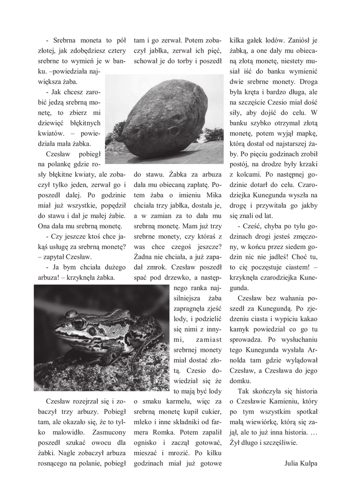 - Srebrna moneta to pół złotej, jak zdobędziesz cztery srebrne to wymień je w banku. –powiedziała największa żaba. - Jak chcesz zarobić jedzą srebrną monetę, to zbierz mi dziewięć błękitnych kwiatów. – powiedziała mała żabka. Czesław pobiegł na polankę gdzie rosły błękitne kwiaty, ale zobaczył tylko jeden, zerwał go i poszedł dalej. Po godzinie miał już wszystkie, popędził do stawu i dał je małej żabie. Ona dała mu srebrną monetę. - Czy jeszcze ktoś chce jakąś usługę za srebrną monetę? – zapytał Czesław. - Ja bym chciała dużego arbuza! – krzyknęła żabka. Czesław rozejrzał się i zobaczył trzy arbuzy. Pobiegł tam, ale okazało się, że to tylko malowidło. Zasmucony poszedł szukać owocu dla żabki. Nagle zobaczył arbuza rosnącego na polanie, pobiegł tam i go zerwał. Potem zobaczył jabłka, zerwał ich pięć, schował je do torby i poszedł do stawu. Żabka za arbuza dała mu obiecaną zapłatę. Potem żaba o imieniu Mika chciała trzy jabłka, dostała je, a w zamian za to dała mu srebrną monetę. Mam już trzy srebrne monety, czy któraś z was chce czegoś jeszcze? Żadna nie chciała, a już zapadał zmrok. Czesław poszedł spać pod drzewko, a następnego ranka najsilniejsza żaba zapragnęła zjeść lody, i podzielić się nimi z innymi, zamiast srebrnej monety miał dostać złotą. Czesio dowiedział się że to mają być lody o smaku karmelu, więc za srebrną monetę kupił cukier, mleko i inne składniki od farmera Romka. Potem zapalił ognisko i zaczął gotować, mieszać i mrozić. Po kilku godzinach miał już gotowe kilka gałek lodów. Zaniósł je żabką, a one dały mu obiecaną złotą monetę, niestety musiał iść do banku wymienić dwie srebrne monety. Droga była kręta i bardzo długa, ale na szczęście Czesio miał dość siły, aby dojść do celu. W banku szybko otrzymał złotą monetę, potem wyjął mapkę, którą dostał od najstarszej żaby. Po pięciu godzinach zrobił postój, na drodze były krzaki z kolcami. Po następnej godzinie dotarł do celu. Czarodziejka Kunegunda wyszła na drogę i przywitała go jakby się znali od lat. - Cześć, chyba po tylu godzinach drogi jesteś zmęczony, w końcu przez siedem godzin nic nie jadłeś! Choć tu, to cię poczęstuje ciastem! – krzyknęła czarodziejka Kunegunda. Czesław bez wahania poszedł za Kunegundą. Po zjedzeniu ciasta i wypiciu kakao kamyk powiedział co go tu sprowadza. Po wysłuchaniu tego Kunegunda wysłała Arnolda tam gdzie wylądował Czesław, a Czesława do jego domku. Tak skończyła się historia o Czesławie Kamieniu, który po tym wszystkim spotkał małą wiewiórkę, którą się zajął, ale to już inna historia. … Żył długo i szczęśliwie. Julia Kulpa