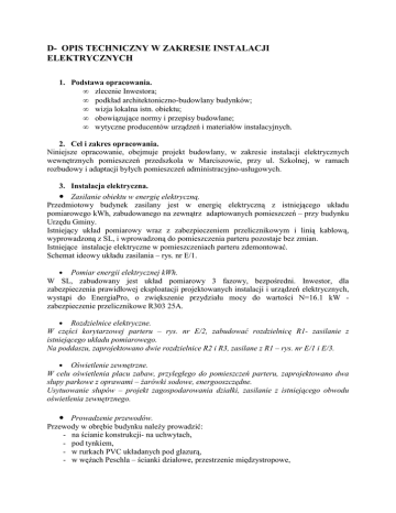 D- OPIS TECHNICZNY W ZAKRESIE INSTALACJI ELEKTRYCZNYCH 1. Podstawa opracowania. • zlecenie Inwestora; • podkład architektoniczno-budowlany budynków; • wizja lokalna istn. obiektu; • obowiązujące normy i przepisy budowlane; • wytyczne producentów urządzeń i materiałów instalacyjnych. 2. Cel i zakres opracowania. Niniejsze opracowanie, obejmuje projekt budowlany, w zakresie instalacji elektrycznych wewnętrznych pomieszczeń przedszkola w Marciszowie, przy ul. Szkolnej, w ramach rozbudowy i adaptacji byłych pomieszczeń administracyjno-usługowych. 3. Instalacja elektryczna. ● Zasilanie obiektu w energię elektryczną. Przedmiotowy budynek zasilany jest w energię elektryczną z istniejącego układu pomiarowego kWh, zabudowanego na zewnątrz adaptowanych pomieszczeń – przy budynku Urzędu Gminy. Istniejący układ pomiarowy wraz z zabezpieczeniem przelicznikowym i linią kablową, wyprowadzoną z SL, i wprowadzoną do pomieszczenia parteru pozostaje bez zmian. Istniejące instalacje elektryczne w pomieszczeniach parteru zdemontować. Schemat ideowy układu zasilania – rys. nr E/1. ● Pomiar energii elektrycznej kWh. W SL, zabudowany jest układ pomiarowy 3 fazowy, bezpośredni. Inwestor, dla zabezpieczenia prawidłowej eksploatacji projektowanych instalacji i urządzeń elektrycznych, wystąpi do EnergiaPro, o zwiększenie przydziału mocy do wartości N=16.1 kW zabezpieczenie przelicznikowe R303 25A. ● Rozdzielnice elektryczne. W części korytarzowej parteru – rys. nr E/2, zabudować rozdzielnicę R1- zasilanie z istniejącego układu pomiarowego. Na poddaszu, zaprojektowano dwie rozdzielnice R2 i R3, zasilane z R1 – rys. nr E/1 i E/3. ● Oświetlenie zewnętrzne. W celu oświetlenia placu zabaw, przyległego do pomieszczeń parteru, zaprojektowano dwa słupy parkowe z oprawami – Ŝarówki sodowe, energooszczędne. Usytuowanie słupów – projekt zagospodarowania działki, zasilanie z istniejącego obwodu oświetlenia zewnętrznego. ● Prowadzenie przewodów. Przewody w obrębie budynku naleŜy prowadzić: - na ścianie konstrukcji- na uchwytach, - pod tynkiem, - w rurkach PVC układanych pod glazurą, - w węŜach Peschla – ścianki działowe, przestrzenie międzystropowe, ● Przejścia przez przegrody budowlane. Przejścia przez przegrody budowlane powinny być wykonane w tulejach ochronnych cienkościennych z tworzyw sztucznych Średnica tulei powinna być dwukrotnie większa niŜ średnica przewodu. Przestrzeń pomiędzy tuleją a przewodem, powinna być wypełniona materiałem elastycznym (np. kit plastyczny) zapewniającym swobodny przesuw przewodu i nie działającym agresywnie na materiał przewodów. ● Wyłącznik p. poŜarowy- Główny Wyłącznik Prądu. W holu wejściowym parter, naleŜy zabudować GŁÓWNY WYŁĄCZNIK PRĄDU- dla pomieszczeń przedszkola. ● Instalacje oświetleniowe. Oświetlenie ogólne- oprawy świetlówkowe i Ŝarowe. Na drogach ewakuacyjnych , naleŜy zabudować oprawy oświetlenia ewakuacyjnego, wyposaŜone w 2 godzinny układ podtrzymania świecenia, przy zaniku zasilania . Część opraw pełniących funkcję oświetlenia awaryjnego, naleŜy wyposaŜyć w elektroinwertery- 2 godzinny układ podtrzymania świecenia, przy zaniku zasilania. Załączanie i wyłączanie oświetlenia – wyłącznikami pojedynczymi i świecznikowymi. • Wentylacja wyciągowa mechaniczna.. Wentylatory 1fazowe, w wydzielonych pomieszczeniach, zasilane- przewód YDY4*1.5, z ciągłą fazą, z obwodów oświetleniowych danych pomieszczeń. ● Przygotowanie ciepłej wody. Przewidziano przygotowanie c.w.u. za pośrednictwem elektrycznych pojemnościowych podgrzewaczy c.w.u. V=50-100l (1-faz., Q=1,5-2kW) zamontowanych nad umywalką. Elektryczne podgrzewacze zimnej wody -pojemnościowe, zasilane z wydzielonych obwodów elektrycznych. Podgrzewacze c.w.u. montować zgodnie ze wskazaniem producenta urządzenia. ● Układ oddymiania. W stropie klatki schodowej zaprojektowano klapę oddymiającą z napędem elektrycznym. Sterowanie pracą klapy – automatyczne - czujką dymu, umieszczoną na stropie klatki schodowej, ręczne – dla potrzeb wentylacji klatki schodowej- przyciskami zamykającymiotwierającymi- klatka schodowa parter, wyprowadzonymi z Centralki Oddymiania- RCO. Centralkę oddymiania, zbudować nad rozdzielnicą R1 – parter, zasilanie centralki oddymiania z R1- sprzed rozłącznika głównego. ● Przewody ,osprzęt, oprawy oświetleniowe. Przewody typu YDYo, YDYp- 750, obwody oświetleniowe – YDY 3,4,5 *1.5, obwody 1 fazowych gniazd wtykowych- YDY3*2.5, osprzęt p/t zwykły , w pomieszczeniach wilgotnych i na zewnątrz budynku bryzgoszczelny, rozdzielnice el.- wnękowe. Oprawy oświetleniowe kinkiety, plafoniery, z Ŝarówkami energooszczędnymi. ● Instalacja domofonowa. Przy głównych drzwiach wejściowych- parter, obok Głównego Wyłącznika Prądu, zaprojektowano kasetę domofonową, a w pomieszczeniach przedszkola- parter, poddasze, słuchawki domofonowe, główne drzwi wejściowe do przedszkola, wyposaŜyć w zamek elektromagnetyczny. ● Instalacja odgromowa. Budynek, z adaptowanymi pomieszczeniami dla potrzeb przedszkola, wyposaŜony jest w instalacje piorunochronną. ● Ochrona przepięciowa. W rozdzielnicy R1, jako ochronę przed przepięciami łączeniowymi i pochodzącymi od wyładowań atmosferycznych, zaprojektowano ograniczniki przepięciowe klasy B+C- dla kaŜdej z faz i dla przewodu N. ● Ochrona przeciwporaŜeniowa. Układ połączeń instalacji elektrycznych wewnętrznych – TN-S, ochrona przed poraŜeniem prądem elektrycznym: samoczynne wyłączenie zasilania, zrealizowana w oparciu o wyłączniki róŜnicowoprądowe i wyłączniki instalacyjne typu S. 4. Uwagi końcowe. ● Próby i odbiory instalacji. Po wykonaniu instalacji, przed wykonaniem tynków, zgodnie z Warunkami Technicznymi Wykonania i Odbioru Robót Budowlano-MontaŜowych, naleŜy przeprowadzić pomiary ciągłości Ŝył, oraz 