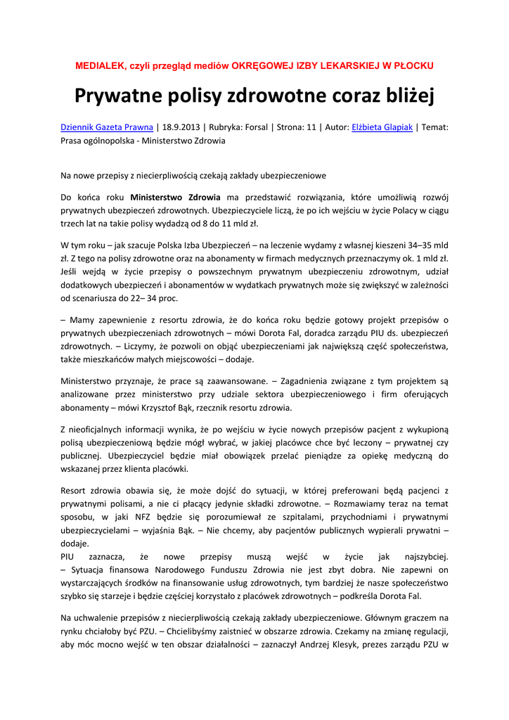 MEDIALEK, czyli przegląd mediów OKRĘGOWEJ IZBY LEKARSKIEJ W PŁOCKU Prywatne polisy zdrowotne coraz bliżej Dziennik Gazeta Prawna | 18.9.2013 | Rubryka: Forsal | Strona: 11 | Autor: Elżbieta Glapiak | Temat: Prasa ogólnopolska - Ministerstwo Zdrowia Na nowe przepisy z niecierpliwością czekają zakłady ubezpieczeniowe Do końca roku Ministerstwo Zdrowia ma przedstawić rozwiązania, które umożliwią rozwój prywatnych ubezpieczeń zdrowotnych. Ubezpieczyciele liczą, że po ich wejściu w życie Polacy w ciągu trzech lat na takie polisy wydadzą od 8 do 11 mld zł. W tym roku – jak szacuje Polska Izba Ubezpieczeń – na leczenie wydamy z własnej kieszeni 34–35 mld zł. Z tego na polisy zdrowotne oraz na abonamenty w firmach medycznych przeznaczymy ok. 1 mld zł. Jeśli wejdą w życie przepisy o powszechnym prywatnym ubezpieczeniu zdrowotnym, udział dodatkowych ubezpieczeń i abonamentów w wydatkach prywatnych może się zwiększyć w zależności od scenariusza do 22– 34 proc. – Mamy zapewnienie z resortu zdrowia, że do końca roku będzie gotowy projekt przepisów o prywatnych ubezpieczeniach zdrowotnych – mówi Dorota Fal, doradca zarządu PIU ds. ubezpieczeń zdrowotnych. – Liczymy, że pozwoli on objąć ubezpieczeniami jak największą część społeczeństwa, także mieszkańców małych miejscowości – dodaje. Ministerstwo przyznaje, że prace są zaawansowane. – Zagadnienia związane z tym projektem są analizowane przez ministerstwo przy udziale sektora ubezpieczeniowego i firm oferujących abonamenty – mówi Krzysztof Bąk, rzecznik resortu zdrowia. Z nieoficjalnych informacji wynika, że po wejściu w życie nowych przepisów pacjent z wykupioną polisą ubezpieczeniową będzie mógł wybrać, w jakiej placówce chce być leczony – prywatnej czy publicznej. Ubezpieczyciel będzie miał obowiązek przelać pieniądze za opiekę medyczną do wskazanej przez klienta placówki. Resort zdrowia obawia się, że może dojść do sytuacji, w której preferowani będą pacjenci z prywatnymi polisami, a nie ci płacący jedynie składki zdrowotne. – Rozmawiamy teraz na temat sposobu, w jaki NFZ będzie się porozumiewał ze szpitalami, przychodniami i prywatnymi ubezpieczycielami – wyjaśnia Bąk. – Nie chcemy, aby pacjentów publicznych wypierali prywatni – dodaje. PIU zaznacza, że nowe przepisy muszą wejść w życie jak najszybciej. – Sytuacja finansowa Narodowego Funduszu Zdrowia nie jest zbyt dobra. Nie zapewni on wystarczających środków na finansowanie usług zdrowotnych, tym bardziej że nasze społeczeństwo szybko się starzeje i będzie częściej korzystało z placówek zdrowotnych – podkreśla Dorota Fal. Na uchwalenie przepisów z niecierpliwością czekają zakłady ubezpieczeniowe. Głównym graczem na rynku chciałoby być PZU. – Chcielibyśmy zaistnieć w obszarze zdrowia. Czekamy na zmianę regulacji, aby móc mocno wejść w ten obszar działalności – zaznaczył Andrzej Klesyk, prezes zarządu PZU w rozmowie z DGP w Krynicy podczas Forum Europejskiego. W ocenie Aleksandry Polakowskiej Szymańskiej, dyrektor departamentu zarządzania produktami grupowymi w Axa Życie, nowe regulacje powinny wreszcie uporządkować rynek polis zdrowotnych, a także doprowadzić do ich rozpowszechnienia. – Szansę zaistnienia na rynku będą miały polisy masowe, wtedy możemy mówić o atrakcyjnym koszcie takiego produktu dla klienta – twierdzi Szymańska.