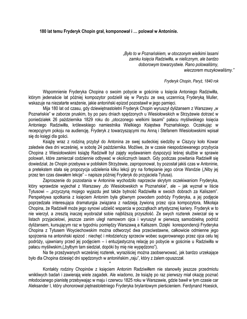 180 lat temu Fryderyk Chopin grał, komponował i … polował w Antoninie. „Było to w Poznańskiem, w otoczonym wielkimi lasami zamku księcia Radziwiłła, w nielicznym, ale bardzo doborowym towarzystwie. Rano polowaliśmy, wieczorem muzykowaliśmy.” Fryderyk Chopin, Paryż, 1840 rok Wspomnienie Fryderyka Chopina o swoim pobycie w gościnie u księcia Antoniego Radziwiłła, którym jedenaście lat później kompozytor podzielił się w Paryżu ze swą uczennicą Fryderyką Muller, wskazuje na niezatarte wrażenie, jakie antoniński epizod pozostawił w jego pamięci. Mija 180 lat od czasu, gdy dziewiętnastoletni Fryderyk Chopin wyruszył dyliżansem z Warszawy „w Poznańskie” w zaborze pruskim, by po paru dniach spędzonych u Wiesiołowskich w Strzyżewie dotrzeć w poniedziałek 26 października 1829 roku do „otoczonego wielkimi lasami” pałacu myśliwskiego księcia Antoniego Radziwiłła, królewskiego namiestnika Wielkiego Księstwa Poznańskiego. Oczekując w recepcyjnym pokoju na audiencję, Fryderyk z towarzyszącymi mu Anną i Stefanem Wiesiołowskimi wpisał się do księgi dla gości. Książę wraz z rodziną przybył do Antonina ze swej sudeckiej siedziby w Ciszycy koło Kowar zaledwie dwa dni wcześniej, w sobotę 24 października. Możliwe, że w czasie niespodziewanego przybycia Chopina z Wiesiołowskimi książę Radziwiłł był zajęty wydawaniem dyspozycji leśnej służbie w sprawie polowań, które zamierzał codziennie odbywać w okolicznych lasach. Gdy podczas powitania Radziwiłł się dowiedział, że Chopin przebywa w pobliskim Strzyżewie, zaproponował, by pozostał jakiś czas w Antoninie, a pretekstem stała się propozycja udzielenia kilku lekcji gry na fortepianie jego córce Wandzie („Niby jej przez ten czas dawałem lekcje” – napisze później Fryderyk do przyjaciela Tytusa). Zaproszenie do pozostania w Antoninie wychodziło naprzeciw skrytym oczekiwaniom Fryderyka, który wprawdzie wyjechał z Warszawy „do Wiesiołowskich w Poznańskie”, ale – jak wyznał w liście Tytusowi – „przyczyną mojego wyjazdu jest także bytność Radziwiłła w swoich dobrach za Kaliszem”. Perspektywa spotkania z księciem Antonim była głównym powodem podróży Fryderyka, a jej podjęcie poprzedzała interesująca dramaturgia związana z nadzieją żywioną przez ojca kompozytora, Mikołaja Chopina, że Radziwiłł może jego synowi udzielić wsparcia w początkach artystycznej kariery. Fryderyk w to nie wierzył, a zresztą inaczej wyobrażał sobie najbliższą przyszłość. Ze swych rozterek zwierzał się w listach przyjacielowi, jeszcze zanim uległ namowom ojca i wyruszył w pierwszą samodzielną podróż dyliżansem, kursującym raz w tygodniu pomiędzy Warszawą a Kaliszem. Dzięki korespondencji Fryderyka Chopina z Tytusem Woyciechowskim można odtworzyć dwa przeciwstawne, całkowicie odmienne jego spojrzenia na antoniński epizod : niechęć i młodzieńczy sprzeciw wobec sugerowanego przez ojca celu tej podróży, ujawniany przed jej podjęciem – i entuzjastyczną relację po pobycie w gościnie u Radziwiłła w pałacu myśliwskim,(„byłbym tam siedział, dopóki by mię nie wypędzono”). Na tle przeżywanych wcześniej rozterek, wyraziściej można zaobserwować, jak bardzo urzekające było dla Chopina dziesięć dni spędzonych w antonińskim „raju”, który z żalem opuszczał. * Kontakty rodziny Chopinów z księciem Antonim Radziwiłłem nie stanowiły jeszcze przedmiotu wnikliwych badań i zawierają wiele zagadek. Ale wiadomo, że książę po raz pierwszy miał okazję poznać młodocianego pianistę przebywając w maju i czerwcu 1825 roku w Warszawie, gdzie bawił w tym czasie car Aleksander I, który uhonorował piętnastoletniego Fryderyka brylantowym pierścieniem. Ferdynand Hoesick, biograf kompozytora, stwierdził: „Bawiąc w roku 1825 podczas obrad sejmowych przez kilka tygodni w Warszawie, książę [Radziwiłł] bardzo gorliwie zajął się młodym Chopinem, a że sam był znakomitym muzykiem, więc na jego zdaniu opartym na fachowej znajomości rzeczy, polegać było można. A przy tym i to należało brać pod uwagę – z czego też państwo Mikołajowie Chopinowie jasno zdawali sobie sprawę – że stosując się do rad takiego jak książę namiestnik wysokiego protektora, nie zagradzało się synowi drogi do kariery. A książę Antoni Radziwiłł bardzo nastawał na to, by Fryderyka nie odwodzić od jego ukochanej sztuki, przeciwnie, by go zachęcać w tym kierunku, dawać mu możność swobodnego rozwijania wrodzonych zdolności, bo zdolności te były całkiem wyjątkowe. Poznawszy się na nich – co zresztą nie było trudne – książę wyraził gotowość zaopiekowania się młodziutkim autorem Ronda c-moll, a że się temu rodzice Fryderyka nie myśleli sprzeciwiać, dziwić się temu nie podobna”. Po wielu dociekaniach doszedłem do wniosku, że to właśnie wówczas, w 1825 roku, miały miejsce „oświadczyny”, o których Fryderyk Chopin wspomina dopiero cztery lata później, w październiku 1829 roku, w dwóch listach do Tytusa Woyciechowskiego : „Prawda, że X. Radziwiłł, a raczej ona, bardzo grzeczna, zapraszali mnie do Berlina, dając nawet mieszkanie w własnym pałacu…” (list z 3 października) i „Były bowiem oświadczyny, żebym jechał do Berlina, w jego pałacu tamże mieszkał i tym podobne słówka, piękne, zabawne…” (list z 20 października, pisany w dniu wyjazdu do Strzyżewa i Antonina). Istniały bowiem okoliczności wskazujące na to, że po 1826 roku Radziwiłłowie z pewnością nie proponowaliby Chopinowi zamieszkania w swym pałacu przy Wilhelmstrasse w Berlinie, a więc musiało to nastąpić wcześniej! Otóż niemiecki historyk, wydawca korespondencji księżniczki Elizy Radziwiłłówny, Bruno Hennig stwierdził, że po „letniej katastrofie 1826 roku”, czyli po oficjalnym wyrzeczeniu się przez księcia Wilhelma zamiaru poślubi
