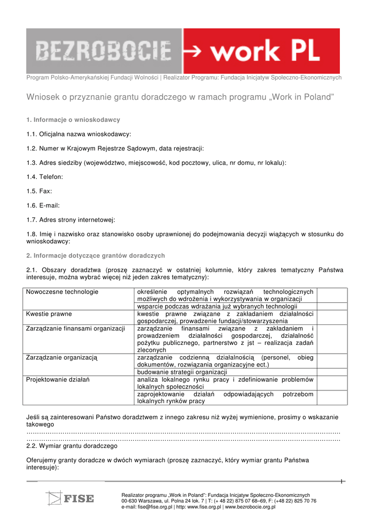 Program Polsko-Amerykańskiej Fundacji Wolności | Realizator Programu: Fundacja Inicjatyw Społeczno-Ekonomicznych Wniosek o przyznanie grantu doradczego w ramach programu „Work in Poland” 1. Informacje o wnioskodawcy 1.1. Oficjalna nazwa wnioskodawcy: 1.2. Numer w Krajowym Rejestrze Sądowym, data rejestracji: 1.3. Adres siedziby (województwo, miejscowość, kod pocztowy, ulica, nr domu, nr lokalu): 1.4. Telefon: 1.5. Fax: 1.6. E-mail: 1.7. Adres strony internetowej: 1.8. Imię i nazwisko oraz stanowisko osoby uprawnionej do podejmowania decyzji wiążących w stosunku do wnioskodawcy: 2. Informacje dotyczące grantów doradczych 2.1. Obszary doradztwa (proszę zaznaczyć w ostatniej kolumnie, który zakres tematyczny Państwa interesuje, można wybrać więcej niż jeden zakres tematyczny): Nowoczesne technologie Kwestie prawne Zarządzanie finansami organizacji Zarządzanie organizacją Projektowanie działań określenie optymalnych rozwiązań technologicznych możliwych do wdrożenia i wykorzystywania w organizacji wsparcie podczas wdrażania już wybranych technologii kwestie prawne związane z zakładaniem działalności gospodarczej, prowadzenie fundacji/stowarzyszenia zarządzanie finansami związane z zakładaniem i prowadzeniem działalności gospodarczej, działalność pożytku publicznego, partnerstwo z jst – realizacja zadań zleconych zarządzanie codzienną działalnością (personel, obieg dokumentów, rozwiązania organizacyjne ect.) budowanie strategii organizacji analiza lokalnego rynku pracy i zdefiniowanie problemów lokalnych społeczności zaprojektowanie działań odpowiadających potrzebom lokalnych rynków pracy Jeśli są zainteresowani Państwo doradztwem z innego zakresu niż wyżej wymienione, prosimy o wskazanie takowego …………………………………………………………………………………………………………………………………. …………………………………………………………………………………………………………………………………. 2.2. Wymiar grantu doradczego Oferujemy granty doradcze w dwóch wymiarach (proszę zaznaczyć, który wymiar grantu Państwa interesuje): 1 Realizator programu „Work in Poland”: Fundacja Inicjatyw Społeczno-Ekonomicznych 00-630 Warszawa, ul. Polna 24 lok. 7 | T: (+ 48 22) 875 07 68–69, F: (+48 22) 825 70 76 e-mail: [email protected] | http: www.fise.org.pl | www.bezrobocie.org.pl Program Polsko-Amerykańskiej Fundacji Wolności | Realizator Programu: Fundacja Inicjatyw Społeczno-Ekonomicznych 1 dzień (8 godzin) 2 dni (16 godzin) 2.3. Uzasadnienie wyboru zakresu tematycznego grantu doradczego 2.3.1. Czy grant doradczy ma wesprzeć codzienne funkcjonowanie organizacji (poprawić komunikację wewnątrz organizacji, określić kierunki działania etc.)? …………………………………………………………………………………………………………………………………. …………………………………………………………………………………………………………………………………. …………………………………………………………………………………………………………………………………. …………………………………………………………………………………………………………………………………. 2.3.2. Czy grant doradczy powiązany jest z konkretnym zadaniem realizowanym aktualnie (lub planowanym) przez organizację (np. założenie działalności gospodarczej, nawiązanie współpracy z instytucją samorządową)? …………………………………………………………………………………………………………………………………. …………………………………………………………………………………………………………………………………. …………………………………………………………………………………………………………………………………. …………………………………………………………………………………………………………………………………. 2.3.3. Czy organizacja ma doświadczenie w realizacji działań z wybranego zakresu tematycznego? Jeśli tak, jakie to doświadczenie (działanie w ramach projektu, ile czasu trwało, budżet przedsięwzięcia)? …………………………………………………………………………………………………………………………………. …………………………………………………………………………………………………………………………………. …………………………………………………………………………………………………………………………………. …………………………………………………………………………………………………………………………………. 2.3.4. Jakie problemy związane z działalnością identyfikuje organizacja w wybranym zakresie tematycznym? …………………………………………………………………………………………………………………………………. …………………………………………………………………………………………………………………………………. …………………………………………………………………………………………………………………………………. …………………………………………………………………………………………………………………………………. 2.3.5. Czy planując dotychczasową działalność władze organizacji sięgały po profesjonalne doradztwo? Jeśli tak, to w jakich dziedzinach? ………………………………………………………