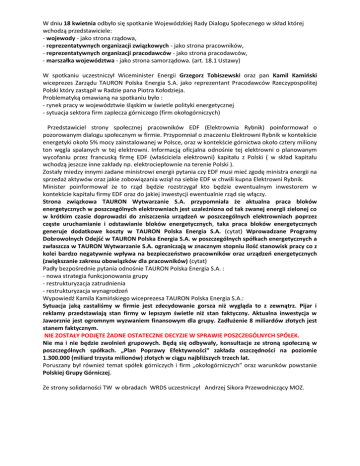 W dniu 18 kwietnia odbyło się spotkanie Wojewódzkiej Rady Dialogu Społecznego w skład której wchodzą przedstawiciele: - wojewody - jako strona rządowa, - reprezentatywnych organizacji związkowych - jako strona pracowników, - reprezentatywnych organizacji pracodawców - jako strona pracodawców, - marszałka województwa - jako strona samorządowa. (art. 18.1 Ustawy) W spotkaniu uczestniczył Wiceminister Energii Grzegorz Tobiszewski oraz pan Kamil Kamiński wiceprezes Zarządu TAURON Polska Energia S.A. jako reprezentant Pracodawców Rzeczypospolitej Polski który zastąpił w Radzie pana Piotra Kołodzieja. Problematyką omawianą na spotkaniu było : - rynek pracy w województwie śląskim w świetle polityki energetycznej - sytuacja sektora firm zaplecza górniczego (firm okołogórniczych) Przedstawiciel strony społecznej pracowników EDF (Elektrownia Rybnik) poinformował o pozorowanym dialogu społecznym w firmie. Przypomniał o znaczeniu Elektrowni Rybnik w kontekście energetyki około 5% mocy zainstalowanej w Polsce, oraz w kontekście górnictwa około cztery miliony ton węgla spalanych w tej elektrowni. Informacją oficjalna odnośnie tej elektrowni o planowanym wycofaniu przez francuską firmę EDF (właściciela elektrowni) kapitału z Polski ( w skład kapitału wchodzą jeszcze inne zakłady np. elektrociepłownie na terenie Polski ). Zostały miedzy innymi zadane ministrowi energii pytania czy EDF musi mieć zgodę ministra energii na sprzedaż aktywów oraz jakie zobowiązania wziął na siebie EDF w chwili kupna Elektrowni Rybnik. Minister poinformował że to rząd będzie rozstrzygał kto będzie ewentualnym inwestorem w kontekście kapitału firmy EDF oraz do jakiej inwestycji ewentualnie rząd się włączy. Strona związkowa TAURON Wytwarzanie S.A. przypomniała że aktualna praca bloków energetycznych w poszczególnych elektrowniach jest uzależniona od tak zwanej energii zielonej co w krótkim czasie doprowadzi do zniszczenia urządzeń w poszczególnych elektrowniach poprzez częste uruchamianie i odstawianie bloków energetycznych, taka praca bloków energetycznych generuje dodatkowe koszty w TAURON Polska Energia S.A. (cytat) Wprowadzane Programy Dobrowolnych Odejść w TAURON Polska Energia S.A. w poszczególnych spółkach energetycznych a zwłaszcza w TAURON Wytwarzanie S.A. ograniczają w znacznym stopniu ilość stanowisk pracy co z kolei bardzo negatywnie wpływa na bezpieczeństwo pracowników oraz urządzeń energetycznych (zwiększanie zakresu obowiązków dla pracowników) (cytat) Padły bezpośrednie pytania odnośnie TAURON Polska Energia S.A. : - nowa strategia funkcjonowania grupy - restrukturyzacja zatrudnienia - restrukturyzacja wynagrodzeń Wypowiedź Kamila Kamińskiego wiceprezesa TAURON Polska Energia S.A.: Sytuacja jaką zastaliśmy w firmie jest zdecydowanie gorsza niż wygląda to z zewnątrz. Pijar i reklamy przedstawiają stan firmy w lepszym świetle niż stan faktyczny. Aktualna inwestycja w Jaworznie jest ogromnym wyzwaniem finansowym dla grupy. Zadłużenie 8 miliardów złotych jest stanem faktycznym. NIE ZOSTAŁY PODJĘTE ŻADNE OSTATECZNE DECYZJE W SPRAWIE POSZCZEGÓLNYCH SPÓŁEK. Nie ma i nie będzie zwolnień grupowych. Będą się odbywały, konsultacje ze stroną społeczną w poszczególnych spółkach. „Plan Poprawy Efektywności” zakłada oszczędności na poziomie 1.300.000 (miliard trzysta milionów) złotych w ciągu najbliższych trzech lat. Poruszany był również temat spółek górniczych i firm „okołogórniczych” oraz warunków powstanie Polskiej Grupy Górniczej. Ze strony solidarności TW w obradach WRDS uczestniczył Andrzej Sikora Przewodniczący MOZ.