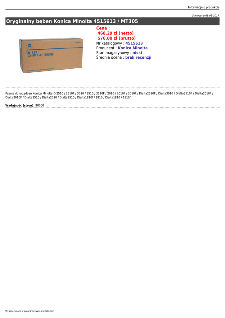 Informacje o produkcie Utworzono 08-03-2017 Oryginalny bęben Konica Minolta 4515613 / MT305 Cena : 468,29 zł (netto) 576,00 zł (brutto) Nr katalogowy : 4515613 Producent : Konica Minolta Stan magazynowy : niski Średnia ocena : brak recenzji Pasuje do urządzeń Konica Minolta DI2510 / 2510F / 3010 / 3510 / 3510F / 2010 / 2010F / 3010F / Dialta2510F / Dialta3010 / Dialta3510F / Dialta2010F / Dialta3010F / Dialta3510 / Dialta2010 / Dialta2510 / Dialta1810f / 1810 / Dialta1810 / 1810f. Wydajność (stron): 90000 Wygenerowano w programie www.oscGold.com