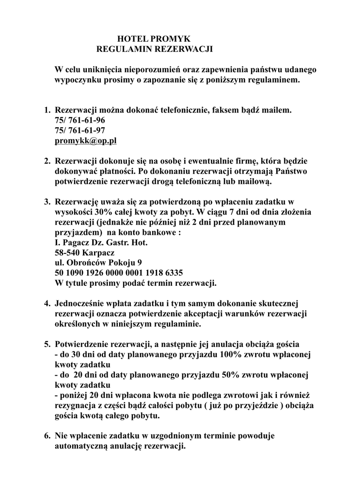 HOTEL PROMYK REGULAMIN REZERWACJI W celu uniknięcia nieporozumień oraz zapewnienia państwu udanego wypoczynku prosimy o zapoznanie się z poniższym regulaminem. 1. Rezerwacji można dokonać telefonicznie, faksem bądź mailem. 75/ 761-61-96 75/ 761-61-97 [email protected] 2. Rezerwacji dokonuje się na osobę i ewentualnie firmę, która będzie dokonywać płatności. Po dokonaniu rezerwacji otrzymają Państwo potwierdzenie rezerwacji drogą telefoniczną lub mailową. 3. Rezerwację uważa się za potwierdzoną po wpłaceniu zadatku w wysokości 30% całej kwoty za pobyt. W ciągu 7 dni od dnia złożenia rezerwacji (jednakże nie później niż 2 dni przed planowanym przyjazdem) na konto bankowe : I. Pagacz Dz. Gastr. Hot. 58-540 Karpacz ul. Obrońców Pokoju 9 50 1090 1926 0000 0001 1918 6335 W tytule prosimy podać termin rezerwacji. 4. Jednocześnie wpłata zadatku i tym samym dokonanie skutecznej rezerwacji oznacza potwierdzenie akceptacji warunków rezerwacji określonych w niniejszym regulaminie. 5. Potwierdzenie rezerwacji, a następnie jej anulacja obciąża gościa - do 30 dni od daty planowanego przyjazdu 100% zwrotu wpłaconej kwoty zadatku - do 20 dni od daty planowanego przyjazdu 50% zwrotu wpłaconej kwoty zadatku - poniżej 20 dni wpłacona kwota nie podlega zwrotowi jak i również rezygnacja z części bądź całości pobytu ( już po przyjeździe ) obciąża gościa kwotą całego pobytu. 6. Nie wpłacenie zadatku w uzgodnionym terminie powoduje automatyczną anulację rezerwacji.