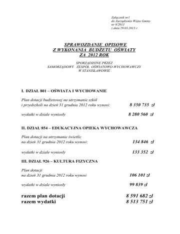 Załącznik nr1 do Zarządzenia Wójta Gminy nr 8/2013 z dnia 29.03.2013 r. SPRAWOZDANIE OPISOWE Z WYKONANIA BUDŻETU OŚWIATY ZA 2012 ROK SPORZĄDZONE PRZEZ SAMORZĄDOWY ZESPÓŁ OŚWIATOWO-WYCHOWAWCZY W STANISŁAWOWIE I. DZIAŁ 801 – OŚWIATA I WYCHOWANIE Plan dotacji budżetowej na utrzymanie szkół i przedszkoli na dzień 31 grudnia 2012 roku wynosi: 8 350 735 zł wydatki w dziale wyniosły 8 280 560 zł II. DZIAŁ 854 – EDUKACYJNA OPIEKA WYCHOWAWCZA Plan dotacji na utrzymanie świetlic na dzień 31 grudnia 2012 roku wynosi: 134 846 zł wydatki w dziale wyniosły 133 352 zł III. DZIAŁ 926 – KULTURA FIZYCZNA Plan dotacji na dzień 31 grudnia 2012 roku wynosi 106 101 zł wydatki w dziale wyniosły 99 839 zł razem plan dotacji razem wydatki 8 591 682 zł 8 513 751 zł WYDATKI WG ROZDZIAŁÓW BUDŻETOWYCH DZIAŁ 801 OŚWIATA I WYCHOWANIE ROZDZIAŁ 80101 SZKOŁY PODSTAWOWE Na plan 4 198 118 zł wykonanie wynosi 4 187 521 zł co stanowi 99,75 %. 1. § 4010, 4040, 4110, 4120, 4440 – płace oraz pochodne – plan 3 296 843 zł wykonanie wynosi 3 290 342 zł co stanowi 99,80 % w tym: Szkoła Podstawowa w Stanisławowie – 1 585 465 zł Szkoła Podstawowa w Pustelniku – 1 006 112 zł Szkoła Podstawowa w Radzyniu – 698 765 zł 2. Wydatki rzeczowe i inne: 1) § 3020 – nagrody i wydatki nie zaliczone do wynagrodzeń – plan 173 300 zł wykonanie wynosi 172 605 zł co stanowi 99,60 % (wypłata dodatków mieszkaniowych oraz wiejskich dla nauczycieli) w tym: Szkoła Podstawowa w Stanisławowie – 88 034 zł Szkoła Podstawowa w Pustelniku – 48 342 zł Szkoła Podstawowa w Ładzyniu – 36 229 zł 2) § 4210 – zakup materiałów i wyposażenia – plan 405 219 zł wykonanie 403 619 zł co stanowi 99,61 % w tym zakup opału – 325 269 zł z czego: Szkoła Podstawowa Stanisławów – zakup oleju opałowego – 136 309 zł Szkoła Podstawowa Pustelnik – zakup oleju opałowego – 166 172 zł Szkoła Podstawowa Ładzyń – zakup węgla kamiennego – 22 788 zł Szkoła Podstawowa w Stanisławowie inne wydatki na kwotę 32 823 zł w tym: materiały biurowe – 6 813 zł, środki czystości – 6 052 zł, materiały do remontów i konserwacji – 11 580 zł ( min. papa do pokrycia dachu na sali gimnastycznej, materiały na ogrodzenie terenu szkoły od strony przedszkola i inne) , odzież ochronna – 994 zł, licencje i prawa autorskie – 2 372 zł, części do ksero – 554 zł i inne. Szkoła Podstawowa w Pustelniku inne wydatki na kwotę 28 519 zł w tym: materiały biurowe – 3 392 zł, środki czystości – 5 845 zł, wyposażenie – 4 612 zł (w tym: wykładziny do klas i meble), materiały do remontów i konserwacji – 5 943 zł, odzież ochronna – 701 zł, świetlówki i zegar – 1 276 zł, licencje i prawa autorskie – 1 481 zł, akcesoria komputerowe – 619 zł, wyposażenie – 400 zł i inne. Szkoła Podstawowa w Ładzyniu inne wydatki na kwotę 17 008 zł w tym: materiały biurowe – 3 444 zł, środki czystości – 2 447 zł, materiały do remontów i konserwacji – 2 828 zł, wyposażenie – 4 513 zł (w tym: szafka, ksero, biurko, tablica, drzwi przeciwpożarowe), 1 tkanina ogrodnicza – 570 zł, wykładzina PCV do klas – 570 zł, odzież ochronna – 291 zł, akcesoria komputerowe – 342 zł i inne. 3) § 4240 – zakup pomocy naukowych i książek – plan 12 700 zł wykonanie 11 999 zł co stanowi 94,48 % (pomoce dydaktyczne oraz prenumeraty) w tym: Szkoła Podstawowa w Stanisławowie – 5 891 zł Szkoła Podstawowa w Pustelniku – 2 484 zł Szkoła Podstawowa w Ładzyniu – 3 624 zł 4) § 4260 – zakup energii – plan 123 041 zł wykonanie 123 008 zł co stanowi 99,97 % w tym: Stanisławów – 56 172 zł Pustelnik – 53 973 zł Ładzyń – 12 863 zł 5) § 4270 – zakup usług remontowych – plan 98 300 zł wykonanie 98 227 zł co stanowi 99,93 %. Szkoła Podstawowa w Stanisławowie – 10 456 zł ( w tym: wykonanie posadzek na korytarzu szkolnym). Szkoła Podstawowa w Pustelniku – 46 511 zł ( w tym: pomiary i kosztorys inwestorski pomieszczeń przeznaczonych do remontu – 1 500 zł, montaż boliera i modernizacja instalacji ciepłej wody – 3 500 zł, wymiana posadzek 16 298 zł, naprawa i instalacja c.o – 2 214 zł, malowanie klas i na korytarza szkolnego – 23 000 zł). Szkoła Podstawowa w Ładzyniu – 41 260 zł ( w tym: wykonanie elewacji i ocieplenia części budynku szkoły – 37 515 zł, kosztorys inwestorski w/w prac remontowych – 1 500 zł, inspektor nadzoru – 400 zł, rozbiórka pomieszczeń gospodarczych – 1 845 zł). 6) § 4280 – zakup usług zdrowotnych – plan 2 905 zł wykonanie 2 902 zł co stanowi 99,90 %. Szkoła Podstawowa w Stanisławowie – 516 zł Szkoła Podstawowa w Pustelniku – 1 346 zł Szkoła Podstawowa w Ładzyniu – 1 040 zł 7) § 4300 – zakup usług pozostałych – plan 68 600 zł wykonanie 67 718 zł co stanowi 98,71 % w tym: Szkoła Podstawowa w Stanisławowie – 25 359 zł z czego: monitoring obiektów szkół – 1 755 zł, usługi kominiarskie – 974 zł, obsługa BHP – 1 999 zł, opłata za zużycie wody i odprowadzanie ścieków – 7 050 zł, dowóz uczniów na konkursy i zawody sportowe – 4 215 zł, udrożnienie i czyszczenie kanalizacji - 738 zł, wywóz odpadów komunalnych – 3 144 zł, czyszczenie mat wejściowych – 1 218 zł, czyszczenie i konserwacja kotła grzewczego – 738 zł, czyszczenie wykładzin szkolnych – 1 027 zł, wymiana i konserwacja gaśnic – 510 zł, konserwacja urządzeń biurowych – 763 zł, abonament RTV – 200 zł, i inne. Szkoła Podstawowa w Pustelniku – 23 774 zł z czego: monitoring obiektów szkół – 1 041 zł; usługi kominiarskie – 784 zł; obsługa BHP – 1 999 zł, wywóz odpadów komunalnych – 1 443 zł, dowóz uczniów na konkursy i zawody sportowe – 673 zł, wykonie instrukcji przeciwpożarowej – 2 323 zł, udrożnienie i czyszczenie kanalizacji – 2 5 529 zł, czyszczenie i konserwacja kotł