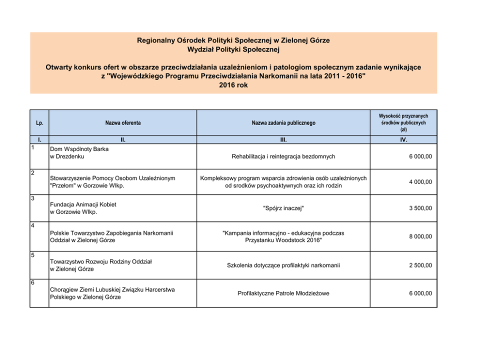 Regionalny Ośrodek Polityki Społecznej w Zielonej Górze Wydział Polityki Społecznej Otwarty konkurs ofert w obszarze przeciwdziałania uzależnieniom i patologiom społecznym zadanie wynikające z "Wojewódzkiego Programu Przeciwdziałania Narkomanii na lata 2011 - 2016" 2016 rok 1 2 Lp. Nazwa oferenta Nazwa zadania publicznego Wysokość przyznanych środków publicznych (zł) I. II. III. IV. Dom Wspólnoty Barka w Drezdenku Stowarzyszenie Pomocy Osobom Uzależnionym "Przełom" w Gorzowie Wlkp. Rehabilitacja i reintegracja bezdomnych 6 000,00 Kompleksowy program wsparcia zdrowienia osób uzależnionych od srodków psychoaktywnych oraz ich rodzin 4 000,00 "Spójrz inaczej" 3 500,00 "Kampania informacyjno - edukacyjna podczas Przystanku Woodstock 2016" 8 000,00 Szkolenia dotyczące profilaktyki narkomanii 2 500,00 Profilaktyczne Patrole Młodzieżowe 6 000,00 3 Fundacja Animacji Kobiet w Gorzowie Wlkp. 4 Polskie Towarzystwo Zapobiegania Narkomanii Oddział w Zielonej Górze 5 Towarzystwo Rozwoju Rodziny Oddział w Zielonej Górze 6 Chorągiew Ziemi Lubuskiej Związku Harcerstwa Polskiego w Zielonej Górze 7 Podnoszenie kwalifikacji osób realizujących zadania profilaktyczne z zakresu narkomanii 3 000,00 Ratajada walczy z uzależnieniami 4 000,00 V edycja Zintegrowanych działań profilaktycznych pn. "NARKOTYKI - życiowy FALSTART" 8 000,00 Fundacja "Na Nowo" w Nowej Soli "DAM RADĘ" profilaktyka selektywna i wskazująca w miejscach o zwiększonym narażeniu na kontakt z narkotykami oraz dla osób z grup ryzyka: ze środowisk zmarginalizowanych, zagrożonych demoralizacją i wykluczeniem społecznym oraz dzieci i młodzieży ze specjalnymi potrzebami edukacyjnymi 3 000,00 Fundacja Wsparcia Psychospołecznego Zielona Przystań w Łodzi "Przystanek: Zielona Przystań 2016" - konsultacje profilaktyczno terapeutyczne 3 000,00 Ogólnopolskie Stowarzyszenie "JOKER" w Nowym Dworku "Bezpieczna Impreza 2016" 5 000,00 Fundacja "NADZIEJA ŻYCIA" w Gorzowie Wlkp. Warsztaty przeciwdziałania narkotykom wśród młodzieży gimnazjalnej - Jesteśmy wolni od nałogów - edycja II 2 500,00 Polskie Towarzystwo Zapobiegania Narkomanii Oddział Terenowy w Gorzowie Wlkp. "Ster, żagle i kotwica" - program profilaktyki uzależnień realizowany w gimnazjach i szkołach ponadgimnazjalnych województwa lubuskiego 5 500,00 RAZEM: 64 000,00 Fundacja "Alternatywa" w Kostrzynie nad Odrą 8 Stowarzyszenie "Ratajada - młodzież przeciw uzależnieniom" w Strzelcach Kraj. 9 Fundacja "Contra Crimen" w Gorzowie Wlkp. 10 11 12 13 14
