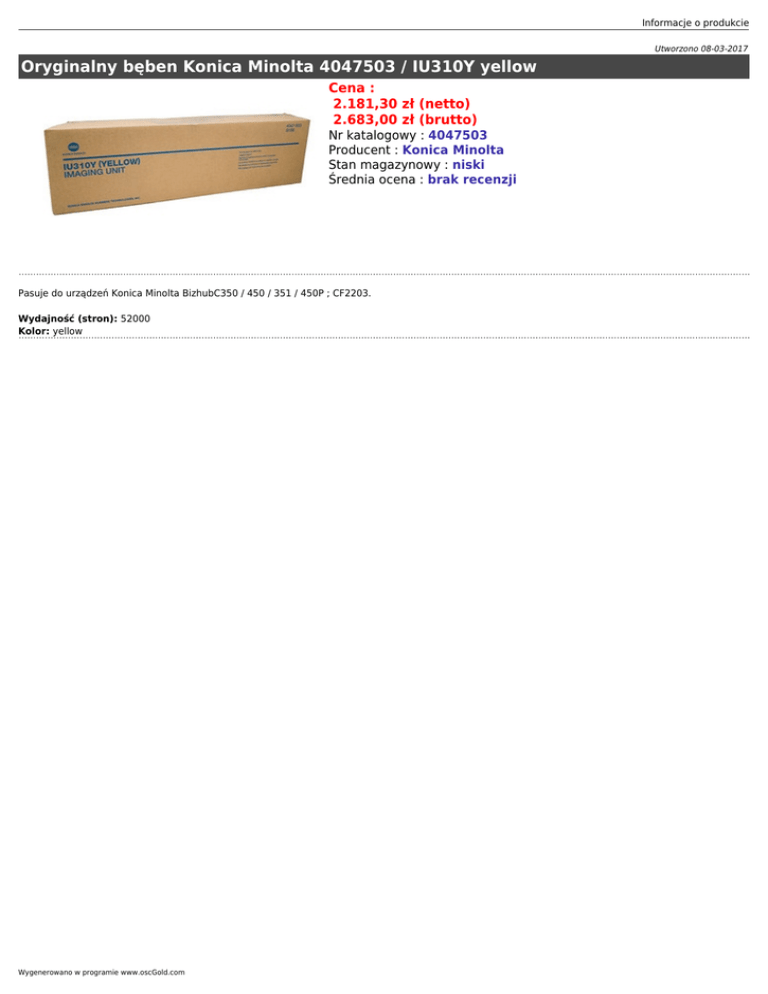 Informacje o produkcie Utworzono 08-03-2017 Oryginalny bęben Konica Minolta 4047503 / IU310Y yellow Cena : 2.181,30 zł (netto) 2.683,00 zł (brutto) Nr katalogowy : 4047503 Producent : Konica Minolta Stan magazynowy : niski Średnia ocena : brak recenzji Pasuje do urządzeń Konica Minolta BizhubC350 / 450 / 351 / 450P ; CF2203. Wydajność (stron): 52000 Kolor: yellow Wygenerowano w programie www.oscGold.com