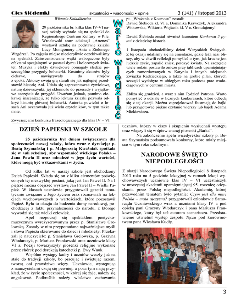 Głos Siódemki aktualności • wiadomości • opinie 3 (141) Wiktoria Koładkiewicz pt. „Wrażenia z Kosmosu” zostali: / listopad 2013 _______________________________________________________________________________________________________________________________________________________________________________________________________________________________________________________________________________________________________________________________________________________________________________________________________________________ 29 października br. kilka klas IV-VI naszej szkoły wybrało się na spektakl do Regionalnego Centrum Kultury w Pile. Wrocławski teatr edukacji „Artenes” wystawił sztukę na podstawie książki Lucy Montgomery ,,Ania z Zielonego Wzgórza". Po zajęciu miejsc niecierpliwie oczekiwaliśmy na spektakl. Zainscenizowane wątki wzbogacone były efektami specjalnymi w postaci dymu i kolorowych świateł. Muzyka i efekty dźwiękowe pomagały śledzić poszczególne przygody bohaterki. Kostuimy aktorów były ciekawe, nawiązywały do strojów z epoki. Aktorzy swoją grą starali się jak najlepiej przedstawić historię Ani. Udało się zaprezentować żywiołową naturę dziewczynki, jej skłonnośc do przesady i wyjątkowe szczęście do przygód. Uważam jednak, pomimo ciekawej inscenizacji, że tylko lektura książki pozwala odkryć historię głównej bohaterki. Autorka powieści o losach Ani oczarowała już wielu czytelników, w tym także mnie. Dawid Ślebioda kl. VI a, Dominika Krawczyk, Aleksandra Witkowska, Wiktoria Wojtasik kl. V c. Gratulujemy! Dawid Ślebioda został również laureatem Konkursu 5 pytań z dziedziny historia. 1 listopada obchodziliśmy dzień Wszystkich Świętych. Z tej okazji udaliśmy się na cmentarze, gdzie leżą nasi bliscy, aby w chwili refleksji pomyśleć o tym, jak kruche jest ludzkie życie, zapalić znicz, położyć kwiaty. Na szczęście wiele rodzin postawiło znicze przy tablicach upamiętniających zamordowanych w Katyniu i innych miejscach Związku Radzieckiego, a także na grobie pilan, których szczątki wydobyto w ubiegłym roku podczas prac wodociągowych w centrum miasta. Zbliża się grudzień, a wraz z nim Tydzień Patrona. Warto pomyśleć o udziale w licznych konkurasach, które odbędą się z tej okazji. Można zaprojektować ilustrację do bajki lub przygotować piękne czytanie wierszy lub bajek Adama Mickiewicza. Zwycięzcami konkursu frazeologicznego dla klas IV – VI DZIEŃ PAPIESKI W SZKOLE 25 października był dniem świątecznym dla społeczności naszej szkoły, która wraz z dyrekcją: p. Beatą Szymańską i p. Małgorzatą Kwaśniak spotkała się w auli szkolnej, aby wspomnieć wielkiego Polaka – Jana Pawła II oraz odnaleźć w jego życiu wartości, które mogą być wskazówkami w życiu. Od kilku lat w naszej szkole jest obchodzony Dzień Papieski. Składa się on z kilku elementów poświęconych tej niezwykłej postaci, jaką jest Jan Paweł II. Na I piętrze można obejrzeć wystawę Jan Paweł II – Wielki Papież. W klasach uczniowie przygotowali gazetki tamatycznie związane z Jego życiem oraz rozmawiali na lekcjach wychowawczych o wartościach, które pozostawił Papież. Była to okazja do budzenia dumy narodowej, pochodzącej z faktu przynależności do narodu, z którego wywodzi się tak wielki człowiek. Apel rozpoczął się spektaklem poetyckomuzycznym wyreżyserowanym przez p. Stanisławę Grelowską. Zostały w nim przypomniane najważniejsze myśli i słowa Papieża skierowane do dzieci i młodzieży. Przekazali je nauczyciele: p. Stanisława Grelowska, p. Grażyna Włodarczyk, p. Mariusz Frankowski oraz uczniowie klasy VI a. Poezji towarzyszyły piosenki religijne wykonane przez chórek pod dyrekcją katechetki p. Ewy Wnuk. Wspólne występy kadry i uczniów weszły już na stałe do tradycji szkoły, bo pracując i świętując razem, tworzą oni prawdziwe więzy. Uczniowie, występując z nauczycielami czują się pewniej, a poza tym mają przykład, że w życie społeczności, w której się żyje, należy się angażować. Podkreślić należy wlaściwe zachowanie uczniów, którzy w ciszy i skupieniu wysłuchali występu oraz włączyli się w śpiew znanej piosenki „Barka”. Na zakończenie apelu wicedyrektor szkoły p. Beata Szymańska podsumowała konkursy, które miały miejsce w tym roku szkolnym. NARODOWE ŚWIĘTO NIEPODLEGŁOŚCI Z okazji Narodowego Święta Niepodległości 8 listopada 2013 roku na 5 godzinie lekcyjnej w ramach lekcji wychowawczych uczniowie klas IV – VI uczestniczyli w uroczystej akademii upamiętniającej 95. rocznicę odzyskania przez Polskę niepodległości. Akademię, której przewodnim tematem było pytanie: Czym jest dla mnie Polska – moja ojczyzna? przygotowali członkowie Samorządu Uczniowskiego wraz z uczniami klasy IV a pod opieką pani Grażyny Włodarczyk i pana Mariusza Frankowskiego, który był też autorem scenariusza. Przedstawienie uświetnił występ zespołu Tęcza pod kierownictwem pana Wiesława Kudły. __________________________________________________________________________________________________________________________________________________________________________________________________________________________________________________________________________________________________________________________________________________________________________________________________________________________________________________________________________________________________________________ 3