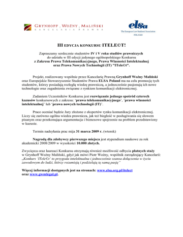 III EDYCJA KONKURSU ITELE©T! Zapraszamy serdecznie studentów IV i V roku studiów prawniczych do udziału w III edycji jedynego ogólnopolskiego Konkursu z Zakresu Prawa Telekomunikacyjnego, Prawa Własności Intelektualnej oraz Prawa Nowych Technologii (IT) "ITele©t". Projekt, realizowany wspólnie przez Kancelarię Prawną Grynhoff Woźny Maliński oraz Europejskie Stowarzyszenie Studentów Prawa ELSA Poland ma na celu promocję tych studentów, którzy posiadają rozległą wiedzę prawniczą, a jednocześnie pasjonują ich nowe technologie oraz zagadnienia związane z rynkiem komunikacji elektronicznej. Zadaniem Uczestników Konkursu jest rozwiązanie jednego spośród czterech kazusów konkursowych z zakresu: ‘prawa telekomunikacyjnego’, ‘prawa własności intelektualnej’ lub ‘prawa nowych technologii (IT)’. Prace oceniać będzie Jury złożone z ekspertów rynku komunikacji elektronicznej. Liczy się zarówno ogólna wiedza prawnicza, jak też biegłość w posługiwania się słowem pisanym oraz przekonująca argumentacja i biznesowe spojrzenie na problem przedstawiony w kazusie. Termin nadsyłania prac mija 31 marca 2009 r. (wtorek) Nagrodą dla zdobywcy pierwszego miejsca jest stypendium naukowe za rok akademicki 2008/2009 w wysokości 10.000 złotych. Zwycięzca oraz laureaci Konkursu otrzymają również możliwość odbycia płatnych staży w Grynhoff Woźny Maliński, gdyż jak mówi Piotr Woźny, wspólnik zarządzający Kancelarii: „Konkurs ‘ITele©t’ to przygoda intelektualna i jednocześnie szansa dołączenia w życiu zawodowym do ludzi, którzy rozumieją i podzielają tę samą pasję” Więcej informacji dostępnych jest na stronach: www.elsa.org.pl/itelect oraz www.gwmlegal.pl.