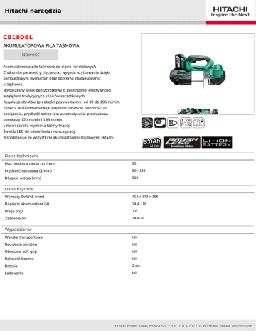 Hitachi narzędzia CB18DBL AKUMULATOROWA PIŁA TAŚMOWA Nowość Akumulatorowa piła taśmowa do cięcia rur stalowych Znakomite parametry cięcia oraz wygoda użytkowania dzięki kompaktowym wymiarom oraz dobremu zbalansowaniu urządzenia. Nowoczesny silnik bezszczotkowy o zwiększonej efektywności względem tradycyjnych silników szczotkowych Regulacja obrotów (prędkości posuwu taśmy) od 80 do 195 m/min. Funkcja AUTO dostosowuje prędkość taśmy w zależności od obciążenia, prędkość ostrza jest automatycznie przełączana pomiędzy 120 m/min i 195 m/min. Łatwa i szybka wymiana taśmy tnącej Światło LED do oświetlania miejsca pracy Współpracuje ze wszystkimi akumulatorami slajdowymi Hitachi Dane techniczne Max średnica cięcia rur (mm) 83 Prędkość obrotowa (1/min) 80 - 195 Długość ostrza (mm) 900 Dane fizyczne Wymiary DxWxS (mm) 413 x 173 x 266 Napięcie akumulatora (V) 14,4 - 18 Waga (kg) 3,6 Zasilenie (V) 14,4-18 Wyposażenie Walizka transportowa tak Regulacja obrotów tak Obudowa soft grip tak Rękojeść boczna tak Bateria 2 szt. Ładowarka tak Hitachi Power Tools Polska Sp. z o.o. 2013-2017 © Wszelkie prawa zastrzeżone.