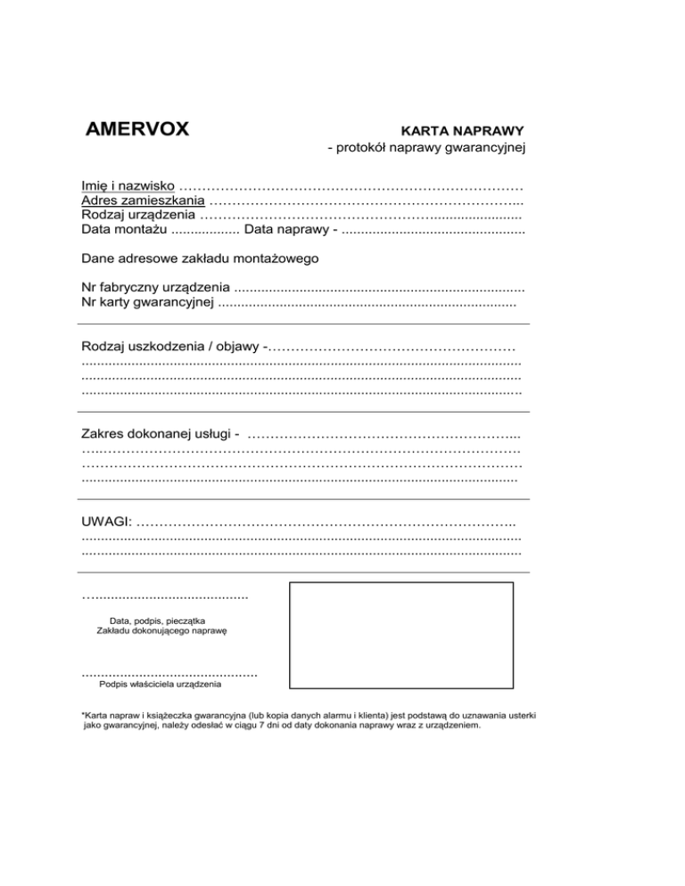 AMERVOX KARTA NAPRAWY - protokół naprawy gwarancyjnej Imię i nazwisko ………………………………………………………………… Adres zamieszkania …………………………………………………………... Rodzaj urządzenia ……………………………………………....................... Data montażu .................. Data naprawy - ................................................ Dane adresowe zakładu montażowego Nr fabryczny urządzenia ............................................................................ Nr karty gwarancyjnej .............................................................................. Rodzaj uszkodzenia / objawy -……………………………………………… ................................................................................................................... ................................................................................................................... ................................................................................................................... Zakres dokonanej usługi - …………………………………………………... …..………………………………………………………………………………. …………………………………………………………………………………… .................................................................................................................. UWAGI: ……………………………………………………………………….. ................................................................................................................... ................................................................................................................... …........................................ Data, podpis, pieczątka Zakładu dokonującego naprawę .............................................. Podpis właściciela urządzenia *Karta napraw i książeczka gwarancyjna (lub kopia danych alarmu i klienta) jest podstawą do uznawania usterki jako gwarancyjnej, należy odesłać w ciągu 7 dni od daty dokonania naprawy wraz z urządzeniem.