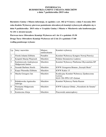 INFORMACJA BURMISTRZA GMINY I MIASTA MIECHÓW z dnia 7 października 2015 roku Burmistrz Gminy i Miasta informuje, że zgodnie z art. 182 § 9 Ustawy z dnia 5 stycznia 2011 roku Kodeks Wyborczy pierwsze posiedzenie obwodowych komisji wyborczych odbędzie się w dniu 9 października 2015 roku w Urzędzie Gminy i Miasta w Miechowie sala konferencyjna Nr 251 w dwóch turach: Pierwsza tura: Obwodowe Komisje Wyborcze od 1 do 11 o godzinie 15:30 Druga Tura: Obwodowe Komisje Wyborcze od 12 do 23 o godzinie 17:00 według poniższego wykazu: Lp. Imię i nazwisko Miejsce zamieszkania Komitet wyborczy 1 Florek Jolanta Elżbieta Poradów Komitet Wyborczy Kongres Nowej Prawicy 2 Książek Maciej Wojciech Miechów Polskie Stronnictwo Ludowe 3 Kaźmierczyk-Andryjiszyn Małgorzata Janina Miechów Komitet Wyborczy Platforma Obywatelska RP 4 Szostak Barbara Józefa Miechów KWW Grzegorza Brauna „Szczęść Boże” 5 Kopyt Weronika Elżbieta Miechów KWW Kukiz 15 6 Mucha Grzegorz Jan Miechów Koalicyjny Komitet Wyborczy Zjednoczona Lewica SLD+TR+PPS+UP+Zieloni 7 Robakowska Agnieszka Jadwiga Miechów Komitet Wyborczy Partia Razem 8 Pieniężna Małgorzata Krystyna Miechów KWW Łukasza Gibały „Niezależni do Senatu” 9 Konieczna Alicja Miechów Pracownik samorządowy Gmina Miechów Obwodowa Komisja Wyborcza Nr 2 Adres: Przedszkole Samorządowe Nr 2 – ul. Jagiellońska 34, 32-200 Miechów Lp Imię i Nazwisko Miejsce zamieszkania Komitet Wyborczy 1 Mucha Dorota Maria Podmiejska Wola Komitet Wyborczy Kongres Nowej Prawicy 2 Broda Marta Bożena Miechów Polskie Stronnictwo Ludowe 3 Żak Joanna Małgorzata Miechów KWW Grzegorza Brauna „Szczęść Boże” 4 Szymanek Monika Magdalena Miechów KWW Kukiz 15 5 Oleksy Hubert 6 Morawska Monika Anna Miechów Komitet Wyborczy Partia Razem 7 Świerczek Agnieszka Miechów Komitet Wyborczy Prawo i Sprawiedliwość 8 Wilk-Białek Magdalena Miechów KWW Łukasza Gibały „Niezależni do Senatu” 9 Dźwigała Katarzyna Miechów Pracownik samorządowy Koalicyjny Komitet Wyborczy Zjednoczona Lewica SLD+TR+PPS+UP+Zieloni Gmina Miechów Obwodowa Komisja Wyborcza Nr 3 Adres: Centrum Kultury i Sportu, Dom Kultury – ul. Racławicka 10, 32-200 Miechów Lp Imię i Nazwisko Miejsce zamieszkania Komitet wyborczy 1 Duda Rafał Piotr Miechów Komitet Wyborczy Kongres Nowej Prawicy 2 Rzemieniec Danuta Halina Miechów Komitet Wyborczy Platforma Obywatelska RP 3 Dziób Justyna Paulina Miechów KWW Grzegorza Brauna „Szczęść Boże” 4 Dziura Grzegorz Miechów KWW Kukiz 15 5 Wachacki Andrzej Janusz Miechów Koalicyjny Komitet Wyborczy Zjednoczona Lewica SLD+TR+PPS+UP+Zieloni 6 Włodarczyk Grażyna Miechów Franciszka Komitet Wyborczy Partia Razem 7 Danek Wojciech Jerzy Miechów Komitet Wyborczy Prawo i Sprawiedliwość 8 Kuchna Anna Miechów KWW Łukasza Gibały „Niezależni do Senatu” 9 Nowak Zbigniew Miechów Pracownik samorządowy Gmina Miechów Obwodowa Komisja Wyborcza Nr 4 Adres: Przedszkole Samorządowe Nr 1 im. J.Porazińskiej – ul. Powstańców 1863r. 13, 32-200 Miechów Lp Imię i Nazwisko Miejsce zamieszkania Komitet wyborczy 1 Trojańska Dorota Maria Miechów Komitet Wyborczy Kongres Nowej Prawicy 2 Bugaj Agnieszka Katarzyna Miechów Komitet Wyborczy Platforma Obywatelska RP 3 Żak Aleksandra Joanna Miechów KWW Grzegorza Brauna „Szczęść Boże” 4 Łoś Katarzyna Maria Miechów KWW Kukiz 15 5 Sokół Bolesław Czesław Miechów Koalicyjny Komitet Wyborczy Zjednoczona Lewica SLD+TR+PPS+UP+Zieloni 6 Śliwa Justyna Poradów Komitet Wyborczy Partia Razem 7 Kałwa Irena Julia Miechów Komitet Wyborczy Prawo i Sprawiedliwość 8 Bijak Ewa Miechów KWW Łukasza Gibały „Niezależni do Senatu” 9 Krawczyk Anna Miechów Pracownik samorządowy Gmina Miechów Obwodowa Komisja Wyborcza Nr 5 Adres: Państwowa Szkoła Muzyczna I Stopnia im. M.K. Ogińskiego – ul. Rynek 5, 32-200 Miechów Lp Imię i Nazwisko Miejsce zamieszkania Komitet wyborczy 1 Gibek Anna Mariola KalinaLisiniec Komitet Wyborczy Kongres Nowej Prawicy 2 Michta Andrzej Norbert Podleśna Wola Polskie Stronnictwo Ludowe 3 Sobecki Mateusz Piotr Miechów Komitet Wyborczy Platforma Obywatelska RP 4 Tambor Magdalena Maria Miechów KWW Grzegorza Brauna „Szczęść Boże” 5 Filipek Piotr Stanisław Miechów KWW Kukiz 15 6 Szymanek Paweł Szymon Miechów Koalicyjny Komitet Wyborczy Zjednoczona Lewica SLD+TR+PPS+UP+Zieloni 7 Soczówka Anna Maria Miechów Komitet Wyborczy Partia Razem 8 Płatek Wojciech Miechów KWW Łukasza Gibały „Niezależni do Senatu” 9 Mandowska Agnieszka Miechów Pracownik samorządowy Gmina Miechów Obwodowa Komisja Wyborcza Nr 6 Adres: Świetlica MDK – os. XXX-lecia PRL bl. 11, 32-200 Miechów Lp Imię i Nazwisko Miejsce zamieszkania Komitet wyborczy 1 Włodarski Bartłomiej Miechów Szczepan Komitet Wyborczy Kongres Nowej Prawicy 2 Idzik Anna Beata Bukowska Wola Polskie Stronnictwo Ludowe 3 Zapart Małgorzata Maria Miechów Komitet Wyborczy Platforma Obywatelska RP 4 Pszennakowska Ewa Miechów KWW Grzegorza Brauna „Szczęść Boże” 5 Koperczak Hubert Jacek Miechów KWW Kukiz 15 6 Wilk Maria Emilia Miechów Koalicyjny Komitet Wyborczy Zjednoczona Lewica SLD+TR+PPS+UP+Zieloni 7 Król Agnieszka Miechów Komitet Wyborczy Partia Razem 8 Bogacz Joanna Miechów KWW Łukasza Gibały „Niezależni do Senatu” 9 Jędras Iwona Miechów Pracownik samorządowy Gmina Miechów Obwodowa Komisja Wyborcza Nr 7 Adres: Szkoła Podstawowa Nr 1 im. Henryka Sienkiewicza – ul. Marii Konopnickiej 13, 32-200 Miechów Lp Imię i Nazwisko Miejsce zamieszkania Komitet wyborczy 1 Łukawska Katarzyna Ewa Miechów Komitet Wyborczy Kongres Nowej Prawicy 2 Świerczek Anna Miechów Komitet Wyborczy Platforma Obywatelska RP 3 Wasik Barbara Maria Miechów KWW Grzegorza Brauna „Szczęść Boże” 4 Grabowski Ignacy Henryk Miechów KWW Kukiz 15 5 Kosobucka Barbara Brzuchania Koalicyjny Komitet Wyborczy Zjednoczona Lewica SLD+TR+PPS+UP+Zieloni 6 Mikuła Monika Agnieszka Biskupice Komitet Wyborc