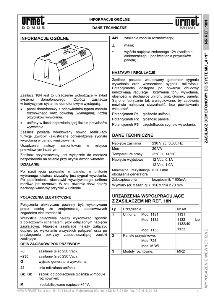 DANE TECHNICZNE INFORMACJE OGÓLNE 441 zasilanie modułu rozmównego; ⊥ masa; ~ wyjście napięcia zmiennego 12V (zasilanie elektrozaczepu, podświetlenia przycisków panela). NASTAWY I REGULACJE • panel domofonowy z odpowiednim typem modułu rozmównego oraz dowolną (wymaganą) liczbą przycisków wywołania. • unifony w ilości odpowiadającej liczbie przycisków wywołania. Zasilacz posiada wbudowany obwód realizujący funkcję „zwrotki” (akustyczne potwierdzenie sygnału wywołania w panelu wejściowym). Urządzenie należy zamontować w miejscu przewiewnym i suchym. Zasilacz przystosowany jest wyłącznie do montażu bezpośrednio na ścianie przy użyciu dwóch wkrętów. DZIAŁANIE Po naciśnięciu przycisku w panelu, w unifonie wybranego lokatora słyszalny jest sygnał wywołania. Po podniesieniu słuchawki wywoływanego unifonu możliwa jest rozmowa. W celu otwarcia drzwi należy nacisnąć właściwy przycisk w unifonie. POŁĄCZENIA ELEKTRYCZNE Połączenia elektryczne powinny być wykonywane przez osobę ze znajomością podstawowych zagadnień elektrotechniki. Wszystkie połączenia należy wykonywać zgodnie z dołączonym schematem, przy odłączonym napięciu zasilającym. Napięcie zasilające należy załączyć dopiero po wykonaniu wszystkich połączeń oraz po przykręceniu pokrywy zabezpieczającej zaciski zasilające. OPIS ZACISKÓW POD PRZEWODY ~0 ~230 G zasilanie (sieć 230 Vac), zasilanie (sieć 230 Vac), wyjście generatora wywołania; 22 linia mikrofonu unifonu; GŁ, GŁ zaciski do podłączenia głośnika w module rozmównym; M niestabilizowane napięcie +14V; DANE TECHNICZNE Napięcie zasilania Moc Temperatura pracy 230 V ac. 50/60 Hz 20 VA -5°C ÷ +45°C Napięcie wyjściowe 12 Vdc; 0,1A 12 Vac; 1,0A Minimalna rezystancja > 20 Ohm obciążenia generatora Zabezpieczenia bezpiecznik T100mA Wymiary (dł. x szer. gł.) 156 x 114 x 70 mm URZĄDZENIA WSPÓŁPRACUJĄCE Z ZASILACZEM NR REF. 18N Lp 1 2 3 Urządzenie Unifony: Mod. 1131 Mod. 1132 Mod. 1133 Panele przyciskowe: Mod. 725 Mod. MIWI Moduły rozmówne: MIWI-URMET Sp. z o.o. 91-341 Łódź ul. Pojezierska 90a tel. (42) 616-21-00 fax. (42) 616-21-13 Nr ref. 1131 1132 1132/40 1133 lub WYPOSAŻENIE WEWNĘTRZNE Zasilacz 18N jest to urządzenie wchodzące w skład systemu domofonowego. Oprócz zasilacza w tradycyjnym systemie domofonowym występują: Zasilacz posiada wbudowany generator sygnału wywołania oraz wzmacniacz sygnału mikrofonu. Potencjometry dostępne po otwarciu obudowy umożliwiają regulację brzmienia tonu wywołania, głośności w słuchawce unifonu oraz głośniku panela. Są one fabrycznie tak wyregulowane, by zapewnić możliwie najlepszą słyszalność, bez powstawania wzbudzeń. Potencjometr P1 głośność unifonu, Potencjometr P2 głośność panela, Potencjometr P3 częstotliwość sygnału wywołania. ZASILACZ DOMOFONOWY DO SYSTEMU „4+N” NR REF. 18N INFORMACJE OGÓLNE MR2 1 NR REF. 18N UKŁAD Z 1 PANELEM WYWOŁANIA PODŁĄCZENIE MOD. ROZMÓWNEGO NR REF. MR2 SCHEMATY POŁĄCZENIOWE ZASILACZ DOMOFONOWY DO SYSTEMU „4+N” SD-18N-01 UWAGA !!!: W przypadku stosowania paneli podświetlanych żarówkami, jeśli moc pobierana przez żarówki jest większa niż 6 W, należy zastosować dodatkowy transformator o odpowiedniej mocy. 2 http://www.miwiurmet.com.pl e-mail:[email protected] PODŁĄCZENIE MOD. ROZMÓWNEGO NR REF. MR2 SCHEMATY POŁĄCZENIOWE ZASILACZ DOMOFONOWY DO SYSTEMU „4+N” SD-18N-02 NR REF. 18N UKŁAD Z 1 PANELEM WYWOŁANIA UWAGA !!!: W przypadku stosowania paneli podświetlanych żarówkami, jeśli moc pobierana przez żarówki jest większa niż 6 W, należy zastosować dodatkowy transformator o odpowiedniej mocy. MIWI-URMET Sp. z o.o. 91-341 Łódź ul. Pojezierska 90a tel. (42) 616-21-00 fax. (42) 616-21-13 3 NR REF. 18N UKŁAD Z 4 PANELAMI WYWOŁANIA PODŁĄCZENIE MOD. ROZMÓWNEGO NR REF. MR2 SCHEMATY POŁĄCZENIOWE ZASILACZ DOMOFONOWY DO SYSTEMU „4+N” SD-18N-04 UWAGA !!!: W przypadku stosowania paneli podświetlanych żarówkami, jeśli moc pobierana przez żarówki jest większa niż 6 W, należy zastosować dodatkowy transformator o odpowiedniej mocy. 4 http://www.miwiurmet.com.pl e-mail:[email protected]