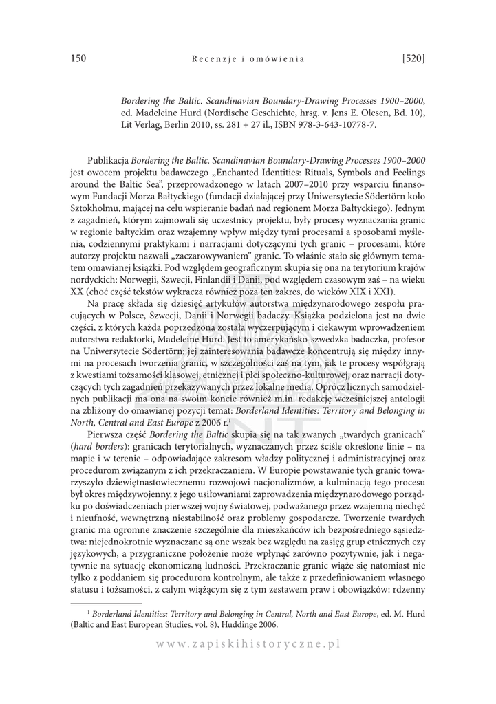 150 Recenzje i omówienia [520] Bordering the Baltic. Scandinavian Boundary-Drawing Processes 1900–2000, ed. Madeleine Hurd (Nordische Geschichte, hrsg. v. Jens E. Olesen, Bd. 10), Lit Verlag, Berlin 2010, ss. 281 + 27 il., ISBN 978-3-643-10778-7. Publikacja Bordering the Baltic. Scandinavian Boundary-Drawing Processes 1900–2000 jest owocem projektu badawczego „Enchanted Identities: Rituals, Symbols and Feelings around the Baltic Sea”, przeprowadzonego w latach 2007–2010 przy wsparciu finansowym Fundacji Morza Bałtyckiego (fundacji działającej przy Uniwersytecie Södertörn koło Sztokholmu, mającej na celu wspieranie badań nad regionem Morza Bałtyckiego). Jednym z zagadnień, którym zajmowali się uczestnicy projektu, były procesy wyznaczania granic w regionie bałtyckim oraz wzajemny wpływ między tymi procesami a sposobami myślenia, codziennymi praktykami i narracjami dotyczącymi tych granic – procesami, które autorzy projektu nazwali „zaczarowywaniem” granic. To właśnie stało się głównym tematem omawianej książki. Pod względem geograficznym skupia się ona na terytorium krajów nordyckich: Norwegii, Szwecji, Finlandii i Danii, pod względem czasowym zaś – na wieku XX (choć część tekstów wykracza również poza ten zakres, do wieków XIX i XXI). Na pracę składa się dziesięć artykułów autorstwa międzynarodowego zespołu pracujących w Polsce, Szwecji, Danii i Norwegii badaczy. Książka podzielona jest na dwie części, z których każda poprzedzona została wyczerpującym i ciekawym wprowadzeniem autorstwa redaktorki, Madeleine Hurd. Jest to amerykańsko-szwedzka badaczka, profesor na Uniwersytecie Södertörn; jej zainteresowania badawcze koncentrują się między innymi na procesach tworzenia granic, w szczególności zaś na tym, jak te procesy współgrają z kwestiami tożsamości klasowej, etnicznej i płci społeczno-kulturowej, oraz narracji dotyczących tych zagadnień przekazywanych przez lokalne media. Oprócz licznych samodzielnych publikacji ma ona na swoim koncie również m.in. redakcję wcześniejszej antologii na zbliżony do omawianej pozycji temat: Borderland Identities: Territory and Belonging in North, Central and East Europe z 2006 r.1 Pierwsza część Bordering the Baltic skupia się na tak zwanych „twardych granicach” (hard borders): granicach terytorialnych, wyznaczanych przez ściśle określone linie – na mapie i w terenie – odpowiadające zakresom władzy politycznej i administracyjnej oraz procedurom związanym z ich przekraczaniem. W Europie powstawanie tych granic towarzyszyło dziewiętnastowiecznemu rozwojowi nacjonalizmów, a kulminacją tego procesu był okres międzywojenny, z jego usiłowaniami zaprowadzenia międzynarodowego porządku po doświadczeniach pierwszej wojny światowej, podważanego przez wzajemną niechęć i nieufność, wewnętrzną niestabilność oraz problemy gospodarcze. Tworzenie twardych granic ma ogromne znaczenie szczególnie dla mieszkańców ich bezpośredniego sąsiedztwa: niejednokrotnie wyznaczane są one wszak bez względu na zasięg grup etnicznych czy językowych, a przygraniczne położenie może wpłynąć zarówno pozytywnie, jak i negatywnie na sytuację ekonomiczną ludności. Przekraczanie granic wiąże się natomiast nie tylko z poddaniem się procedurom kontrolnym, ale także z przedefiniowaniem własnego statusu i tożsamości, z całym wiążącym się z tym zestawem praw i obowiązków: rdzenny 1 Borderland Identities: Territory and Belonging in Central, North and East Europe, ed. M. Hurd (Baltic and East European Studies, vol. 8), Huddinge 2006. w w w. z a p i s k i h i s t o r y c z n e . p l [521] Recenzje i omówienia 151 mieszkaniec staje się turystą lub imigrantem, język – z ojczystego obcym etc. Choć w dzisiejszych czasach globalizacji i tworzenia ponadnarodowych organizacji w rodzaju Unii Europejskiej niektóre z tych tradycyjnych granic zacierają się lub zmieniają swój charakter, zamiast nich powstają nowe (granica strefy Schengen może być tutaj dobrym przykładem), a – z drugiej strony – pamięć dawnych granic i związanych z nimi tożsamości, stereotypów oraz obaw pozostaje nadal aktualna. Region nordycki nie bywa na ogół kojarzony z problemami granic czy mniejszości. Powszechny stereotyp mówi o nim raczej jako o regionie państw pokojowo nastawionych i jednolitych etnicznie, wprawionych w rozwiązywaniu sporów za pośrednictwem negocjacji, a nie konfrontacji, a także stosunkowo zintegrowanym wewnętrznie poprzez wspólnotę kulturową oraz międzynarodową współpracę. Powstanie i umocnienie tego stereotypu było możliwe dzięki temu, że przez dużą część XIX i XX w. krajom nordyckim udawało się zachowywać neutralność i pozostawać na uboczu konfliktów dotykających resztę Europy, a szczególnie w okresie zimnej wojny, kiedy to obrały tak zwaną „trzecią drogę” między komunizmem a kapitalizmem w czystej postaci. Jednak, jak to zwykle ze stereotypami bywa, jest on tylko częściowo zgodny z prawdą. Na przykład konflikty między państwami nordyckimi, a także między nimi a ich sąsiadami z zewnątrz regionu były dość częste przed XIX w. – żeby wspomnieć chociażby wojny prowadzone przez Szwecję w czasie jej okresu mocarstwowego czy liczne konflikty szwedzko-duńskie. Dzisiejszy obraz państw nordyckich jako pokojowych i neutralnych wiąże się zatem z „dużą dozą historycznego zapominania” (s. 13, Editor’s Introduction M. Hurd). Szczególnie interesujące w pierwszej części antologii są teksty Perttiego Joenniemiego i Steffena Werthera. Pierwszy z nich porusza kwestię stosunku między pozytywnym a negatywnym definiowaniem własnej tożsamości, na przykładzie fińskiej tradycji samookreślania się przede wszystkim przez granice, odgradzanie się od sąsiednich, dominujących państw – Szwecji i Rosji. Z tej tradycyjnej, negatywnej definicji tożsamości nar