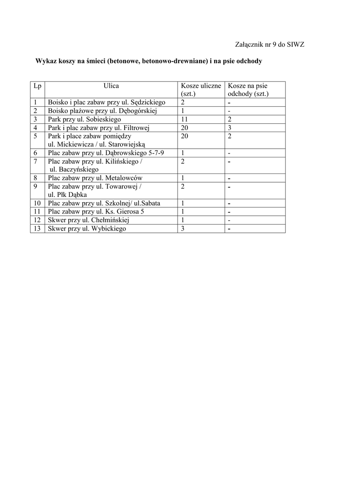 Załącznik nr 9 do SIWZ Wykaz koszy na śmieci (betonowe, betonowo-drewniane) i na psie odchody Lp 1 2 3 4 5 6 7 8 9 10 11 12 13 Ulica Boisko i plac zabaw przy ul. Sędzickiego Boisko plażowe przy ul. Dębogórskiej Park przy ul. Sobieskiego Park i plac zabaw przy ul. Filtrowej Park i place zabaw pomiędzy ul. Mickiewicza / ul. Starowiejską Plac zabaw przy ul. Dąbrowskiego 5-7-9 Plac zabaw przy ul. Kilińskiego / ul. Baczyńskiego Plac zabaw przy ul. Metalowców Plac zabaw przy ul. Towarowej / ul. Płk Dąbka Plac zabaw przy ul. Szkolnej/ ul.Sabata Plac zabaw przy ul. Ks. Gierosa 5 Skwer przy ul. Chełmińskiej Skwer przy ul. Wybickiego Kosze uliczne (szt.) 2 1 11 20 20 Kosze na psie odchody (szt.) 2 3 2 1 2 - 1 2 - 1 1 1 3 -