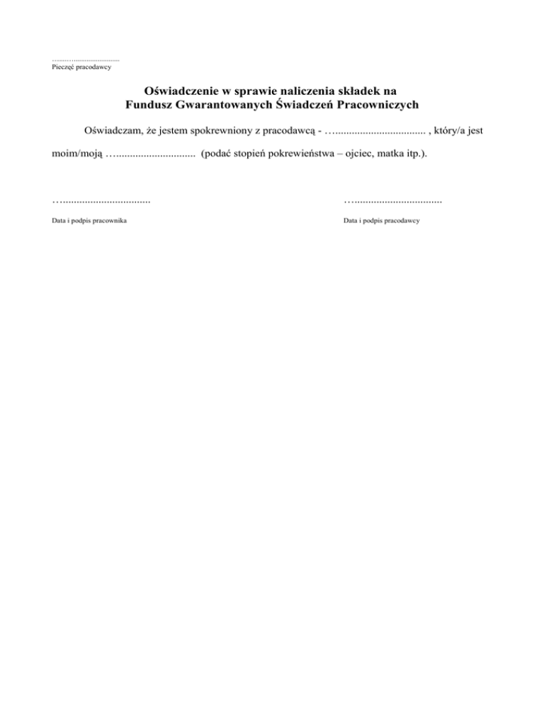 …....…......................... Pieczęć pracodawcy Oświadczenie w sprawie naliczenia składek na Fundusz Gwarantowanych Świadczeń Pracowniczych Oświadczam, że jestem spokrewniony z pracodawcą - …................................. , który/a jest moim/moją …............................. (podać stopień pokrewieństwa – ojciec, matka itp.). …................................ …................................ Data i podpis pracownika Data i podpis pracodawcy
