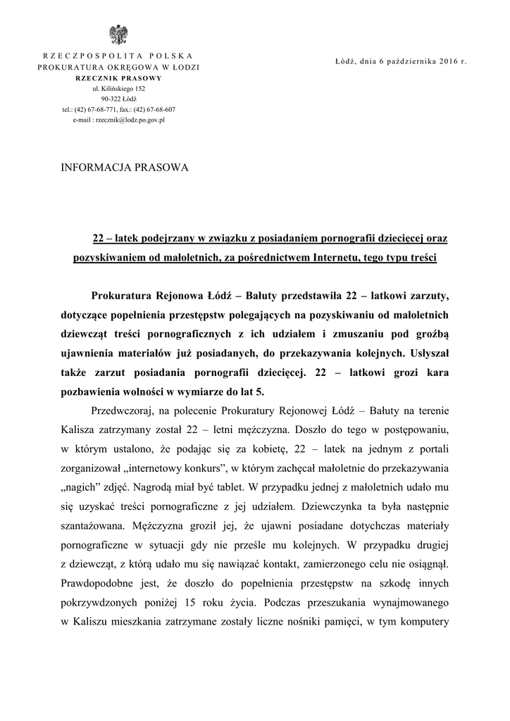 RZECZPOSPOLITA POLSKA PROKURATURA OKRĘGOWA W ŁODZI Ł ó d ź , d n i a 6 p a ź d z i e r n i ka 2 0 1 6 r . RZE CZNIK P RASOWY ul. Kilińskiego 152 90-322 Łódź tel.: (42) 67-68-771, fax.: (42) 67-68-607 e-mail : [email protected] INFORMACJA PRASOWA 22 – latek podejrzany w związku z posiadaniem pornografii dziecięcej oraz pozyskiwaniem od małoletnich, za pośrednictwem Internetu, tego typu treści Prokuratura Rejonowa Łódź – Bałuty przedstawiła 22 – latkowi zarzuty, dotyczące popełnienia przestępstw polegających na pozyskiwaniu od małoletnich dziewcząt treści pornograficznych z ich udziałem i zmuszaniu pod groźbą ujawnienia materiałów już posiadanych, do przekazywania kolejnych. Usłyszał także zarzut posiadania pornografii dziecięcej. 22 – latkowi grozi kara pozbawienia wolności w wymiarze do lat 5. Przedwczoraj, na polecenie Prokuratury Rejonowej Łódź – Bałuty na terenie Kalisza zatrzymany został 22 – letni mężczyzna. Doszło do tego w postępowaniu, w którym ustalono, że podając się za kobietę, 22 – latek na jednym z portali zorganizował „internetowy konkurs”, w którym zachęcał małoletnie do przekazywania „nagich” zdjęć. Nagrodą miał być tablet. W przypadku jednej z małoletnich udało mu się uzyskać treści pornograficzne z jej udziałem. Dziewczynka ta była następnie szantażowana. Mężczyzna groził jej, że ujawni posiadane dotychczas materiały pornograficzne w sytuacji gdy nie prześle mu kolejnych. W przypadku drugiej z dziewcząt, z którą udało mu się nawiązać kontakt, zamierzonego celu nie osiągnął. Prawdopodobne jest, że doszło do popełnienia przestępstw na szkodę innych pokrzywdzonych poniżej 15 roku życia. Podczas przeszukania wynajmowanego w Kaliszu mieszkania zatrzymane zostały liczne nośniki pamięci, w tym komputery 2 i telefony. Wszystkie one poddane zostaną szczegółowym badaniom informatycznym. Ujawniono także materiały pornograficzne z udziałem małoletnich. Dzisiaj jeszcze po przesłuchaniu prokurator podejmie decyzję, co do środków zapobiegawczych. Prawdopodobne jest skierowanie wniosku o tymczasowe aresztowanie 22 – latka. Rzecznik Prasowy Prokuratury Okręgowej w Łodzi Krzysztof Kopania
