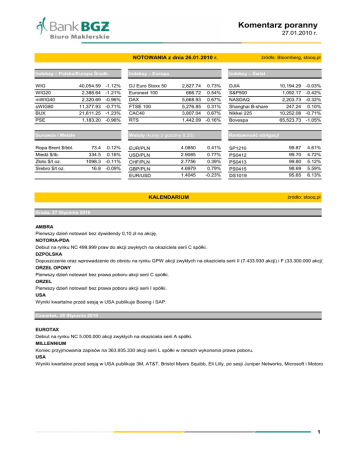 Komentarz poranny 27.01.2010 r. NOTOWANIA z dnia 26.01.2010 r. Indeksy – Polska/Europa Środk. Indeksy – Europa WIG DJ Euro Stoxx 50 40,054.59 -1.12% źródło: Bloomberg, stooq.pl Indeksy – Świat 2,827.74 0.73% DJIA 666.72 0.54% S&P500 1,092.17 -0.42% DAX 5,668.93 0.67% NASDAQ 2,203.73 -0.32% 11,377.93 -0.71% FTSE 100 5,276.85 0.31% Shanghai B-share BUX 21,611.25 -1.23% CAC40 3,807.04 0.67% Nikkei 225 10,252.08 -0.71% PSE 1,183.20 -0.96% RTS 1,442.09 -0.16% Bovespa 65,523.73 -1.05% WIG20 2,388.64 -1.21% Euronext 100 mWIG40 2,320.69 -0.96% sWIG80 Surowce / Metale Waluty (kursy z godziny 8.25) Ropa Brent $/bbl. Miedź $/lb. Złoto $/t oz. 10,194.29 -0.03% 247.24 0.10% Rentowność obligacji 73.4 0.12% EUR/PLN 4.0850 0.41% SP1210 99.87 4.61% 334.5 0.16% USD/PLN 2.9085 0.77% PS0412 99.70 4.72% 1098.3 -0.11% CHF/PLN 2.7756 0.39% PS0413 99.80 5.12% GBP/PLN 4.6979 0.79% PS0415 98.69 5.59% EUR/USD 1.4045 -0.23% DS1019 95.65 6.13% Srebro $/t oz. 16.8 -0.09% KALENDARIUM źródło: stooq.pl Środa, 27 Stycznia 2010 AMBRA Pierwszy dzień notowań bez dywidendy 0,10 zł na akcję. NOTORIA-PDA Debiut na rynku NC 499.999 praw do akcji zwykłych na okaziciela serii C spółki. DZPOLSKA Dopuszczenie oraz wprowadzenie do obrotu na rynku GPW akcji zwykłych na okaziciela serii II (7.433.930 akcji) i F (33.300.000 akcji). ORZEŁ OPONY Pierwszy dzień notowań bez prawa poboru akcji serii C spółki. ORZEL Pierwszy dzień notowań bez prawa poboru akcji serii I spółki. USA Wyniki kwartalne przed sesją w USA publikuje Boeing i SAP. Czwartek, 28 Stycznia 2010 EUROTAX Debiut na rynku NC 5.000.000 akcji zwykłych na okaziciela serii A spółki. MILLENNIUM Koniec przyjmowania zapisów na 363.935.330 akcji serii L spółki w ramach wykonania prawa poboru. USA Wyniki kwartalne przed sesją w USA publikuje 3M, AT&T, Bristol Myers Squibb, Eli Lilly, po sesji Juniper Networks, Microsoft i Motorola. 1 UNIBEP Publikacja raportu rocznego za 2008 rok oraz skonsolidowanego raportu rocznego za 2008 rok. Komentarz poranny, 22.04.2009 Komentarz poranny, 27.01.2010 r. ANALIZA TECHNICZNA Marcin Lachowski WIG20 WIG20 WIG20 odbił się od dolnej linii klina zwyŜkującego i utworzył formację młota. Jest to pozytywny sygnał. Trudno jednak powiedzieć jak duŜego odbicia naleŜy się spodziewać. Teoretycznie mógłby nastąpić nawet wzrost do górnej linii formacji, ale niedawne pogorszenie sytuacji innych indeksów sugeruje większą ostroŜność. NajbliŜszym oporem jest wtorkowa luka bessy z górnym ograniczeniem na poziomie 2404,3. Jej przełamanie byłoby pozytywnym sygnałem. 2550 2550 2500 2500 2450 2450 OPÓR 2400 2350 2400 2350 WSPARCIE 2300 2300 2250 2250 2200 2200 WYKRES DZIENNY 2150 2150 SKALA ARYTMETYCZNA 2100 2100 2050 2050 2000 2000 1950 1950 1900 1900 1850 1850 1800 1800 1750 1750 1700 1700 6 July 13 20 27 3 10 August 17 24 31 7 14 September 21 28 5 12 October 19 26 2 9 16 November 23 30 7 14 December 21 28 4 11 2010 18 25 1 February mWIG40 MWIG40 2450 MWIG40 znajduje się w trendzie spadkowym i jest słabszy od WIG-u20. Nadzieję na poprawę moŜna wiązać ze wsparciem znajdującym się w okolicach 2290 wyznaczonym m. in. przez lokalny dołek z pierwszej połowy grudnia. Innych pozytywnych sygnałów nie widać. Dolny knot wtorkowej świecy to za mało, zwłaszcza Ŝe jest on krótszy od czarnego korpusu. 2450 2440 2430 2420 2410 2400 2440 2430 2420 2410 2400 WYKRES DZIENNY SKALA LOGARYTMICZNA OPÓR 2390 2380 2390 2380 2370 2360 2350 2340 2330 2370 2360 2350 2340 2330 2320 2310 2320 2310 2300 2290 2280 2270 2260 2250 2300 2290 2280 2270 2260 2250 WSPARCIE 2240 2230 2240 2230 2220 2210 2200 2190 2180 2220 2210 2200 2190 2180 2170 2160 2170 2160 2150 2140 2130 2120 2110 2150 2140 2130 2120 2110 2100 2090 2100 2090 2080 2070 2060 2050 2040 2080 2070 2060 2050 2040 Obroty 50000 50000 40000 40000 30000 30000 20000 20000 10000 10000 x10 x10 10 August 17 24 31 7 September 14 21 28 5 October 12 19 26 2 9 November 16 23 30 7 December 14 21 28 4 2010 11 18 25 1 February 2 Komentarz poranny, 22.04.2009 Komentarz poranny, 27.01.2010 r. ANALIZA TECHNICZNA Marcin Lachowski S&P500 S&P500 Zachowanie S&P500 nie potwierdza nawet krótkoterminowego optymizmu wynikającego z zachowania WIGu20. Amerykański rynek wczoraj początkowo trzymał się całkiem nieźle, ale zamknął się na minusie. Dostrzegalnego wpływu na przebieg notowań nie miał ani raport Case-Shiller o cenach nieruchomości w największych metropoliach (spadek o 5,3% rok do roku zamiast oczekiwanego spadku o 5%), ani indeks nastrojów konsumentów opublikowany przez Conference Board (55,9 pkt. zamiast oczekiwanych 53,5 pkt.). WYKRES DZIENNY SKALA ARYTMETYCZNA 1150 1150 OPÓR 1100 1100 WSPARCIE 1050 1050 1000 1000 950 950 900 900 850 850 8 15 22 29 6 July 13 20 27 3 10 August 17 24 31 8 14 September 21 28 5 12 October 19 26 2 9 16 November 23 30 7 14 December 21 28 4 11 2010 19 25 1 8 15 February DAX DAX Na wykresie DAXa powstała dość długa biała świeca zakrywająca czarny korpus z poprzedniego dnia i tym samym tworząca razem z nim pozytywną formację objęcia hossy. Ciekawe jednak czy taki sygnał powstałby, gdyby osłabienie w USA przyszło wcześniej, a nie dopiero po zamknięciu we Frankfurcie. WYKRES DZIENNY 6000 6000 SKALA ARYTMETYCZNA 5500 5500 WSPARCIE 5000 5000 4500 4500 1 8 June 15 22 29 6 July 13 20 27 3 10 August 17 24 31 7 14 September 21 28 5 12 October 19 26 2 9 16 November 23 30 7 14 December 21 4 11 2010 18 25 1 8 15 February 3 Komentarz poranny, 27.01.2010 r. ANALIZA TECHNICZNA Marcin Lachowski Crude Oil Future CRUDE OIL FUTURE Ropa znajduje się w krótkoterminowym trendzie spadkowym. W ramach tego trendu od dwóch sesji mamy małą stabilizację. Biała świeczka z poniedziałku i wczorajszy młotek to jednak trochę za mało, by tylko na tej podstawie oczekiwać większego odbicia. Większe nadzieje na wzrost wiązałbym dopiero z linią wsparcia w okolicach 72 USD/b. 85 OPÓR 85 W YKRES DZIENNY SKALA ARYTMETYCZNA 80 