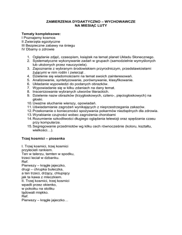 ZAMIERZENIA DYDAKTYCZNO – WYCHOWAWCZE NA MIESIĄC LUTY Tematy kompleksowe: I Poznajemy kosmos II Zwierzęta egzotyczne III Bezpieczne zabawy na śniegu IV Dbamy o zdrowie 1. Oglądanie zdjęć, czasopism, książek na temat planet Układu Słonecznego. 2. Systematyczne wykonywanie zadań w grupach (samodzielnie wymyślonych lub ułożonych przez nauczyciela). 3. Zapoznanie z wybranym środowiskiem przyrodniczym, przedstawicielami żyjącymi w nim roślin i zwierząt . 4. Dzielenie się wiadomościami na temat swoich zainteresowań. 5. Analizowanie, syntetyzowanie, porównywanie, klasyfikowanie. 6. Układanie wypowiedzi do podanych obrazków. 7. Wypowiadanie się w kilku zdaniach na dany temat. 8. Inscenizowanie wybranych utworów literackich. 9. Dzielenie nazw obrazków (trzygłoskowych, cztero-, pięciogłoskowych) na głoski. 10. Uważne słuchanie wierszy, opowiadań. 11. Uświadamianie zagrożeń wynikających z nieprzestrzegania zakazów. 12. Przekonanie o konieczności spożywania pokarmów niezbędnych dla zdrowia. 13. Wyrabianie czujności wobec zagrożenia chorobami 14. Rozumienie szkodliwości długiego oglądania telewizji oraz spędzania czasu przy komputerze. 15. Segregowanie przedmiotów wg kilku cech równocześnie (koloru, kształtu, wielkości…). Trzej kosmici – piosenka I. Trzej kosmici, trzej kosmici przylecieli rankiem. Ten w talerzu, tamten w spodku, trzeci leciał w dzbanku. Ref. Pierwszy – krągłe jajeczko, drugi – chrupka bułeczka, a ten trzeci, drżący, chlupiący jak ta kawa z mleczkiem. II. Trzej kosmici, trzej kosmici wpadli przez okienko, w pokoiku na stoliku lądowali miękko. Ref. Pierwszy – krągłe jajeczko… Cztery zielone słonie - piosenka Były raz sobie cztery słonie, Małe, wesołe, zielone słonie, Każdy z kokardką na ogonie Hej – cztery słonie. I poszły sobie w daleki świat, Daleką drogę, w wesoły świat, Hej świeci słońce, wieje wiatr, A one idą w świat. Ref. Hej! Cztery słonie, zielone słonie Każdy kokardkę ma na ogonie, Ten pyzaty, ten smarkaty, Kochają się jak wariaty! Płyną przez morza cztery słonie, Małe, wesołe, zielone słonie, Oj! Gwałtu! Rety! – Jeden tonie, Smarkaty tonie. Na pomoc biegną mu wszystkie wnet, Za trąbę ciągną go i za grzbiet, I wyciągnęły z wody go, Więc strasznie rade są. Ref. Hej! Cztery słonie, zielone słonie Każdy kokardkę ma na ogonie, Ten pyzaty, ten smarkaty, Kochają się jak wariaty! (3x) Kino w łazience- wiersz SZCZOTKA: - Jestem szczotka. TUBA: - Jestem tuba. SZCZOTKA: - Pani tuba jest za gruba. TUBA: - Jestem gruba, ale schudnę, bo to wcale nie jest trudne. SZCZOTKA: - Buzia sama się otwiera – mycie zębów będzie teraz. Będę myła zęby póty, aż umyję – w dwie minuty! KUBEK: - Teraz pora na mój występ – dam Ci trochę wody czystej. Wypłucz buzię, umyj szczotkę i piosenki zanuć szczotkę. (Na melodię „Szła dzieweczka do laseczka”) Szła szczoteczka do kubeczka, do kubeczka szła, do kubeczka szła. I cieszyła się wraz zemną jak piosenka ta. Kto zawsze, kto zawsze o zęby dba, ten uśmiech wesoły na twarzy ma.