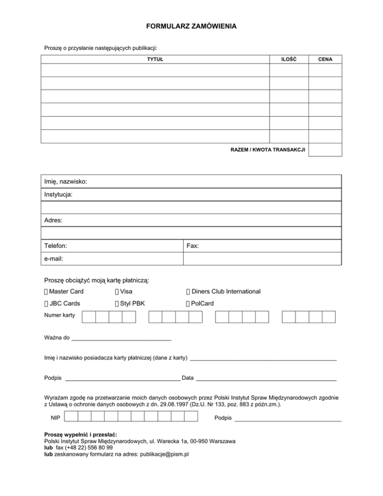 FORMULARZ ZAMÓWIENIA Proszę o przysłanie następujących publikacji: TYTUŁ ILOŚĆ CENA RAZEM / KWOTA TRANSAKCJI Imię, nazwisko: Instytucja: Adres: Telefon: Fax: e-mail: Proszę obciążyć moją kartę płatniczą: Master Card Visa Diners Club International JBC Cards Styl PBK PolCard Numer karty Ważna do ________________________________ Imię i nazwisko posiadacza karty płatniczej (dane z karty) _______________________________________________ Podpis _____________________________________ Data _____________________________________________ Wyrażam zgodę na przetwarzanie moich danych osobowych przez Polski Instytut Spraw Międzynarodowych zgodnie z Ustawą o ochronie danych osobowych z dn. 29.08.1997 (Dz.U. Nr 133, poz. 883 z późn.zm.). NIP Podpis Proszę wypełnić i przesłać: Polski Instytut Spraw Międzynarodowych, ul. Warecka 1a, 00-950 Warszawa lub fax (+48 22) 556 80 99 lub zeskanowany formularz na adres: [email protected]