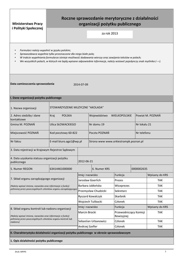 ZŽĐnjŶĞƐƉƌĂǁŽnjĚĂŶŝĞŵĞƌLJƚŽƌLJĐnjŶĞnjĚnjŝĂųĂůŶŽƑĐŝ ŽƌŐĂŶŝnjĂĐũŝƉŽǏLJƚŬƵƉƵďůŝĐnjŶĞŐŽ Ministerstwo Pracy ŝWŽůŝƚLJŬŝ^ƉŽųĞĐnjŶĞũ za rok 2013 • • • • &ŽƌŵƵůĂƌnjŶĂůĞǏLJǁLJƉĞųŶŝđǁũħnjLJŬƵƉŽůƐŬŝŵ͖ ^ƉƌĂǁŽnjĚĂǁĐĂǁLJƉĞųŶŝĂƚLJůŬŽƉƌnjĞnjŶĂĐnjŽŶĞĚůĂŶŝĞŐŽďŝĂųĞƉŽůĂ͖ tƚƌĂŬĐŝĞǁLJƉĞųŶŝĂŶŝĂĨŽƌŵƵůĂƌnjĂŝƐƚŶŝĞũĞŵŽǏůŝǁŽƑđĚŽĚĂǁĂŶŝĂǁŝĞƌƐnjLJŽƌĂnjnjĂǁŝũĂŶŝĂƚĞŬƐƚſǁǁƉŽůĂĐŚ͖ tĞǁƐnjLJƐƚŬŝĐŚƉŽůĂĐŚ͕ǁŬƚſƌLJĐŚŶŝĞďħĚČǁƉŝƐĂŶĞŽĚƉŽǁŝĞĚŶŝĞŝŶĨŽƌŵĂĐũĞ͕ŶĂůĞǏLJǁƐƚĂǁŝđƉŽũĞĚLJŶĐnjLJnjŶĂŬŵLJƑůŶŝŬĂ;ͲͲʹͿ͘ Data zamieszczenia sprawozdania 2014-07-09 /͘ĂŶĞŽƌŐĂŶŝnjĂĐũŝƉŽǏLJƚŬƵƉƵďůŝĐnjŶĞŐŽ 1. Nazwa organizacji STOWARZYSZENIE MUZYCZNE "AKOLADA" 2. Adres siedziby i dane kontaktowe Kraj 'ŵŝŶĂD͘WKEF hůŝĐĂ^BKt</'K Nr domu 19 Nr lokalu 21 DŝĞũƐĐŽǁŽƑđWKEF Kod pocztowy 60-822 WŽĐnjƚĂWKEF Nr telefonu Nr faksu E-mail [email protected] Strona www www.orkiestrampk.poznan.pl POLSKA Województwo WIELKOPOLSKIE WŽǁŝĂƚD͘WKEF ϯ͘ĂƚĂƌĞũĞƐƚƌĂĐũŝǁ<ƌĂũŽǁLJŵZĞũĞƐƚƌnjĞ^ČĚŽǁLJŵ ϰ͘ĂƚĂƵnjLJƐŬĂŶŝĂƐƚĂƚƵƐƵŽƌŐĂŶŝnjĂĐũŝƉŽǏLJƚŬƵ publicznego 5. Numer REGON 63414461000000 ϳ͘^ŬųĂĚŽƌŐĂŶƵnjĂƌnjČĚnjĂũČĐĞŐŽŽƌŐĂŶŝnjĂĐũŝ ;EĂůĞǏLJǁƉŝƐĂđŝŵŝŽŶĂ͕ŶĂnjǁŝƐŬĂŽƌĂnjŝŶĨŽƌŵĂĐũĞŽĨƵŶŬĐũŝ ƉĞųŶŝŽŶĞũƉƌnjĞnjƉŽƐnjĐnjĞŐſůŶLJĐŚĐnjųŽŶŬſǁŽƌŐĂŶƵnjĂƌnjČĚnjĂũČĐĞŐŽͿ ϴ͘^ŬųĂĚŽƌŐĂŶƵŬŽŶƚƌŽůŝůƵďŶĂĚnjŽƌƵŽƌŐĂŶŝnjĂĐũŝ ;EĂůĞǏLJǁƉŝƐĂđŝŵŝŽŶĂ͕ŶĂnjǁŝƐŬĂŽƌĂnjŝŶĨŽƌŵĂĐũĞŽĨƵŶŬĐũŝ ƉĞųŶŝŽŶĞũƉƌnjĞnjƉŽƐnjĐnjĞŐſůŶLJĐŚĐnjųŽŶŬſǁŽƌŐĂŶƵŬŽŶƚƌŽůŝůƵď nadzoru) 2012-06-21 6. Numer KRS 0000002635 /ŵŝħŝŶĂnjǁŝƐŬŽ Funkcja Wpisany do KRS :ĂƌŽƐųĂǁ'ŽĞƌůŝĐŚ Prezes TAK ĂƌďĂƌĂ:ĂďųŽŷƐŬĂ Wiceprezes TAK WƌnjĞŵLJƐųĂǁŚƵĚnjŝĐŬŝ Sekretarz TAK Ryszard Kowalczyk Skarbnik TAK Wojciech Tulibacki njųŽŶĞŬ TAK /ŵŝħŝŶĂnjǁŝƐŬŽ Funkcja Marcin Brocki WƌnjĞǁŽĚŶŝĐnjČĐLJ<ŽŵŝƐũŝ Rewizyjnej TAK Sebastian Urbanowicz njųŽŶĞŬ TAK Andrzej Szefler njųŽŶĞŬ TAK Wpisany do KRS //͘ŚĂƌĂŬƚĞƌLJƐƚLJŬĂĚnjŝĂųĂůŶŽƑĐŝŽƌŐĂŶŝnjĂĐũŝƉŽǏLJƚŬƵƉƵďůŝĐnjŶĞŐŽǁŽŬƌĞƐŝĞƐƉƌĂǁŽnjĚĂǁĐnjLJŵ ϭ͘KƉŝƐĚnjŝĂųĂůŶŽƑĐŝƉŽǏLJƚŬƵƉƵďůŝĐnjŶĞŐŽ Druk: MPiPS 1 ϭ͘ϭ͘KƉŝƐŐųſǁŶLJĐŚ ĚnjŝĂųĂŷƉŽĚũħƚLJĐŚ ƉƌnjĞnjŽƌŐĂŶŝnjĂĐũħ 1͘WƌŽƉĂŐŽǁĂŶŝĞǁƑƌſĚŵųŽĚnjŝĞǏLJŐŝŵŶĂnjũĂůŶĞũŵƵnjLJŬŝŽƌŬŝĞƐƚƌĚħƚLJĐŚ͕ŽƌĂnjnjĂĐŚħĐĂŶŝĞĚŽŽďĐŽǁĂŶŝĂ njƚČŵƵnjLJŬČƉŽƉƌnjĞnjƵĚnjŝĂųǁŬŽŶĐĞƌƚĂĐŚ͘ĂƉƌĂƐnjĂŶŝĞĚŽƵĚnjŝĂųƵǁƉƌſďĂĐŚŽƌŬŝĞƐƚƌLJͲƉƌnjLJďůŝǏĞŶŝĞ ƉƌŽĐĞƐƵƉƌĂĐLJnjŽƌŬŝĞƐƚƌČ͘ 2. Koncerty charytatywne (21.07- XV Festyn Warkocz Magdaleny, 07.09- Niebiescy Dzieciom, 11.09Dzni Domu Tramwajarza) 3͘hĚnjŝĂųǁƵƌŽĐnjLJƐƚŽƑĐŝĂĐŚWĂŷƐƚǁŽǁLJĐŚ;03.05Ͳ_ǁŝħƚŽ<ŽŶƐƚLJƚƵĐũŝ͕28.06ͲWŽnjŶĂŷƐŬŝnjĞƌǁŝĞĐ56, 11.11Ͳ_ǁŝħƚŽEŝĞƉŽĚůĞŐųŽƑĐŝͿ 4͘/ŶŶĞŬŽŶĐĞƌƚLJ;<ŽŶĐĞƌƚ<ĂƌŶĂǁĂųŽǁLJ͕<ŽŶĐĞƌƚtŝŽƐĞŶŶLJ͕<ŽŶĐĞƌƚnjŽŬĂnjũŝtŽůŶLJĐŚtLJďŽƌſǁ͕͕ ŽǏLJŶŬŝǁWŽųĂũĞǁŝĞ͕<ŽŶĐĞƌƚŶĂnjĂŬŽŷĐnjĞŶŝĞĨĞƐƚŝǁĂůƵKĨĨŝŶĞŵĂͿ 5͘/ŵƉƌĞnjLJůŽŬĂůŶĞŝnjĂŬųĂĚŽǁĞ;_ǁŝħƚŽĂŵďĞƌŬŝ͕ĂŬŽŷĐnjĞŶŝĞ<ŽŶŬƵƌƐƵDŽƚŽƌŶŝĐnjLJĐŚ͕KƚǁĂƌĐŝĞ ǁŽƌĐĂĂĐŚŽĚŶŝĞŐŽ͕DƐnjĂŝŬĂĚĞŵŝĂnjŽŬĂnjũŝƉĂƚƌŽŶŬŝ_ǁ͘<ĂƚĂƌnjLJŶLJͿ ŶĂũďůŝǏƐnjĞƐČƐŝĞĚnjƚǁŽ;ŽƐŝĞĚůĞ͕ĚnjŝĞůŶŝĐĂ͕ƐŽųĞĐƚǁŽ͕ǁŝĞƑ͕ƉƌnjLJƐŝſųĞŬͿ ϭ͘Ϯ͘ĂƐŝħŐƚĞƌLJƚŽƌŝĂůŶLJĨĂŬƚLJĐnjŶŝĞƉƌŽǁĂĚnjŽŶĞũ ƉƌnjĞnjŽƌŐĂŶŝnjĂĐũħĚnjŝĂųĂůŶŽƑĐŝƉŽǏLJƚŬƵ publicznego ;EĂůĞǏLJǁƐŬĂnjĂđũĞĚŶČůƵďǁŝħĐĞũƉŽnjLJĐũŝͿ gmina województwo kilka gmin kilka województw powiat ĐĂųLJŬƌĂũ kilka powiatów poza granicami kraju Ϯ͘/ŶĨŽƌŵĂĐũĂĚŽƚLJĐnjČĐĂůŝĐnjďLJŽĚďŝŽƌĐſǁĚnjŝĂųĂŷŽƌŐĂŶŝnjĂĐũŝƉŽǏLJƚŬƵƉƵďůŝĐnjŶĞŐŽw okresie sprawozdawczym Ϯ͘ϭ͘>ŝĐnjďĂŽĚďŝŽƌĐſǁĚnjŝĂųĂŷŽƌŐĂŶŝnjĂĐũŝ Osoby fizyczne 550 ;EĂůĞǏLJŽƐnjĂĐŽǁĂđůŝĐnjďħŽĚďŝŽƌĐſǁĚnjŝĂųĂŷŽƌŐĂŶŝnjĂĐũŝǁŽŬƌĞƐŝĞ sprawozdawczym, w podziale na osoby fizyczne i osoby prawne) Osoby prawne 0 2.2. Informacje na temat ŝŶŶLJĐŚ;ŶŝǏǁLJŵŝĞŶŝŽŶLJĐŚǁ pkt 2.1) odbiorców, na rzecz ŬƚſƌLJĐŚŽƌŐĂŶŝnjĂĐũĂĚnjŝĂųĂųĂ ;EƉ͘njǁŝĞƌnjħƚĂ͕njĂďLJƚŬŝͿ ϯ͘/ŶĨŽƌŵĂĐũĂĚŽƚLJĐnjČĐĂƉƌnjĞĚŵŝŽƚƵĚnjŝĂųĂůŶŽƑĐŝŶŝĞŽĚƉųĂƚŶĞũƉŽǏLJƚŬƵƉƵďůŝĐnjŶĞŐŽŽƌŐĂŶŝnjĂĐũŝǁŽŬƌĞƐŝĞ sprawozdawczym ϯ͘ϭ͘KƌŐĂŶŝnjĂĐũĂƉƌŽǁĂĚnjŝųĂĚnjŝĂųĂůŶŽƑđŶŝĞŽĚƉųĂƚŶČƉŽǏLJƚŬƵƉƵďůŝĐnjŶĞŐŽ 3.2. EĂůĞǏLJǁƐŬĂnjĂđŶŝĞǁŝħĐĞũŶŝǏƚƌnjLJŶĂũǁĂǏŶŝĞũƐnjĞ͕ƉŽĚ ǁnjŐůħĚĞŵǁŝĞůŬŽƑĐŝǁLJĚĂƚŬŽǁĂŶLJĐŚƑƌŽĚŬſǁ͕ƐĨĞƌLJĚnjŝĂųĂůŶŽƑĐŝ ƉŽǏLJƚŬƵƉƵďůŝĐnjŶĞŐŽ͕ŽŬƚſƌLJĐŚŵŽǁĂǁĂƌƚ͘ϰƵƐƚ͘ϭƵƐƚĂǁLJnjĚŶŝĂϮϰ ŬǁŝĞƚŶŝĂϮϬϬϯƌ͘ŽĚnjŝĂųĂůŶŽƑĐŝƉŽǏLJƚŬƵƉƵďůŝĐnjŶĞŐŽŝŽǁŽůŽŶƚĂƌŝĂĐŝĞ (Dz. U
