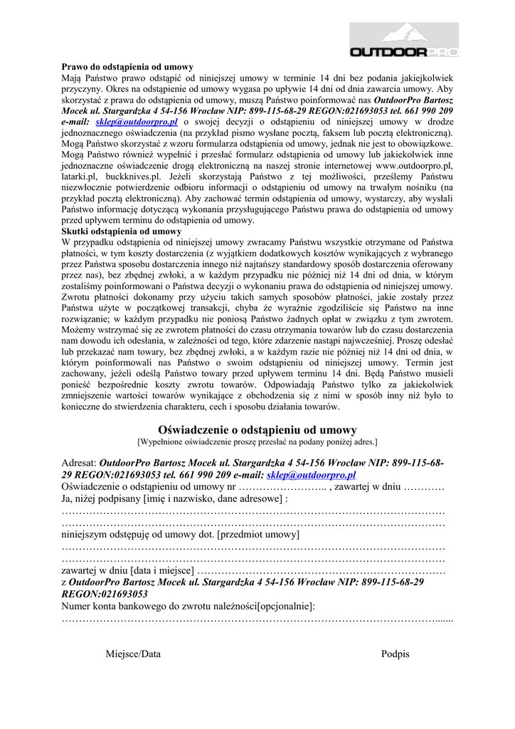Prawo do odstąpienia od umowy Mają Państwo prawo odstąpić od niniejszej umowy w terminie 14 dni bez podania jakiejkolwiek przyczyny. Okres na odstąpienie od umowy wygasa po upływie 14 dni od dnia zawarcia umowy. Aby skorzystać z prawa do odstąpienia od umowy, muszą Państwo poinformować nas OutdoorPro Bartosz Mocek ul. Stargardzka 4 54-156 Wrocław NIP: 899-115-68-29 REGON:021693053 tel. 661 990 209 e-mail: [email protected] o swojej decyzji o odstąpieniu od niniejszej umowy w drodze jednoznacznego oświadczenia (na przykład pismo wysłane pocztą, faksem lub pocztą elektroniczną). Mogą Państwo skorzystać z wzoru formularza odstąpienia od umowy, jednak nie jest to obowiązkowe. Mogą Państwo również wypełnić i przesłać formularz odstąpienia od umowy lub jakiekolwiek inne jednoznaczne oświadczenie drogą elektroniczną na naszej stronie internetowej www.outdoorpro.pl, latarki.pl, buckknives.pl. Jeżeli skorzystają Państwo z tej możliwości, prześlemy Państwu niezwłocznie potwierdzenie odbioru informacji o odstąpieniu od umowy na trwałym nośniku (na przykład pocztą elektroniczną). Aby zachować termin odstąpienia od umowy, wystarczy, aby wysłali Państwo informację dotyczącą wykonania przysługującego Państwu prawa do odstąpienia od umowy przed upływem terminu do odstąpienia od umowy. Skutki odstąpienia od umowy W przypadku odstąpienia od niniejszej umowy zwracamy Państwu wszystkie otrzymane od Państwa płatności, w tym koszty dostarczenia (z wyjątkiem dodatkowych kosztów wynikających z wybranego przez Państwa sposobu dostarczenia innego niż najtańszy standardowy sposób dostarczenia oferowany przez nas), bez zbędnej zwłoki, a w każdym przypadku nie później niż 14 dni od dnia, w którym zostaliśmy poinformowani o Państwa decyzji o wykonaniu prawa do odstąpienia od niniejszej umowy. Zwrotu płatności dokonamy przy użyciu takich samych sposobów płatności, jakie zostały przez Państwa użyte w początkowej transakcji, chyba że wyraźnie zgodziliście się Państwo na inne rozwiązanie; w każdym przypadku nie poniosą Państwo żadnych opłat w związku z tym zwrotem. Możemy wstrzymać się ze zwrotem płatności do czasu otrzymania towarów lub do czasu dostarczenia nam dowodu ich odesłania, w zależności od tego, które zdarzenie nastąpi najwcześniej. Proszę odesłać lub przekazać nam towary, bez zbędnej zwłoki, a w każdym razie nie później niż 14 dni od dnia, w którym poinformowali nas Państwo o swoim odstąpieniu od niniejszej umowy. Termin jest zachowany, jeżeli odeślą Państwo towary przed upływem terminu 14 dni. Będą Państwo musieli ponieść bezpośrednie koszty zwrotu towarów. Odpowiadają Państwo tylko za jakiekolwiek zmniejszenie wartości towarów wynikające z obchodzenia się z nimi w sposób inny niż było to konieczne do stwierdzenia charakteru, cech i sposobu działania towarów. Oświadczenie o odstąpieniu od umowy [Wypełnione oświadczenie proszę przesłać na podany poniżej adres.] Adresat: OutdoorPro Bartosz Mocek ul. Stargardzka 4 54-156 Wrocław NIP: 899-115-6829 REGON:021693053 tel. 661 990 209 e-mail: [email protected] Oświadczenie o odstąpieniu od umowy nr …………………….. , zawartej w dniu ………… Ja, niżej podpisany [imię i nazwisko, dane adresowe] : ………………………………………………………………………………………………… ………………………………………………………………………………………………… niniejszym odstępuję od umowy dot. [przedmiot umowy] ………………………………………………………………………………………………… ………………………………………………………………………………………………… zawartej w dniu [data i miejsce] ……………………………………………………………… z OutdoorPro Bartosz Mocek ul. Stargardzka 4 54-156 Wrocław NIP: 899-115-68-29 REGON:021693053 Numer konta bankowego do zwrotu należności[opcjonalnie]: ………………………………………………………………………………………………....... Miejsce/Data Podpis
