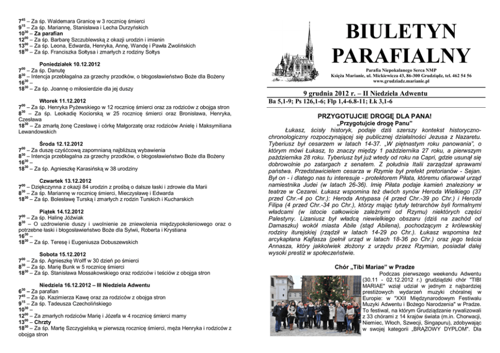 745 – Za śp. Waldemara Granicę w 3 rocznicę śmierci 915 – Za śp. Mariannę, Stanisława i Lecha Durzyńskich 1030 – Za parafian 1200 – Za śp. Barbarę Szczublewską z okazji urodzin i imienin 1300 – Za śp. Leona, Edwarda, Henryka, Annę, Wandę i Pawła Zwolińskich 1830 – Za śp. Franciszka Sołtysa i zmarłych z rodziny Sołtys Poniedziałek 10.12.2012 700 – Za śp. Danutę 830 – Intencja przebłagalna za grzechy przodków, o błogosławieństwo Boże dla Bożeny 1630 – 1830 – Za śp. Joannę o miłosierdzie dla jej duszy Wtorek 11.12.2012 700 – Za śp. Henryka Pyżewskiego w 12 rocznicę śmierci oraz za rodziców z obojga stron 830 – Za śp. Leokadię Kociorską w 25 rocznicę śmierci oraz Bronisława, Henryka, Czesława 1830 – Za zmarłą żonę Czesławę i córkę Małgorzatę oraz rodziców Anielę i Maksymiliana Lewandowskich Środa 12.12.2012 700 – Za duszę czyśćcową zapomnianą najbliższą wybawienia 830 – Intencja przebłagalna za grzechy przodków, o błogosławieństwo Boże dla Bożeny 1630 – 1830 – Za śp. Agnieszkę Karasińską w 38 urodziny Czwartek 13.12.2012 700 – Dziękczynna z okazji 84 urodzin z prośbą o dalsze łaski i zdrowie dla Marii 830 – Za śp. Mariannę w rocznicę śmierci, Mieczysławę i Edwarda 1830 – Za śp. Bolesławę Turską i zmarłych z rodzin Turskich i Kucharskich Piątek 14.12.2012 700 – Za śp. Halinę Jóźwiak 830 – O uzdrowienie duszy i uwolnienie ze zniewolenia międzypokoleniowego oraz o potrzebne łaski i błogosławieństwo Boże dla Sylwii, Roberta i Krystiana 1630 – 1830 – Za śp. Teresę i Eugeniusza Dobuszewskich Sobota 15.12.2012 700 – Za śp. Agnieszkę Wolff w 30 dzień po śmierci 830 – Za śp. Marię Bunk w 5 rocznicę śmierci 1830 – Za śp. Stanisława Mossakowskiego oraz rodziców i teściów z obojga stron Niedziela 16.12.2012 – III Niedziela Adwentu 630 – Za parafian 745 – Za śp. Kazimierza Kawę oraz za rodziców z obojga stron 915 – Za śp. Tadeusza Czecholińskiego 1030 – 1200 – Za zmarłych rodziców Marię i Józefa w 4 rocznicę śmierci mamy 1300 – Chrzty 1830 – Za śp. Martę Szczygielską w pierwszą rocznicę śmierci, męża Henryka i rodziców z obojga stron BIULETYN PARAFIALNY Parafia Niepokalanego Serca NMP Księża Marianie, ul. Mickiewicza 43, 86-300 Grudziądz, tel. 462 54 56 www.grudziadz.marianie.pl 9 grudnia 2012 r. – II Niedziela Adwentu Ba 5,1-9; Ps 126,1-6; Flp 1,4-6.8-11; Łk 3,1-6 PRZYGOTUJCIE DROGĘ DLA PANA! „Przygotujcie drogę Panu” Łukasz, ścisły historyk, podaje dziś szerszy kontekst historycznochronologiczny rozpoczynającej się publicznej działalności Jezusa z Nazaretu. Tyberiusz był cesarzem w latach 14-37. „W piętnastym roku panowania”, o którym mówi Łukasz, to znaczy między 1 października 27 roku, a pierwszym października 28 roku. Tyberiusz był już wtedy od roku na Capri, gdzie usunął się dobrowolnie po zatargach z senatem. Z południa Italii zarządzał sprawami państwa. Przedstawicielem cesarza w Rzymie był prefekt pretorianów - Sejan. Był on - i dlatego nas tu interesuje - protektorem Piłata, któremu ofiarował urząd namiestnika Judei (w latach 26-36). Imię Piłata podaje kamień znaleziony w teatrze w Cezarei. Łukasz wspomina też dwóch synów Heroda Wielkiego (37 przed Chr.-4 po Chr.): Heroda Antypasa (4 przed Chr.-39 po Chr.) i Heroda Filipa (4 przed Chr.-34 po Chr.), którzy mając tytuły tetrarchów byli formalnymi władcami (w istocie całkowicie zależnymi od Rzymu) niektórych części Palestyny. Lizaniusz był władcą niewielkiego obszaru (dziś na zachód od Damaszku) wokół miasta Abile (stąd Abilena), pochodzącym z królewskiej rodziny iturejskiej (rządził w latach 14-29 po Chr.). Łukasz wspomina też arcykapłana Kajfasza (pełnił urząd w latach 18-36 po Chr.) oraz jego teścia Annasza, który jakkolwiek złożony z urzędu przez Rzymian, posiadał dalej wysoki prestiż w społeczeństwie. Chór „Tibi Mariae” w Pradze Podczas pierwszego weekendu Adwentu (30.11 - 02.12.2012 r.) grudziądzki chór "TIBI MARIAE" wziął udział w jednym z najbardziej prestiżowych wydarzeń muzyki chóralnej w Europie: w "XXII Międzynarodowym Festiwalu Muzyki Adwentu i Bożego Narodzenia" w Pradze. To festiwal, na którym Grudziądzanie rywalizowali z 33 chórami z 14 krajów świata (m.in. Chorwacji, Niemiec, Włoch, Szwecji, Singapuru), zdobywając w swojej kategorii „BRĄZOWY DYPLOM". Dla chóru to ogromne wyróżnienie i niebywały zaszczyt móc znaleźć się w gronie najlepszych. Konkurs był oceniany przez ekspertów tworzących jury, składające się z czołowych postaci czeskiej i międzynarodowej muzyki chóralnej. Zespół „Tibi Mariae” wykonał cztery kolędy i pieśń adwentową Henryka Mikołaja Góreckiego - "Zdrowaś bądź Maryja". Oczywiście oprócz konkursowych zmagań, znalazł się też czas na zwiedzanie Pragi. Były Hradczany z kompleksem zamkowym - dawną siedzibą królów czeskich; była uroczysta zmiana warty; katedra Świętego Wita - jeden z najbardziej okazałych przykładów architektury późnego gotyku, która uważana jest za symbol duchowy państwa; był Most Karola, przecinający rzekę Wełtawę; praska starówka, gdzie chór w kościele św. Mikołaja zaprezentował się publiczności krótkim koncertem, a w kościele św. Wojciecha, prowadzonym przez księży Marianów odbyła się Msza Św. odprawiona w ich intencji. To pierwszy, chóralny wyjazd zagraniczny i pierwsza tak ważna dla nich nagroda. Oby zwiastowała kolejne, muzyczne sukcesy! religii, jakie miały miejsce zwłaszcza w XX wieku, dowodzą tego, że człowiek jest z natury otwarty na Boga: mimo ogromnych nacisków i podejmowanych starań, aby ludzie przestali wierzyć, nie można mówić o zaniku religijności. Faktem jest, iż wielu ludzi odeszło od chrześcijaństwa, ale wiarę chrześcijańską zastąpiły u nich wszelkiego rodzaju „świ