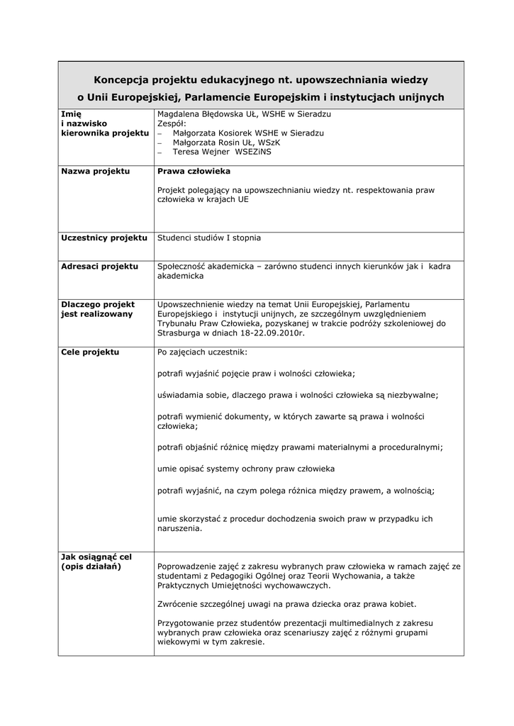 Koncepcja projektu edukacyjnego nt. upowszechniania wiedzy o Unii Europejskiej, Parlamencie Europejskim i instytucjach unijnych Imię i nazwisko kierownika projektu Magdalena Błędowska UŁ, WSHE w Sieradzu Zespół: Małgorzata Kosiorek WSHE w Sieradzu Małgorzata Rosin UŁ, WSzK Teresa Wejner WSEZiNS Nazwa projektu Prawa człowieka Projekt polegający na upowszechnianiu wiedzy nt. respektowania praw człowieka w krajach UE Uczestnicy projektu Studenci studiów I stopnia Adresaci projektu Społeczność akademicka – zarówno studenci innych kierunków jak i kadra akademicka Dlaczego projekt jest realizowany Upowszechnienie wiedzy na temat Unii Europejskiej, Parlamentu Europejskiego i instytucji unijnych, ze szczególnym uwzględnieniem Trybunału Praw Człowieka, pozyskanej w trakcie podróży szkoleniowej do Strasburga w dniach 18-22.09.2010r. Cele projektu Po zajęciach uczestnik: potrafi wyjaśnić pojęcie praw i wolności człowieka; uświadamia sobie, dlaczego prawa i wolności człowieka są niezbywalne; potrafi wymienić dokumenty, w których zawarte są prawa i wolności człowieka; potrafi objaśnić różnicę między prawami materialnymi a proceduralnymi; umie opisać systemy ochrony praw człowieka potrafi wyjaśnić, na czym polega różnica między prawem, a wolnością; umie skorzystać z procedur dochodzenia swoich praw w przypadku ich naruszenia. Jak osiągnąć cel (opis działań) Poprowadzenie zajęć z zakresu wybranych praw człowieka w ramach zajęć ze studentami z Pedagogiki Ogólnej oraz Teorii Wychowania, a także Praktycznych Umiejętności wychowawczych. Zwrócenie szczególnej uwagi na prawa dziecka oraz prawa kobiet. Przygotowanie przez studentów prezentacji multimedialnych z zakresu wybranych praw człowieka oraz scenariuszy zajęć z różnymi grupami wiekowymi w tym zakresie. Czas realizacji projektu maksymalnie do 15.01.2011r. Przewidywany efekt Zbiór prezentacji multimedialnych lub port folio (w wersji papierowej lub (rezultat) elektronicznej) Proponowana forma rozpowszechnienia Prezentacje dla grup studenckich oraz nauczycieli. Forma elektroniczna lub rezultatów papierowa. Harmonogram zrealizowanego projektu Co zostało zrealizowane? W jakim terminie? Przez kogo? Prowadzenie zajęć ze studentami Do końca listopada 2010 Dr M. Błędowska; Dr M. Kosiorek; Dr M. Rosin Dr T. Wejner Przygotowanie przez studentów prezentacji i scenariuszy Do15 grudnia 2010 Studenci różnych szkół wyższych i różnych kierunków Przygotowanie materiału do wydania Do końca grudnia 2010 Dr M. Błędowska; Dr M. Kosiorek; Dr M. Rosin Dr T. Wejner Wydanie materiału na płycie CD Do 10 stycznia 2011 Informacja o ewaluacji Projekt nie został jeszcze zakończony