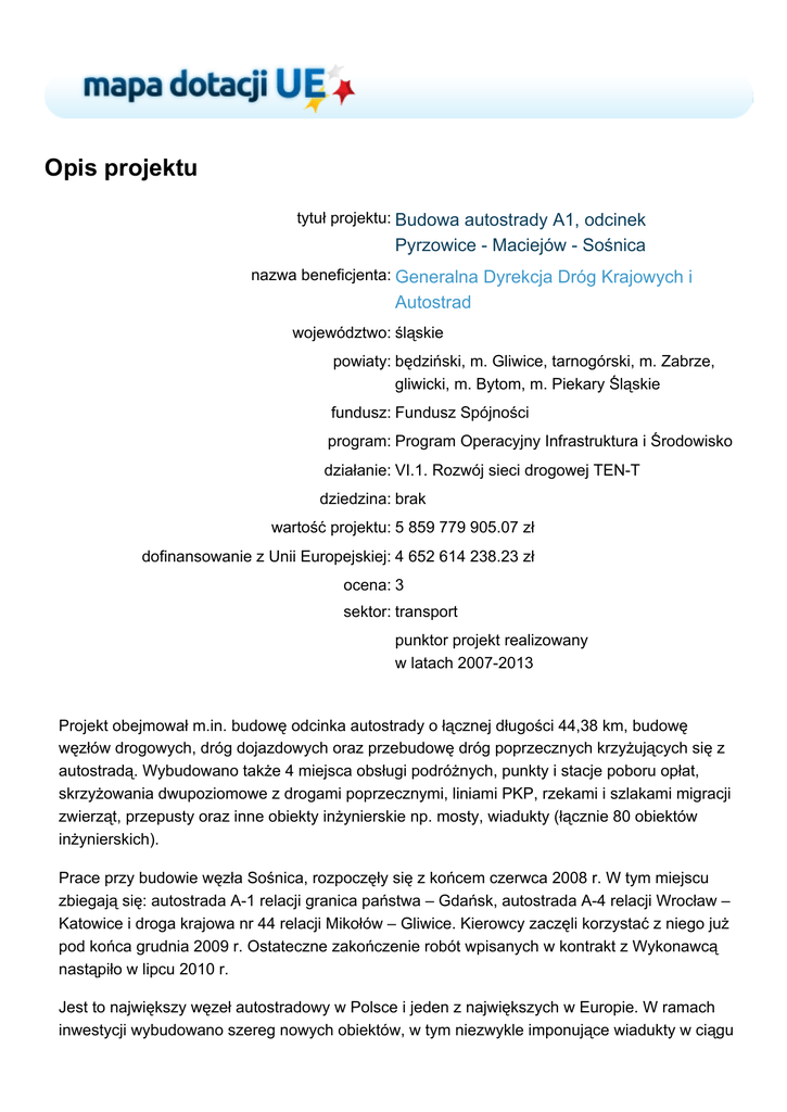 Opis projektu tytuł projektu: Budowa autostrady A1, odcinek Pyrzowice - Maciejów - Sośnica nazwa beneficjenta: Generalna Dyrekcja Dróg Krajowych i Autostrad województwo: śląskie powiaty: będziński, m. Gliwice, tarnogórski, m. Zabrze, gliwicki, m. Bytom, m. Piekary Śląskie fundusz: Fundusz Spójności program: Program Operacyjny Infrastruktura i Środowisko działanie: VI.1. Rozwój sieci drogowej TEN-T dziedzina: brak wartość projektu: 5 859 779 905.07 zł dofinansowanie z Unii Europejskiej: 4 652 614 238.23 zł ocena: 3 sektor: transport punktor projekt realizowany w latach 2007-2013 Projekt obejmował m.in. budowę odcinka autostrady o łącznej długości 44,38 km, budowę węzłów drogowych, dróg dojazdowych oraz przebudowę dróg poprzecznych krzyżujących się z autostradą. Wybudowano także 4 miejsca obsługi podróżnych, punkty i stacje poboru opłat, skrzyżowania dwupoziomowe z drogami poprzecznymi, liniami PKP, rzekami i szlakami migracji zwierząt, przepusty oraz inne obiekty inżynierskie np. mosty, wiadukty (łącznie 80 obiektów inżynierskich). Prace przy budowie węzła Sośnica, rozpoczęły się z końcem czerwca 2008 r. W tym miejscu zbiegają się: autostrada A-1 relacji granica państwa – Gdańsk, autostrada A-4 relacji Wrocław – Katowice i droga krajowa nr 44 relacji Mikołów – Gliwice. Kierowcy zaczęli korzystać z niego już pod końca grudnia 2009 r. Ostateczne zakończenie robót wpisanych w kontrakt z Wykonawcą nastąpiło w lipcu 2010 r. Jest to największy węzeł autostradowy w Polsce i jeden z największych w Europie. W ramach inwestycji wybudowano szereg nowych obiektów, w tym niezwykle imponujące wiadukty w ciągu autostrady A-1 przebiegającej nad autostradą A-4 oraz nowoczesny obiekt podwieszany z pylonem wysokości 44 m, również nad autostradą A-4. Węzeł ma trzy poziomy oraz 6 wlotów. Długość trasy autostrady A-1 w obrębie węzła wynosi 2,1 km, natomiast łączna długość wybudowanych dróg zbierająco-rozprowadzających, łącznic i dróg dojazdowych wynosi, aż 33 km. ***