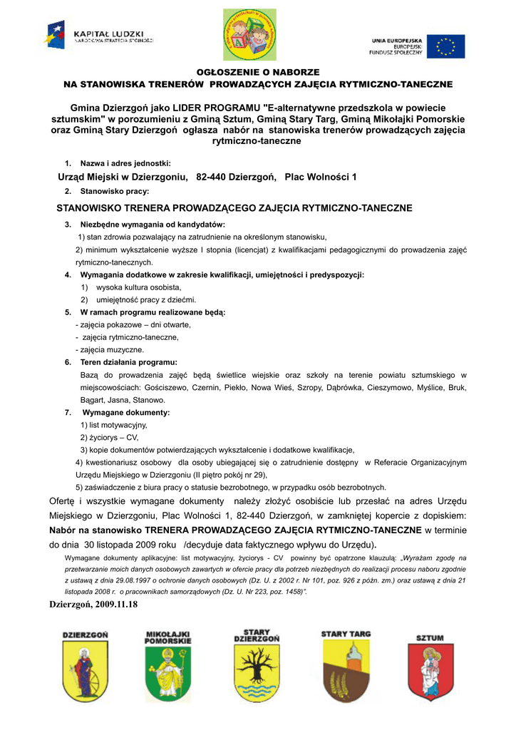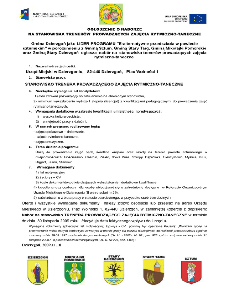 OGŁOSZENIE O NABORZE NA STANOWISKA TRENERÓW PROWADZĄCYCH ZAJĘCIA RYTMICZNO-TANECZNE Gmina Dzierzgoń jako LIDER PROGRAMU "E-alternatywne przedszkola w powiecie sztumskim" w porozumieniu z Gminą Sztum, Gminą Stary Targ, Gminą Mikołajki Pomorskie oraz Gminą Stary Dzierzgoń ogłasza nabór na stanowiska trenerów prowadzących zajęcia rytmiczno-taneczne 1. Nazwa i adres jednostki: Urząd Miejski w Dzierzgoniu, 82-440 Dzierzgoń, Plac Wolności 1 2. Stanowisko pracy: STANOWISKO TRENERA PROWADZĄCEGO ZAJĘCIA RYTMICZNO-TANECZNE 3. Niezbędne wymagania od kandydatów: 1) stan zdrowia pozwalający na zatrudnienie na określonym stanowisku, 2) minimum wykształcenie wyższe I stopnia (licencjat) z kwalifikacjami pedagogicznymi do prowadzenia zajęć rytmiczno-tanecznych. 4. 5. Wymagania dodatkowe w zakresie kwalifikacji, umiejętności i predyspozycji: 1) wysoka kultura osobista, 2) umiejętność pracy z dziećmi. W ramach programu realizowane będą: - zajęcia pokazowe – dni otwarte, - zajęcia rytmiczno-taneczne, - zajęcia muzyczne. 6. Teren działania programu: Bazą do prowadzenia zajęć będą świetlice wiejskie oraz szkoły na terenie powiatu sztumskiego w miejscowościach: Gościszewo, Czernin, Piekło, Nowa Wieś, Szropy, Dąbrówka, Cieszymowo, Myślice, Bruk, Bągart, Jasna, Stanowo. 7. Wymagane dokumenty: 1) list motywacyjny, 2) życiorys – CV, 3) kopie dokumentów potwierdzających wykształcenie i dodatkowe kwalifikacje, 4) kwestionariusz osobowy dla osoby ubiegającej się o zatrudnienie dostępny w Referacie Organizacyjnym Urzędu Miejskiego w Dzierzgoniu (II piętro pokój nr 29), 5) zaświadczenie z biura pracy o statusie bezrobotnego, w przypadku osób bezrobotnych. Ofertę i wszystkie wymagane dokumenty należy złożyć osobiście lub przesłać na adres Urzędu Miejskiego w Dzierzgoniu, Plac Wolności 1, 82-440 Dzierzgoń, w zamkniętej kopercie z dopiskiem: Nabór na stanowisko TRENERA PROWADZĄCEGO ZAJĘCIA RYTMICZNO-TANECZNE w terminie do dnia 30 listopada 2009 roku /decyduje data faktycznego wpływu do Urzędu). Wymagane dokumenty aplikacyjne: list motywacyjny, życiorys - CV powinny być opatrzone klauzulą: „Wyrażam zgodę na przetwarzanie moich danych osobowych zawartych w ofercie pracy dla potrzeb niezbędnych do realizacji procesu naboru zgodnie z ustawą z dnia 29.08.1997 o ochronie danych osobowych (Dz. U. z 2002 r. Nr 101, poz. 926 z późn. zm.) oraz ustawą z dnia 21 listopada 2008 r. o pracownikach samorządowych (Dz. U. Nr 223, poz. 1458)”. Dzierzgoń, 2009.11.18
