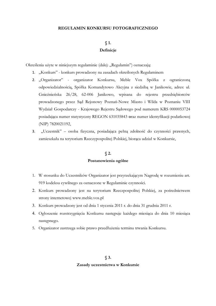 REGULAMIN KONKURSU FOTOGRAFICZNEGO § 1. Definicje Określenia użyte w niniejszym regulaminie (dalej: „Regulamin”) oznaczają: 1. „Konkurs” - konkurs prowadzony na zasadach określonych Regulaminem 2. „Organizator” - organizator Konkursu, Meble Vox Spółka z ograniczoną odpowiedzialnością, Spółka Komandytowo Akcyjna z siedzibą w Janikowie, adres: ul. Gnieźnieńska 26/28, 62-006 Janikowo, wpisana do rejestru przedsiębiorców prowadzonego przez Sąd Rejonowy Poznań-Nowe Miasto i Wilda w Poznaniu VIII Wydział Gospodarczy - Krajowego Rejestru Sądowego pod numerem KRS 0000053724 posiadająca numer statystyczny REGON 631035843 oraz numer identyfikacji podatkowej (NIP) 7820021192, 3. „Uczestnik” – osoba fizyczna, posiadająca pełną zdolność do czynności prawnych, zamieszkała na terytorium Rzeczypospolitej Polskiej, biorąca udział w Konkursie, § 2. Postanowienia ogólne 1. W stosunku do Uczestników Organizator jest przyrzekającym Nagrodę w rozumieniu art. 919 kodeksu cywilnego za oznaczone w Regulaminie czynności. 2. Konkurs prowadzony jest na terytorium Rzeczpospolitej Polskiej, za pośrednictwem strony internetowej www.meble.vox.pl 3. Konkurs prowadzony jest od dnia 1 stycznia 2011 r. do dnia 31 grudnia 2011 r. 4. Ogłoszenie rozstrzygnięcia Konkursu następuje każdego miesiąca do dnia 10 miesiąca następnego. 5. Organizator zastrzega sobie prawo przedłużenia terminu trwania Konkursu. § 3. Zasady uczestnictwa w Konkursie 1. Uczestnikami Konkursu nie mogą zostać osoby pozostające w stosunku pracy z Organizatorem oraz członkowie ich najbliższych rodzin. Przez członków najbliższej rodziny, o których mowa powyżej, rozumie się: wstępnych, zstępnych, rodzeństwo, małżonków, rodziców i rodzeństwo małżonków, osoby pozostające w stosunku przysposobienia, jak również znajdujące się pod opieką lub kuratelą. 2. Warunkiem uczestnictwa w Konkursie jest: a) przesłanie w czasie trwania konkursu zdjęć przedstawiających wnętrza, w którym znajdują się produkty zakupione w salonach sieci Meble Vox – meble i artykuły dekoracyjne b) Maksymalna wielkość jednego przesłanego zdjęcia może wynieść 400 kB. c) przesłanie wraz ze zdjęciem swoich danych osobowych: imienia i nazwiska, adresu, adresu e-mail oraz zgody na przetwarzanie swoich danych osobowych przez organizatora konkursu zgodnie z Ustawą o Ochronie Danych Osobowych. 3. Każdy Uczestnik zgłaszając się do Konkursu oświadcza, że posiada pełnię praw autorskich do zdjęcia którego użył w Konkursie. Organizator nie ponosi odpowiedzialności za naruszenie praw osób trzecich, wynikłych przez publikację takich zdjęć na stronie internetowej www.meble.vox.pl 4. Każdy Uczestnik zgłaszając się do Konkursu oświadcza, że wyraża zgodę na utrwalenie i rozpowszechnianie zdjęcia na potrzeby związane z Konkursem oraz potrzeby akcji reklamowo – promocyjnych prowadzonych przez Organizatora. § 4. Zasady i rozstrzygnięcie Konkursu 1. Konkurs polega na wysłaniu zdjęcia wnętrza, w którym znajdują się produkty sieci Meble Vox na adres mailowy [email protected] 2. Zamieszczanie zdjęć obraźliwych, propagujących przemoc, nagannych moralnie lub naruszających powszechnie uznane dobre obyczaje jest zabronione. 3. Do dnia 10 następnego miesiąca r. zgodnie z warunkami określonymi w § 3 Regulaminu Jury wybierze jedno najciekawsze zgłoszenie, którego autor otrzyma nagrodę miesiąca, która każdorazowo pokazywana jest na stronie konkursowej. 4. Każda osoba, która wyśle zdjęcia zgodnie z warunkami określonymi w § 3 Regulaminu otrzyma nagrodę pocieszenia – kadzidełka zapachowe. 5. Na stronie http://www.meble.vox.pl/zrob-zdjecie-3/co miesiąc zamieszczane są nazwiska osób, które w danym miesiącu wygrały i otrzymują nagrodę miesiąca. § 5. Nagrody oraz ich wydanie 1. Nagrodami w Konkursie są produkty z oferty Siecie Meble Vox 2. Z uwagi na fakt, iż Konkurs prowadzony jest na terenie Rzeczypospolitej Polskiej za pośrednictwem środków masowego przekazu, a nagrody w nim przewidziane nie przekraczają wartości 760 zł Zwycięzca Konkursu nie jest obowiązany jest do uiszczenia podatku z godnie z obowiązującymi w tym względzie przepisami prawa. 3. Organizator oświadcza, iż nagrody zostaną wydane, w ramach Konkursu, zgodnie z obowiązującymi przepisami prawa podatkowego. 4. Zwycięzca Konkursu zostanie w dniu rozstrzygnięcia Konkursu powiadomiony przez Organizatora o przyznaniu mu nagrody poprzez wiadomość prywatną na wskazany w zgłoszeniu adres e-mail. Do powiadomienia dołączona zostanie informacja o zobowiązaniu Zwycięzcy Konkursu do podpisania oświadczenia o przeniesieniu majątkowych praw autorskich do zdjęcia, którego wzór stanowi załącznik do niniejszego regulaminu.. 5. Nagroda zostanie przesłana indywidualnie do Zwycięzcy drogą pocztową na adres wskazany w zgłoszeniu. 6. Zwycięzcy nie przysługuje prawo żądania wymiany nagrody na ekwiwalent pieniężny, jak również nie przysługuje prawo przeniesienia na osobę trzecią roszczenia o wydanie nagrody. § 6. Wykluczenie z uczestnictwa w Konkursie Organizatorowi przysługuje prawo wykluczenia ze skutkiem natychmiastowym Uczestnika z udziału w Konkursie, jak również odmowy przyznania Uczestnikowi Nagrody w przypadku, gdy Uczestnik zamieścił zdjęcie, które obraża uczucia religijne, jest nieetyczne, obraźliwe i wulgarne lub kiedy Uczestnik podał nieprawdziwe lub niekompletne dane wymagane i niezbędne do przyznania którejkolwiek z nagród, niespełnienia postanowień niniejszego Regulaminu, a także w przypadku powzięcia informacji o działaniach sprzecznych z postanowieniami niniejszego Regulaminu. § 7. Tryb składania i rozpatrywania reklamacji 1. Wszelkie reklamacje Uczestników dotyczące przebiegu Konkursu mogą być składane przez Uczestników w terminie 14 dni od daty zaistnienia zdarzenia, którego reklamacja dotyczy. Reklamacja powinna