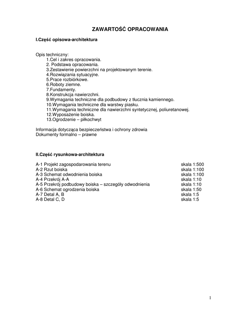 ZAWARTOŚĆ OPRACOWANIA I.Część opisowa-architektura Opis techniczny: 1.Cel i zakres opracowania. 2. Podstawa opracowania. 3.Zestawienie powierzchni na projektowanym terenie. 4.Rozwiązania sytuacyjne. 5.Prace rozbiórkowe. 6.Roboty ziemne. 7.Fundamenty. 8.Konstrukcja nawierzchni. 9.Wymagania techniczne dla podbudowy z tłucznia kamiennego. 10.Wymagania techniczne dla warstwy piasku. 11.Wymagania techniczne dla nawierzchni syntetycznej, poliuretanowej. 12.Wyposażenie boiska. 13.Ogrodzenie – piłkochwyt Informacja dotycząca bezpieczeństwa i ochrony zdrowia Dokumenty formalno – prawne II.Część rysunkowa-architektura A-1 Projekt zagospodarowania terenu A-2 Rzut boiska A-3 Schemat odwodnienia boiska A-4 Przekrój A-A A-5 Przekrój podbudowy boiska – szczegóły odwodnienia A-6 Schemat ogrodzenia boiska A-7 Detal A, B A-8 Detal C, D skala 1:500 skala 1:100 skala 1:100 skala 1:10 skala 1:10 skala 1:50 skala 1:5 skala 1:5 1 PROJEKT BUDOWLANY BOISKA ZEWNĘTRZNEGO WIELOFUNKCYJNEGO PRZY ZESPOLE SZKÓŁ PONADGIMNAZJALNYCH W OŻAROWIE MAZOWIECKIM UL. POZNAŃSKA 129/133, 05-850 OŻARÓW MAZOWIECKI I.Część opisowa-architektura 1. Cel i zakres opracowania. Celem projektu jest stworzenie boiska zewnętrznego, wielofunkcyjnego z nawierzchnią z tworzywa sztucznego o wymiarach 44,0 x22,0m przy Zespole Szkół Ponadgimnazjalnych w Ożarowie Mazowieckim przy ul. Poznańskiej 129/133, do gry w piłkę ręczną i piłkę nożną, piłkę koszykową i piłkę siatkową z oliniowaniem do piłki ręcznej, piłki koszykowej (1 stanowisko) i piłki siatkowej. Projektuje się również trybuny na 150 osób wraz z brukowanym dojściem. Projektowany obiekt spełnia funkcję dydaktyczną i jednocześnie podnosi standard szkoły. 2. Podstawa opracowania. -aktualna Mapa Sytuacyjno Wysokościowa Do Celów Projektowych wydana w 2007r. -program Inwestora. -pomiary terenu. -przepisy do gier zespołowych 3. Zestawienie powierzchni na projektowanym terenie. -powierzchnia pokryta nawierzchnią syntetyczną – 968 m2 -powierzchnia pokryta kostką polbrukową – 103,5 m2 4. Rozwiązania sytuacyjne. Teren objęty opracowaniem stanowi obecnie część kompleksu parkingowego usytuowanego bezpośrednio przed budynkiem szkoły. Średnia rzędna terenu wynosi 102,2 m n.p.m. 5. Prace rozbiórkowe. Niezbędne prace rozbiórkowe objęte są odrębnymi działaniami inwestora wykraczającymi poza zlecony zakres niniejszego projektu. 6. Roboty ziemne. Przewiduje się korytowanie podłoża na projektowaną głębokość. 7. Fundamenty. Fundament pod obrzeże betonowe z betonu B10, fundamenty piłkochwytu i fundamenty pod słupki bramek projektuje się z betonu B20. 2 8. Konstrukcja nawierzchni. Warstwy; • nawierzchnia syntetyczna poliuretanowa Conipur SP – gr. 14 mm • elastyczna podbudowa Conipur ET – gr. 35 mm • warstwa wyrównawcza z kamienia łamanego (frakcja 0- 4 mm) – gr. 5 cm • kruszywo łamane stabilizowane mech. (frakcja 4-30 mm) – gr. 20 cm • piasek zagęszczony do Id > 0,5 – gr. 10 cm • grunt rodzimy 9. Wymagania techniczne dla podbudowy z tłucznia kamiennego. Ogólne wymagania wg PN-60/S-96023.Podbudowa wykonana z kruszywa naturalnego łamanego w granicach uziarnienia 4-30mm oraz warstwa klinująca z kamienia łamanego 0-4mm. 10. Wymagania techniczne dla warstwy piasku. Wykonać wg BN-73/6774-04. 11. Wymagania techniczne dla nawierzchni syntetycznej poliuretanowej. Opis nawierzchni syntetycznej poliuretanowej „CONIPUR SP” 11.1. Charakterystyka nawierzchni: Jest to nawierzchnia sportowa, poliuretanowo-gumowa o grubości warstwy 14 mm – wersja podstawowa, wymagająca podbudowy asfaltobetonowej, betonowej lub podbudowy z mieszaniny kruszywa kwarcowego i granulatu gumowego połączonego lepiszczem poliuretanowym - CONIPUR ET Nawierzchnia ta jest przepuszczalna dla wody, o zwartej strukturze, służy do pokrywania nawierzchni bieżni lekkoatletycznych, sektorów i rozbiegów konkurencji technicznych zawodów la., boisk wielofunkcyjnych, szkolnych, placów rekreacji ruchowej. Posiada certyfikat IAAF, Atest Higieniczny PZH oraz Rekomendację ITB. Obiekty z zainstalowaną nawierzchnią o podanych parametrach uzyskały First Class IAAF Certificates. Nawierzchnia składa się z dwóch warstw elastycznej (nośnej) i użytkowej . Warstwa nośna to mieszanina granulatu gumowego i lepiszcza poliuretanowego. Układana jest mechanicznie, bezspoinowo, przy pomocy rozkładarki mas poliuretanowych (np. Planomatic). Tak wykonaną warstwę należy pokryć warstwą użytkową, którą stanowi system poliuretanowy zmieszany z granulatem EPDM. Czynność tą wykonuje się poprzez natrysk mechaniczny (przy użyciu specjalnej natryskarki np. firmy SMG). Grubość warstwy użytkowej 2-3mm. Po całkowitym związaniu mieszaniny są malowane linie farbami poliuretanowymi metodą natrysku. 3 11.1.1. Parametry nawierzchni syntetycznej poliuretanowej: Tabela nr.1 Wymagania Wymagania DIN IAAF 18035/6 przy przy +23oC przy +30oC +10oC Zmodyfikowane odkształcenie pionowe 0.6- 2.2 mm - 1.40 1.50 1.60 Redukcja siły 35-50 % - 37 37 39 ≥ 0.4 N/mm2 ≥ 0.5 N/mm2 - 0.73 - ≥ 40 % ≥ 40 % - 87 - Wodoprzepuszczalność DIN 18035/6 cm/sec Odporność na kolce DIN 18035/6 Klasa 1 DIN 51960 Klasa 1 niepalności Wytrzymałość na rozciąganie Wydłużenie przy zerwaniu Palność Poślizg : sucha /skóra - mokra/skóra DIN 18035/6 Odbicie piłki DIN 18035/6 Względna odporność na ścieranie DIN 18035/6 Max. wgłębienie pod ciężarem Wgłębienie pozostałe Odkształcenie standardowe ± 0 oC + 20 oC + 40 oC DIN 18035/6 mm DIN 18035/6 mm Starzenie (DIN 18035/6) Klimat standardowy DIN 50014 Klimat łączony (wysoka temp.,wilgotność,UV) DIN 53387 0.039 0.68 – 0.50 % 99 3.8 5.70 0.40 0.70 0.90 1.00 Wytrzymałość na rozciąganie w N/mm2 Wydłużenie przy zerwaniu w % Moduł E N/mm2 0,75 0,84 69 72 2.53 2,72 Tabela opracowana została na podstawie wyników badań nawierzchni CONIPUR SP na zgodność z normą DIN 18035/6 