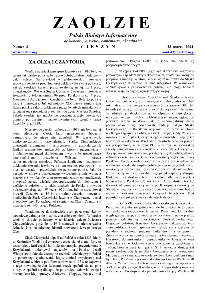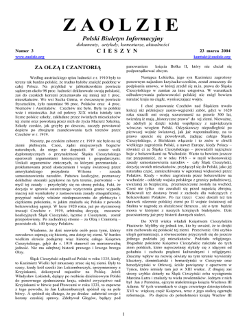 ZAOLZIE Polski Biuletyn Informacyjny dokumenty, artykuły, komentarze, aktualności C I E S Z Y N Numer 3 www.zaolzie.org 23 marca 2004 [email protected] ZA OLZĄ I CZANTORIĄ panowaniem księcia Bolka II, który nie chciał się podporządkować obcym. Według austriackiego spisu ludności z r. 1910 były to tereny tak bardzo polskie, że trudno byłoby znaleźć podobne w całej Polsce. Na przykład w jabłonkowskim powiecie sądowym około 98 proc. ludności deklarowało swoją polskość, zaś do czeskich korzeni przyznawało się mniej niż 1 proc. mieszkańców. We wsi Sucha Górna, w ówczesnym powiecie frysztackim, żyło natomiast 96 proc. Polaków oraz 4 proc. Niemców i Austriaków. Czechów nie było. Były to polskie wsie i miasteczka. Już od połowy XIX wieku istniały tam liczne polskie szkoły, zakładane przez światłych mieszkańców tej ziemi oraz powołaną przez nich do życia Macierz Szkolną. Szkoły czeskie, jak grzyby po deszczu, zaczęły powstawać dopiero po zbrojnym zaanektowaniu tych terenów przez Czechów w r. 1919. Następca Łokietka, jego syn Kazimierz zagrożony ponownym najazdem krzyżacko-czeskim, został zmuszony do podpisania umowy, w której zrzekł się m.in. prawa do Śląska Cieszyńskiego w zamian za inne ustępstwa. W warunkach odbudowywania państwowości polskiej nie mógł bowiem narażać kraju na ciągłe, wyniszczające wojny. I choć panowanie Czechów nad Śląskiem trwało krócej niż późniejszy austro-węgierski zabór, gdyż w 1620 roku stracili oni swoją suwerenność na prawie 300 lat, twierdzą iż mają „historyczne prawo” do tej ziemi. Nieważne, że zdobyli je dzięki ścisłej współpracy z największym wówczas wrogiem Polski. Odzyskawszy niepodległość po pierwszej wojnie światowej, jak już wspominaliśmy, na to prawo uparcie się powoływali, żądając całego Śląska Cieszyńskiego, z Bielskiem włącznie i to znów w chwili wielkiego zagrożenia Polski, a nawet Europy, kiedy Polacy – również ci ze Śląska Cieszyńskiego – prowadzili najcięższe boje z bolszewikami na Wschodzie. Warto tu bowiem jeszcze raz przypomnieć, że w roku 1918 – w myśl wilsonowskiej zasady samostanowienia narodów - cały Śląsk Cieszyński, decyzją swoich mieszkańców, przyłączył się do Polski, jako jej naturalna część, zamieszkiwana w ogromnej większości przez Polaków. Kiedy - wobec zagrożenia przez bolszewików na wschodzie - oddziały wojska polskiego z granicy południowej, uważanej za bezpieczną, przemieszczone zostały na wschód, Czesi nie tylko nie zawahali się przed napaścią zbrojną. Blokowali też dostawy broni z zachodu dla walczących z bolszewikami Polaków. Po raz trzeci Czesi dostali też ten skrawek rdzennie polskiej ziemi po II wojnie światowej od Stalina w nagrodę za służalczość Benesza , ale o tym będzie mowa w którymś z naszych kolejnych biuletynów. Dziś pozostaniemy już przy historii dawnych stuleci. Niestety, po czeskim zaborze z r. 1919 nie było na tej ziemi plebiscytu. Czesi, żądni miejscowych bogactw naturalnych, do niego nie dopuścili. W czasie walk dyplomatycznych o przynależność Śląska Cieszyńskiego operowali argumentami historycznymi i gospodarczymi. Unikali argumentów etnicznych, za którymi przemawiała proklamowana przed skończeniem I wojny światowej przez amerykańskiego prezydenta Wilsona zasada samostanowienia narodów. Państwa koalicyjne, poznawszy dokładnie stosunki językowe na tym terenie, pierwotnie – w myśl tej zasady – przychylały się na stronę polską. Fakt, że decyzja w sprawie ostatecznego wytyczenia granic wypadła inaczej niż wynikałoby z zastosowania zasady etnograficznej, przypisać należy właśnie niedopuszczeniu do plebiscytu i ciężkiemu położeniu, w jakim znalazła się Polska z powodu bolszewickiej agresji. W lecie 1920 roku, już po styczniowej inwazji Czechów r. 1919, arbitralną decyzją mocarstw koalicyjnych Śląsk Cieszyński, łącznie z Cieszynem, został przepołowiony. Po zachodniej stronie – za Olzą i Czantorią – pozostało ok. 140 tysięcy Polaków. Do XVII wieku władali Księstwem Cieszyńskim Piastowie. Myliłby się jednak ten, kto by uważał, że to dzięki nim zachowała się polskość tej ziemi. Przeciwnie. Oni szybko ulegli germanizacji, a równocześnie przyczynili się do jeszcze jednego podziału jej mieszkańców. Podziału religijnego. Dogodnie położone Księstwo Cieszyńskie należało do tych ziem polskich, które najwcześniej stykały się z idącymi od południa i zachodu prądami kulturalnymi i religijnymi. Znaczny wpływ na rozwój oświaty na tym terenie wywierały klasztory, dominikański i bernardyński w Cieszynie oraz benedyktyński w Orłowej, ściśle powiązany z opactwem w Tyńcu, które istniały tam już w XIII wieku:. Z drugiej zaś strony szybko dotarły na Śląsk Cieszyński echa wystąpienia Marcina Lutra i znalazły tu wielu zwolenników. Jednym z nich był Jan z Persteina, ojczym małoletniego księcia Wacława III Adama. W tych warunkach w ciągu czwartego dziesięciolecia XVI w. większą część Księstwa, wraz z jego stolicą ogarnęła reformacja. Po dojściu do pełnoletności książę Wacław III Wiadomo, że dziś niewiele osób poza tymi, którzy zawodowo zajmują się historią, zna dzieje tej ziemi. W bardzo wielkim skrócie podajemy więc historię całego Księstwa Cieszyńskiego, gdyż do r. 1919 stanowił on nierozerwalną jedność. Nie ma odrębnej historii prawego i lewego brzegu Olzy. Śląsk Cieszyński odpadł od Polski w roku 1335, kiedy to Kazimierz Wielki był zmuszony zrzec się tej ziemi. Były to czasy, kiedy król czeski Jan Luksemburczyk, sprzymierzony z Krzyżakami, dokonywał najazdów na Polskę. Jeżeli Władysław Łokietek, dążący po rozbiciu dzielnicowym Polski do ponownego zjednoczenia kraju, odniósł zwycięstwo nad Krzyżakami w bitwie pod Płowcami w roku 1331, to zapewne z tego powodu, że Jan Lu