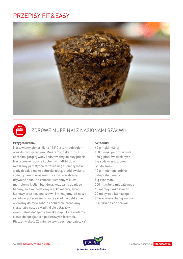 PRZEPISY FIT&EASY ZDROWE MUFFINKI Z NASIONAMI SZAŁWII Przygotowanie: Nastawiamy piekarnik na 176°C z termoobiegiem oraz dolnym grzaniem. Mieszamy mąkę z lnu z odrobiną gorącej wody i odstawiamy do ostygnięcia. Następnie w robocie kuchennym MUM Bosch mieszamy przestygniętą zawiesinę z lnianej mąki i wody dodając mąkę pełnoziarnistą, płatki owsiane, sodę, cynamon oraz imbir i całość wyrabiamy używając haka. Na robocie kuchennym MUM montujemy kielich blendera, wrzucamy do niego banany, mleko, dodajemy olej kokosowy, syrop klonowy oraz nasiona szałwii i miksujemy, aż nasze składniki połączą się. Płynne składniki delikatnie wlewamy do misy robota i delikatnie zarabiamy ciasto, aby nasze składniki się połączyły – ewentualnie dodajemy troszkę mąki. Przekładamy ciasto do specjalnych papierowych foremek. Pieczemy około 25 min. do tzw. „suchego patyczka”. AUTOR: SYLWIA WIESENBERG Składniki: 40 g mąki lnianej 400 g mąki pełnoziarnistej 150 g płatków owsianych 5 g sody oczyszczonej Sól do smaku 10 g mielonego imbiru 3 dojrzałe banany 5 g cynamonu 300 ml mleka migdałowego 60 ml oleju kokosowego 20 ml syropu klonowego 2 laski wyskrobanej wanilii 3-4 łyżki nasion szałwii Pobrano z serwisu: fitandeasy.pl